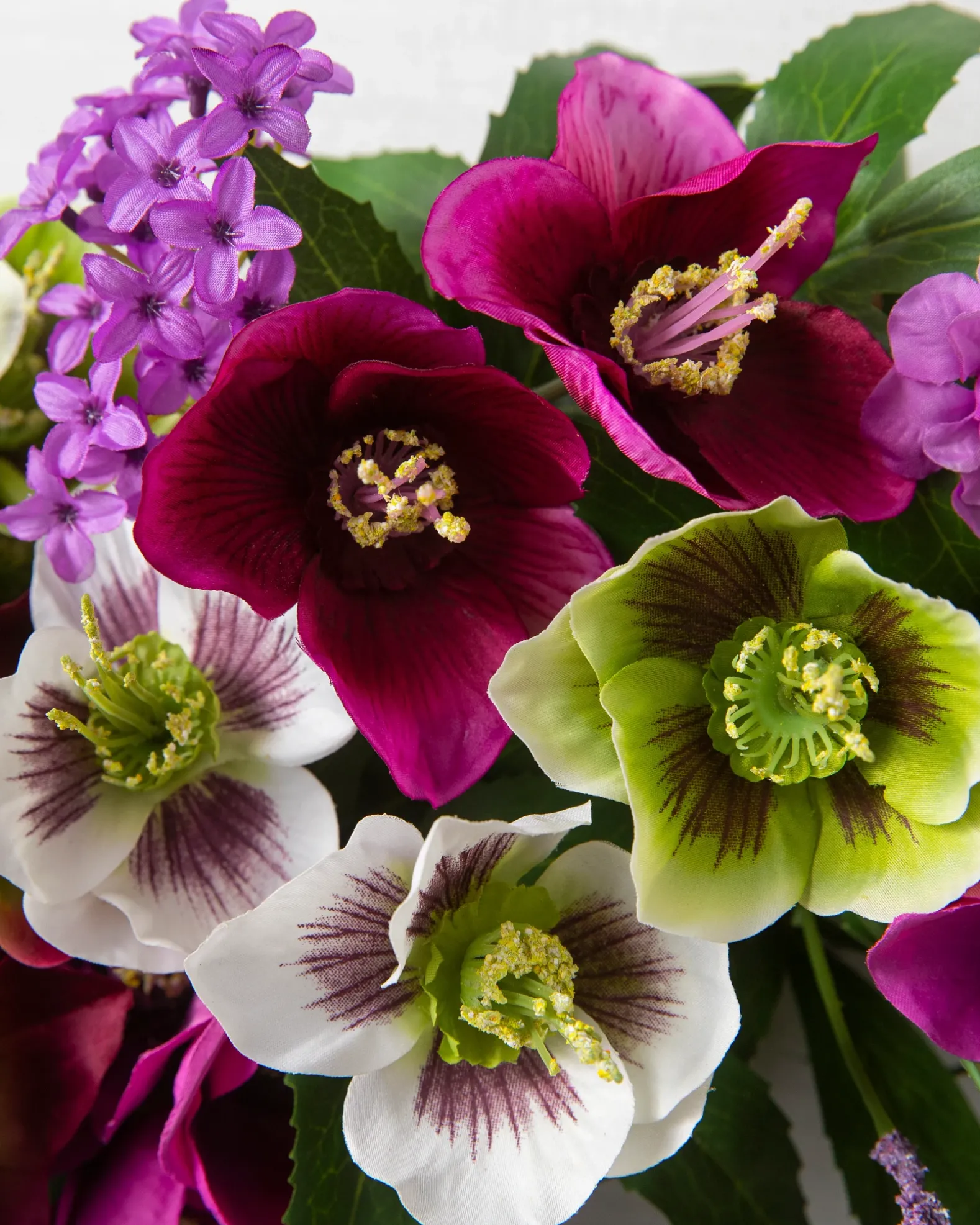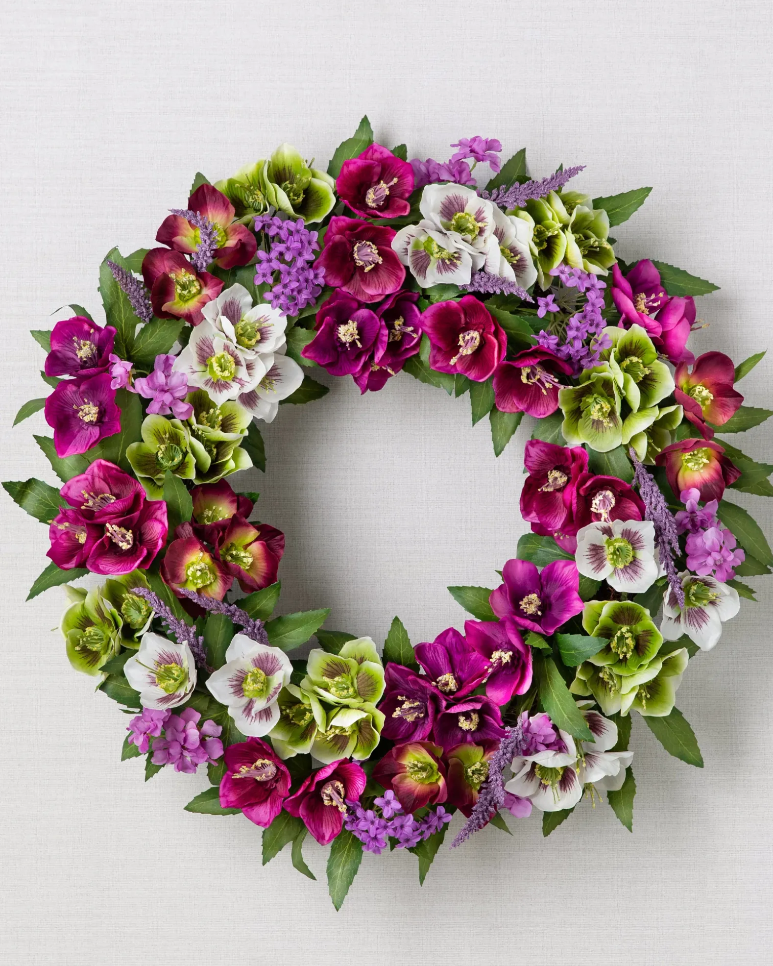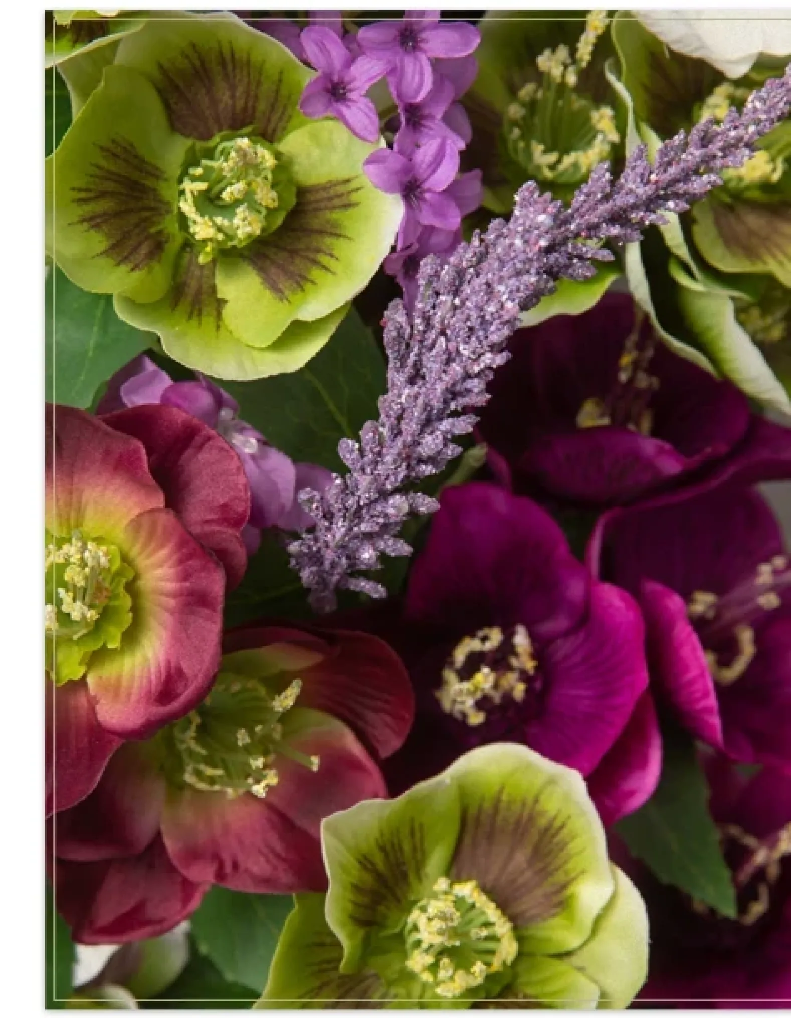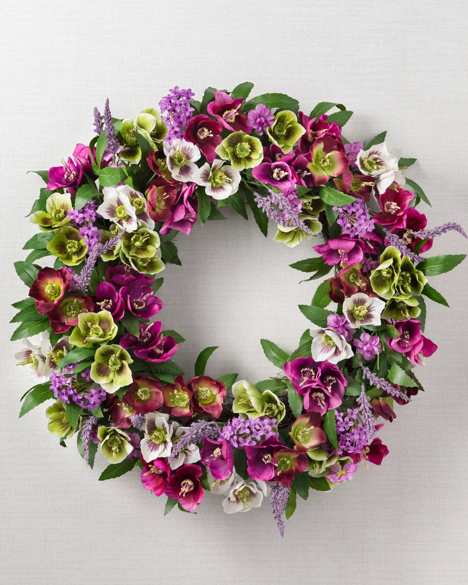 - All products in this collection feature an array of realistic hellebores, lilacs, and lavender.