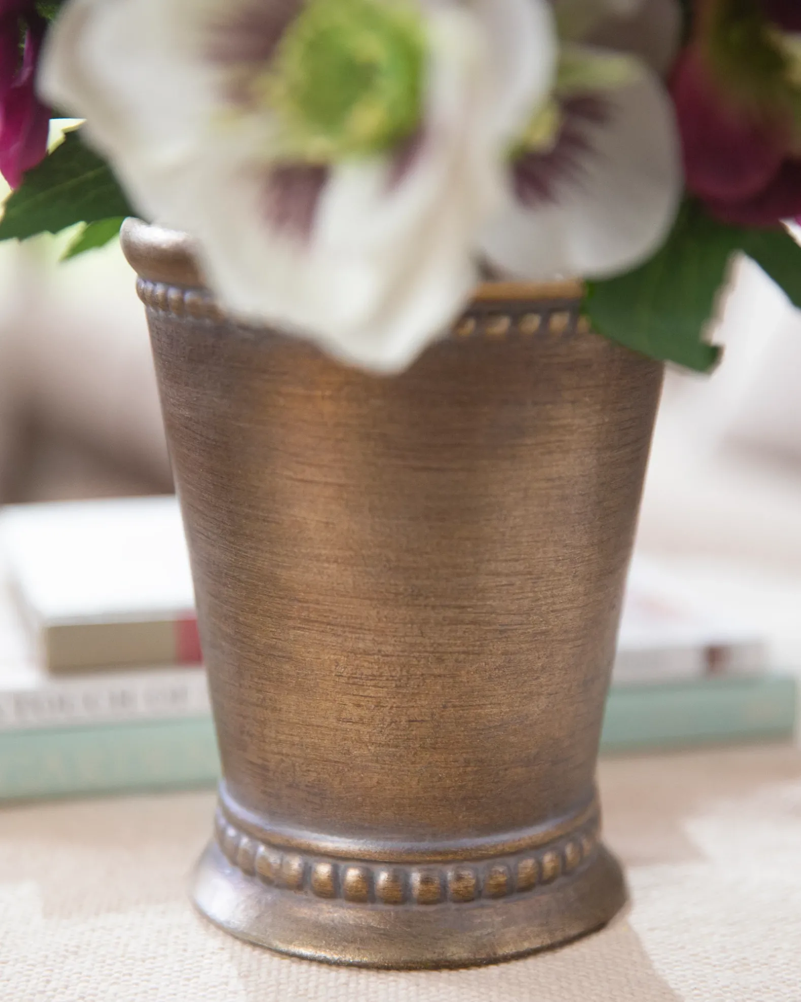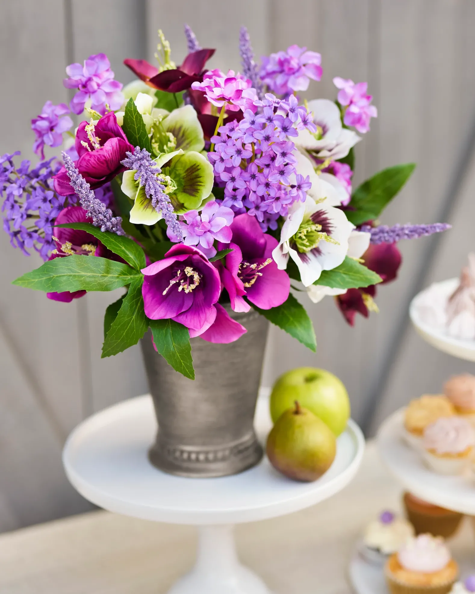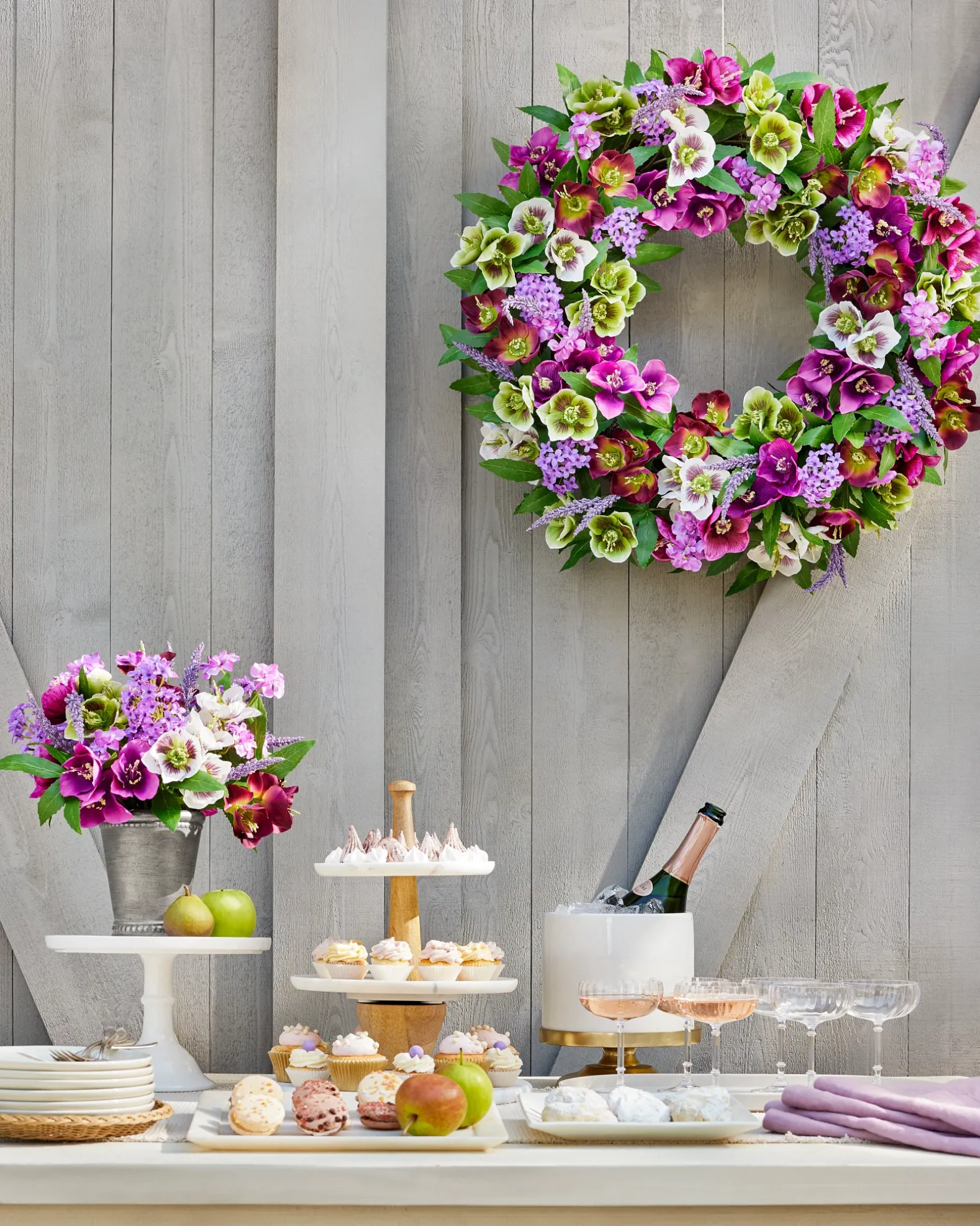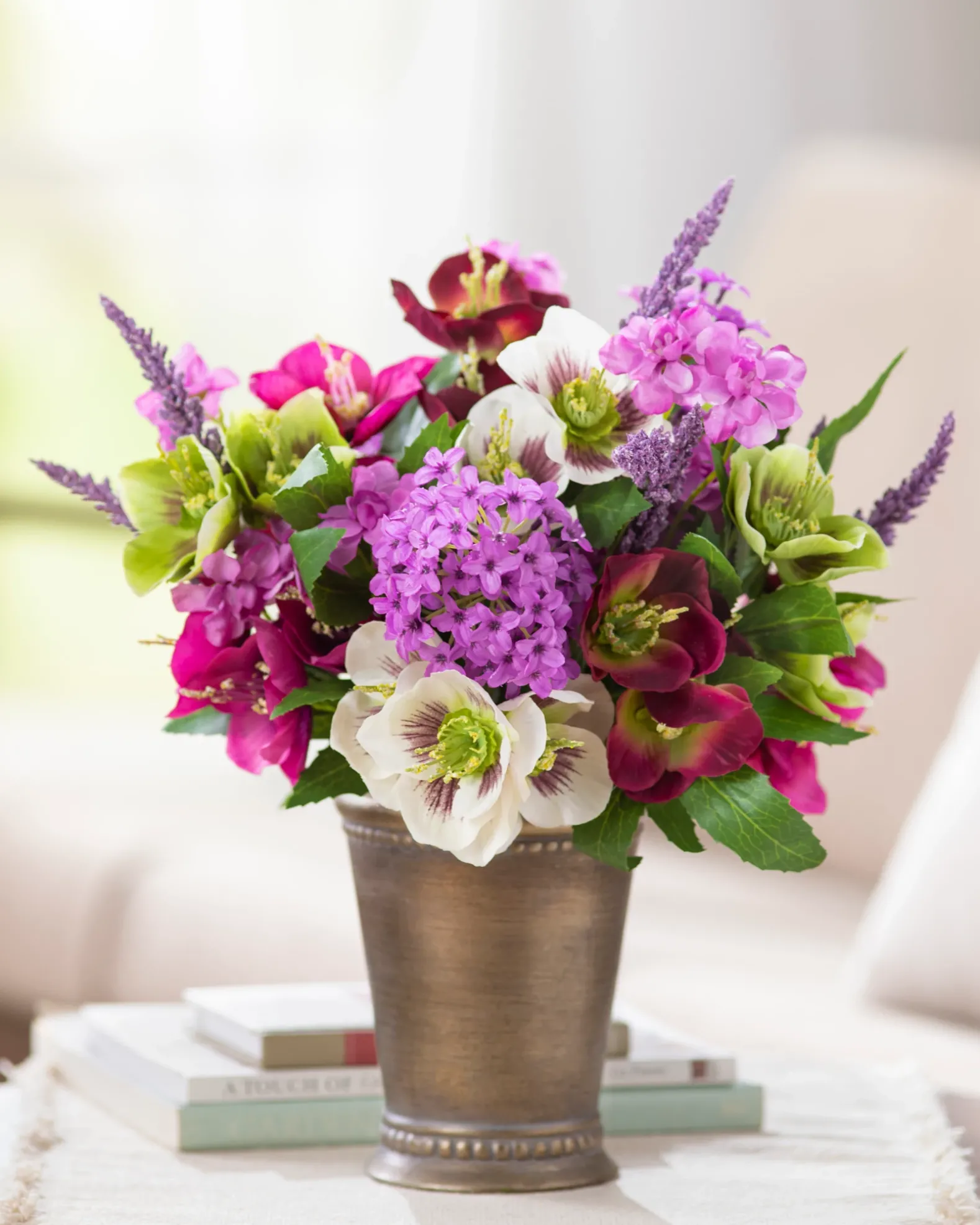 - All products in this collection feature an array of realistic hellebores, lilacs, and lavender.
