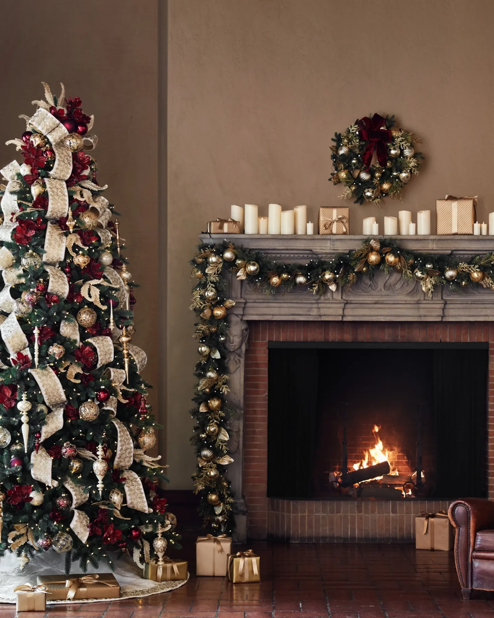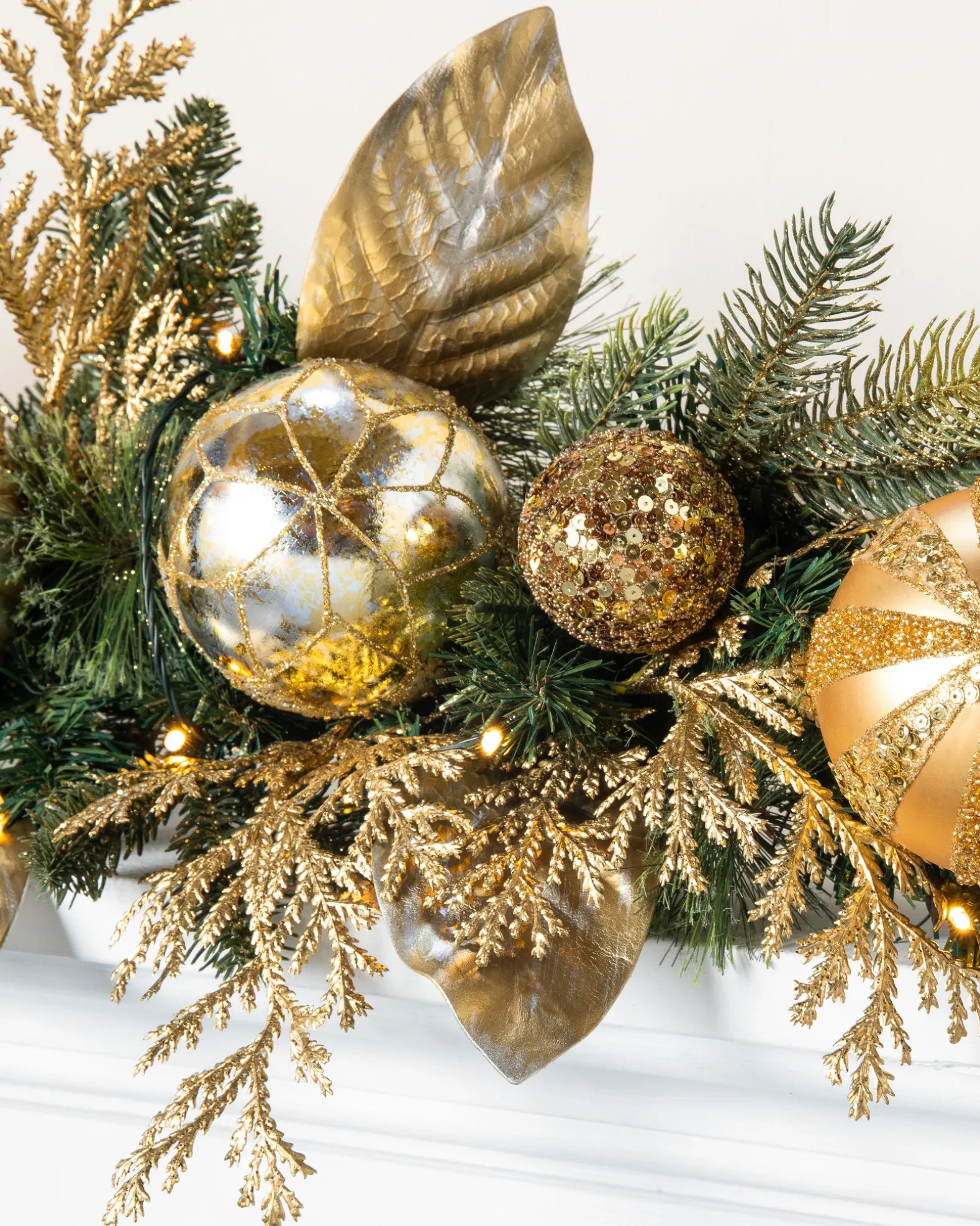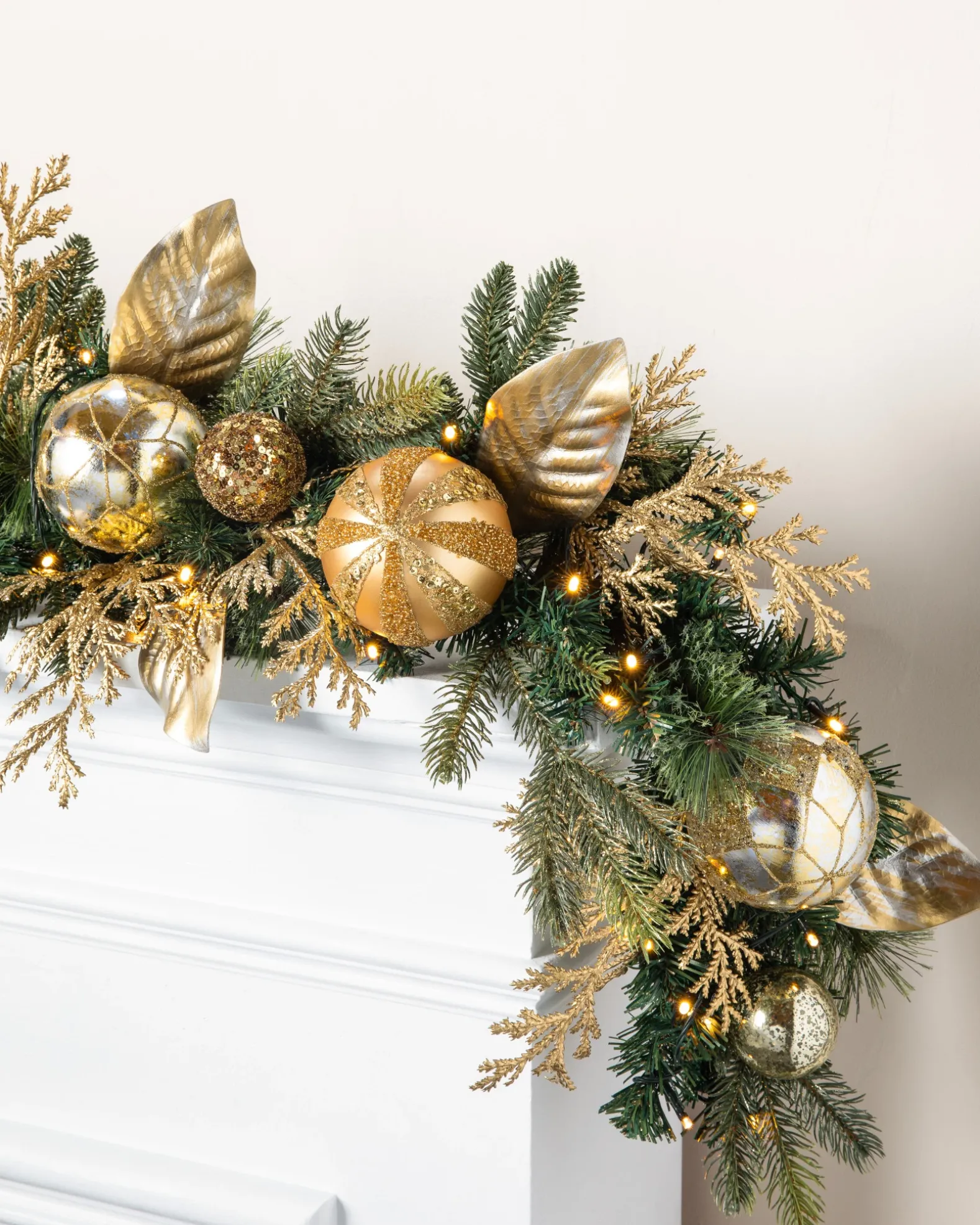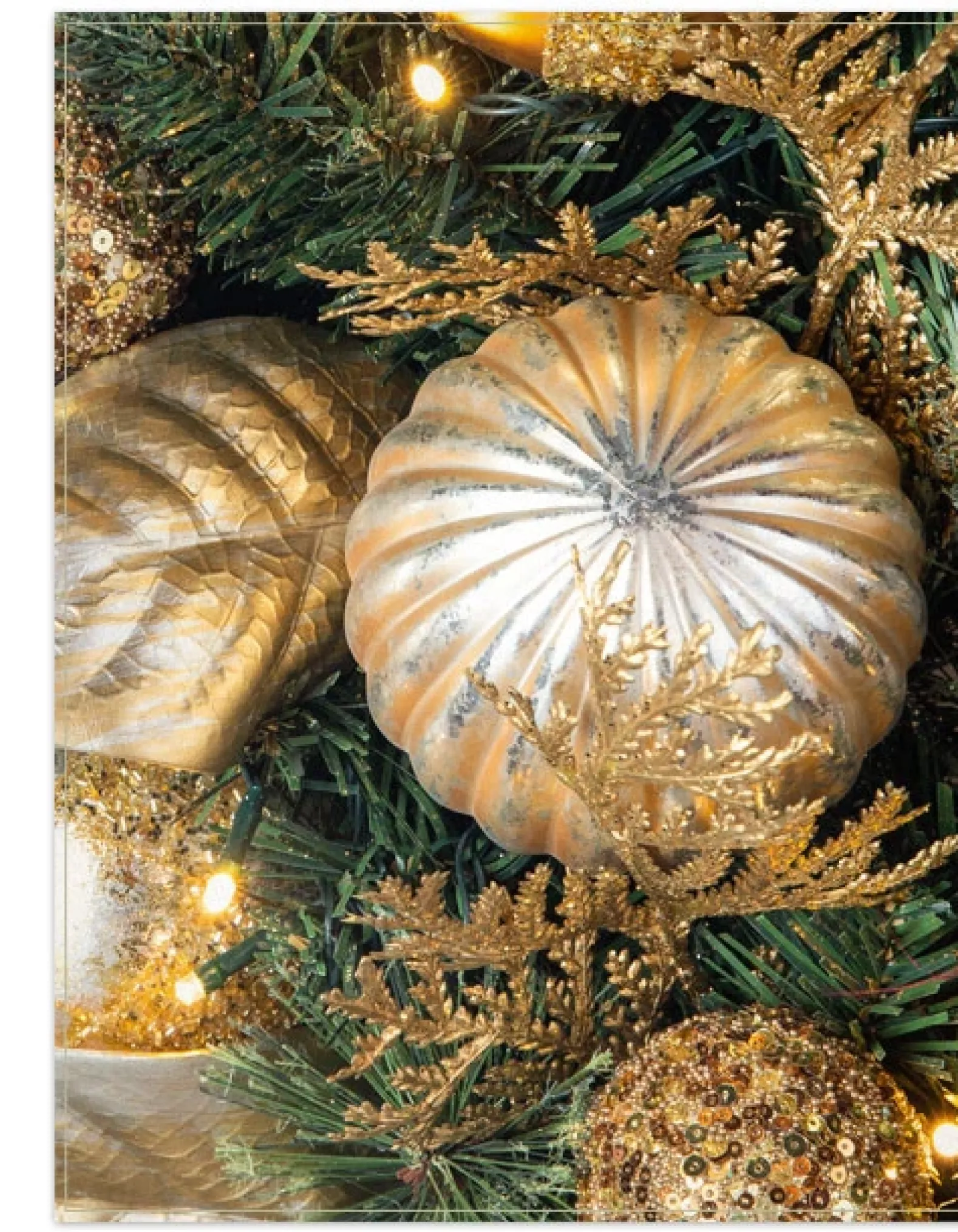 - All products in this collection feature a mix of evergreen foliage accented with gilded leaves, gold sprays, and glittered silver and gold shatter-resistant ornaments