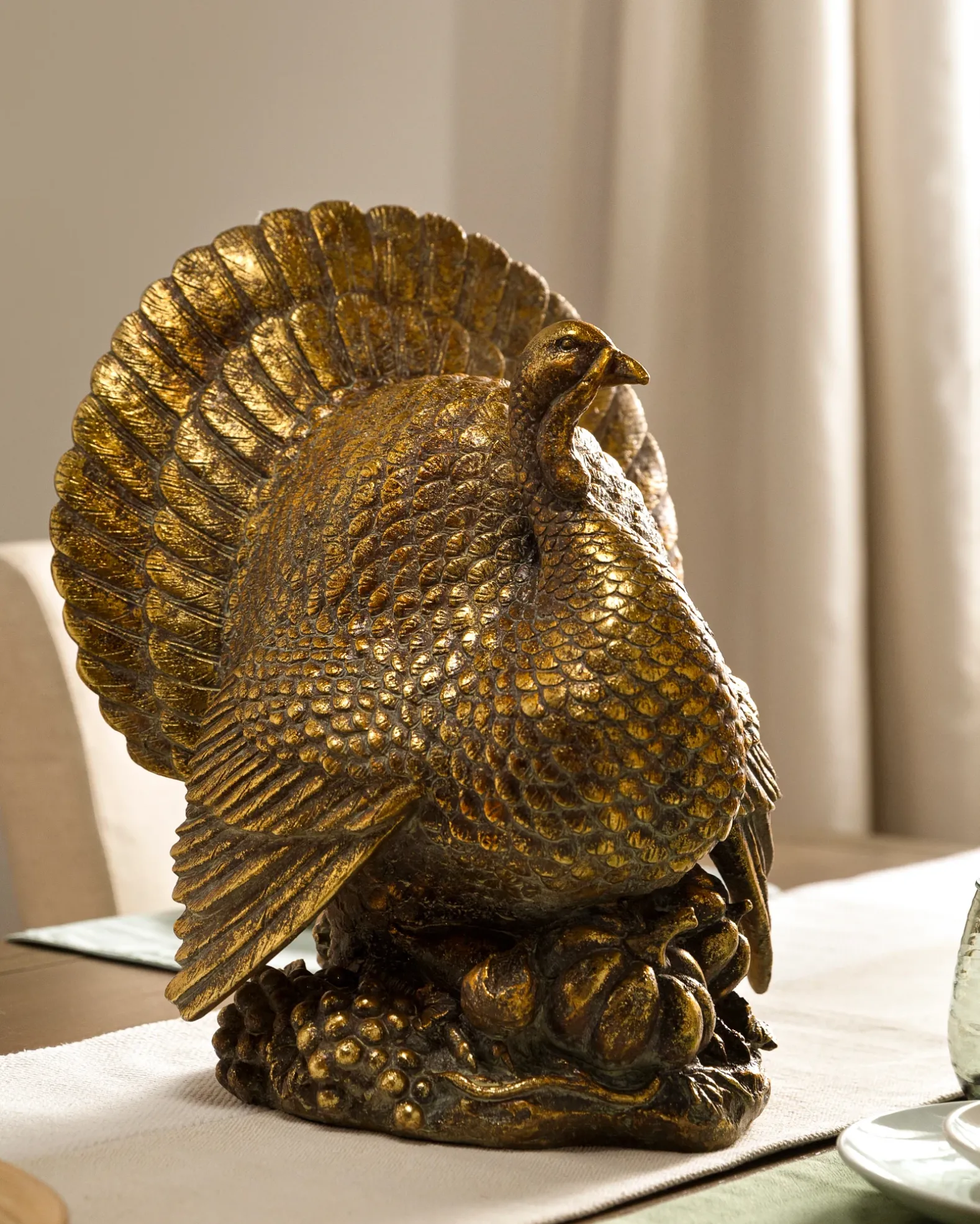 Add countryside elegance to your Thanksgiving celebrations. Perch our antiqued turkey centerpiece on the dinner table or mantel among lush fall foliage to create an inviting scene.