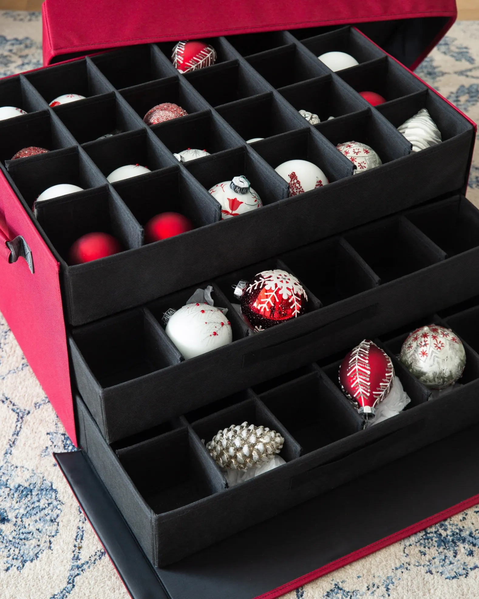 Keep your ornaments tidily tucked away for holidays to come with our exclusive storage box. Designed for easy use, this organizer features three removable trays with dividers that protect your delicate tree accessories. Save space and time with our stackable Christmas ornament storage box that comes in deep red for trouble-free identification.