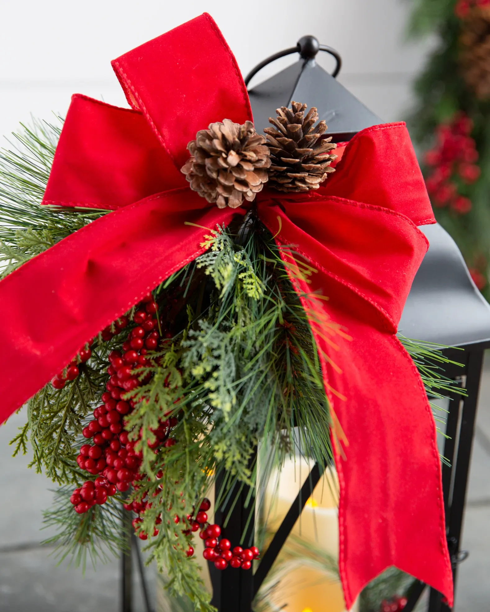 - Features a black finish with pinecones, red wired bow, bells, red berries, and mixed foliage