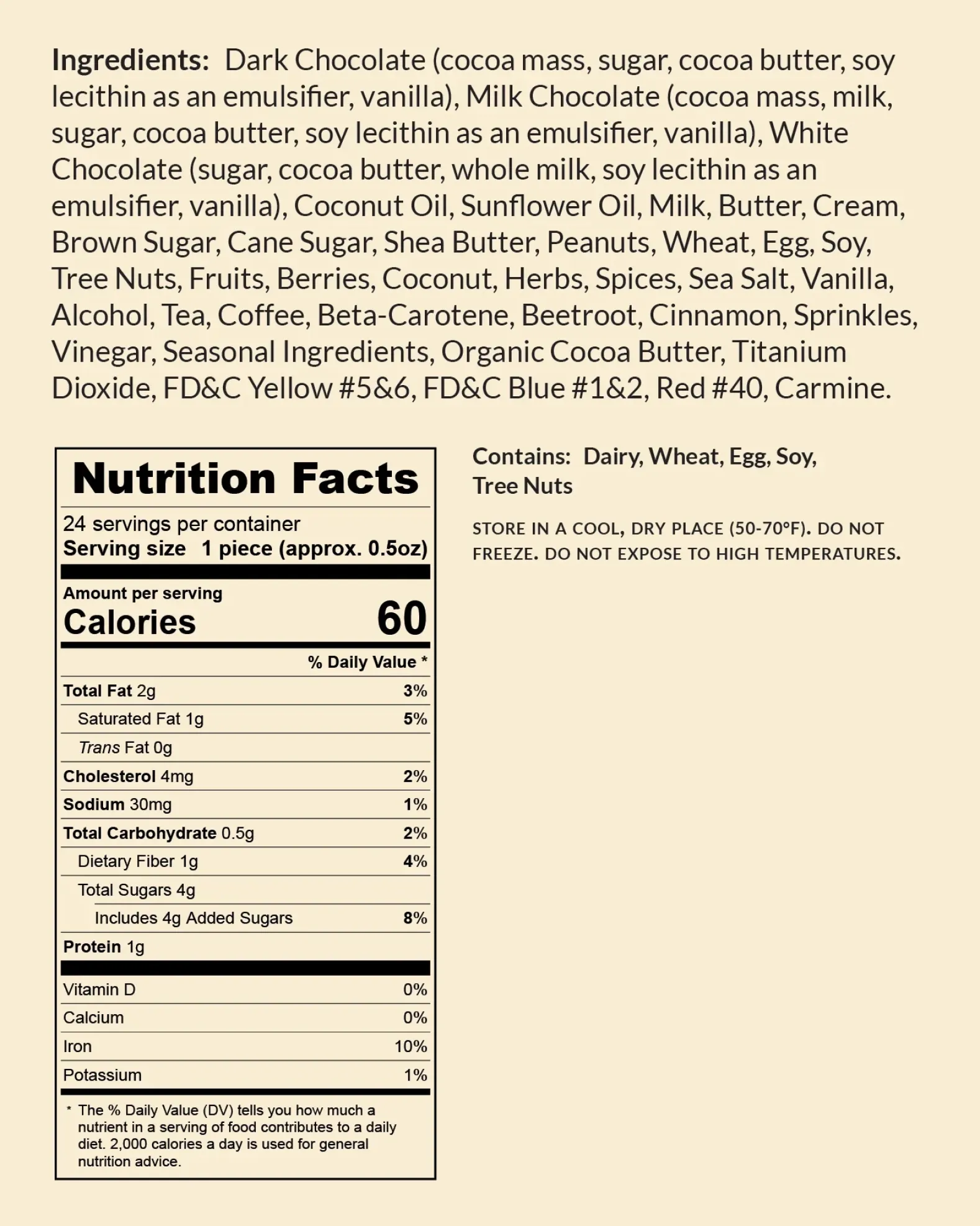 - Ingredients: Dark Chocolate (Cocoa Mass, Sugar, Cocoa Butter, Soy Lecithin as an Emulsifier, Vanilla), Milk Chocolate (Cocoa Mass, Milk, Sugar, Cocoa Butter, Soy Lecithin as an Emulsifier, Vanilla), White Chocolate (Sugar, Cocoa Butter, Whole Milk, Soy Lecithin as an Emulsifier, Vanilla), Coconut Oil, Sunflower Oil, Milk, Butter, Cream, Brown Sugar, Cane Sugar, Shea Butter, Peanuts, Wheat, Egg, Soy, Tree Nuts, Fruits, Berries, Coconut, Herbs, Spices, Sea Salt, Vanilla, Alcohol, Tea, Coffee, Beta-Carotene, Beetroot, Cinnamon, Sprinkles, Vinegar, Seasonal Ingredients, Organic Cocoa Butter, Titanium Dioxide, FD&C Yellow #5&6, FD&C Blue #1&2, Red #40, Carmine