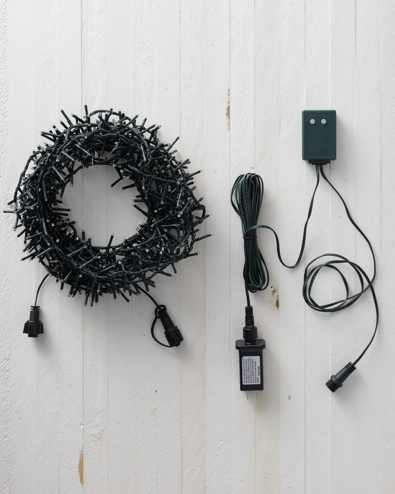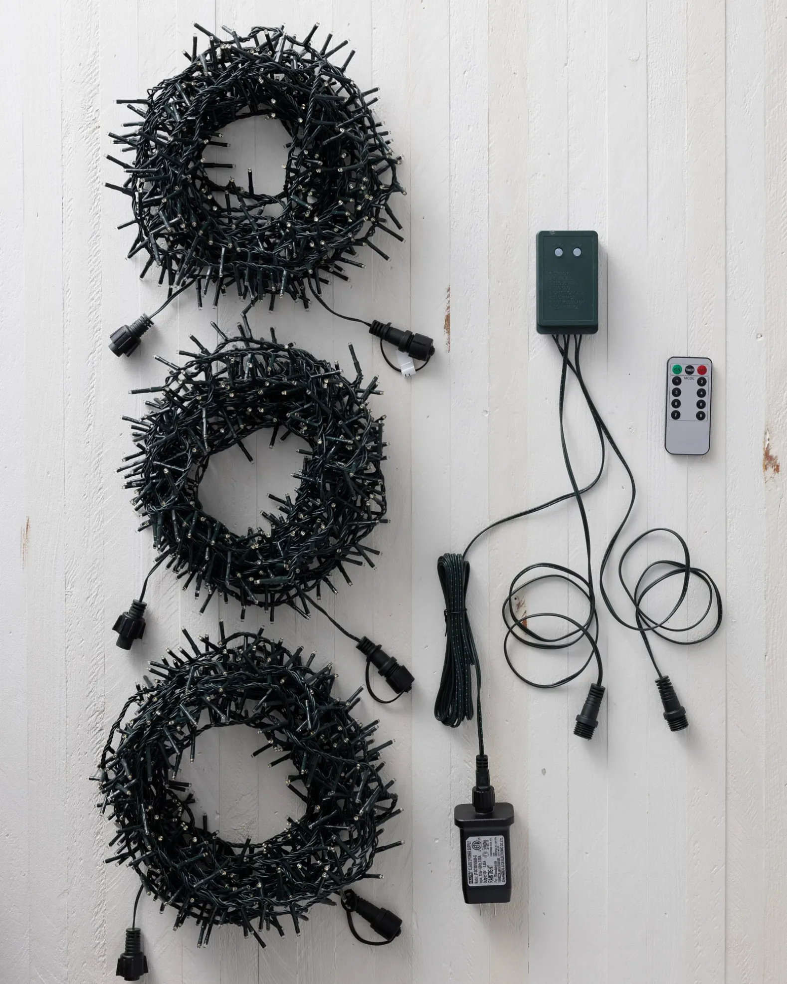 - Includes 3 dark green light strings, 1 remote, and 1 transformer