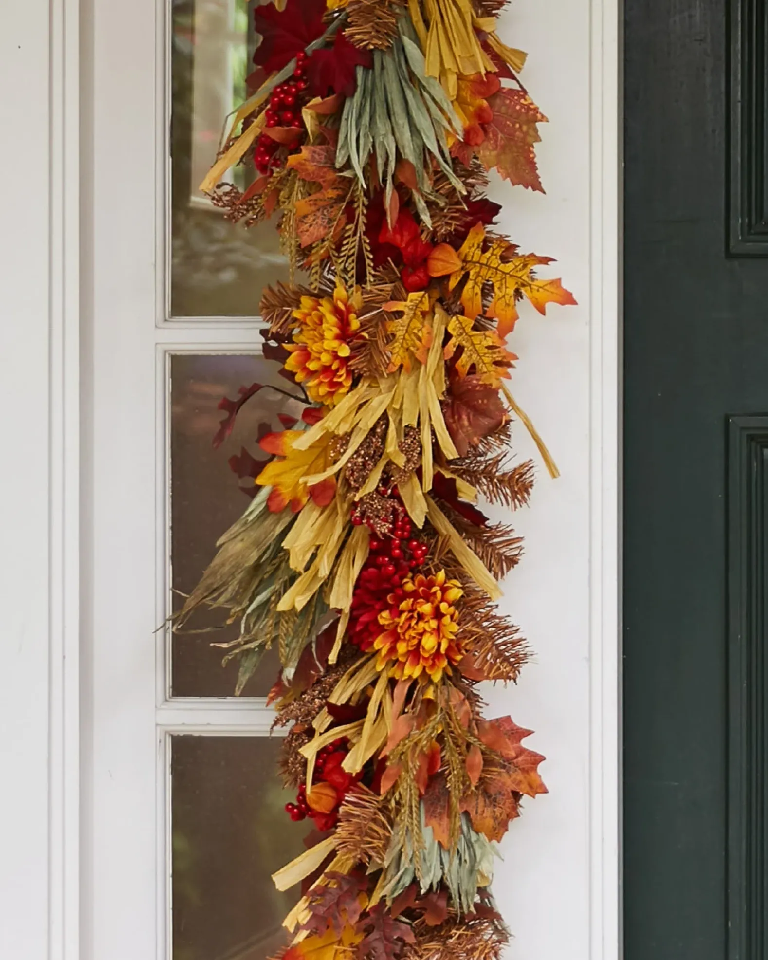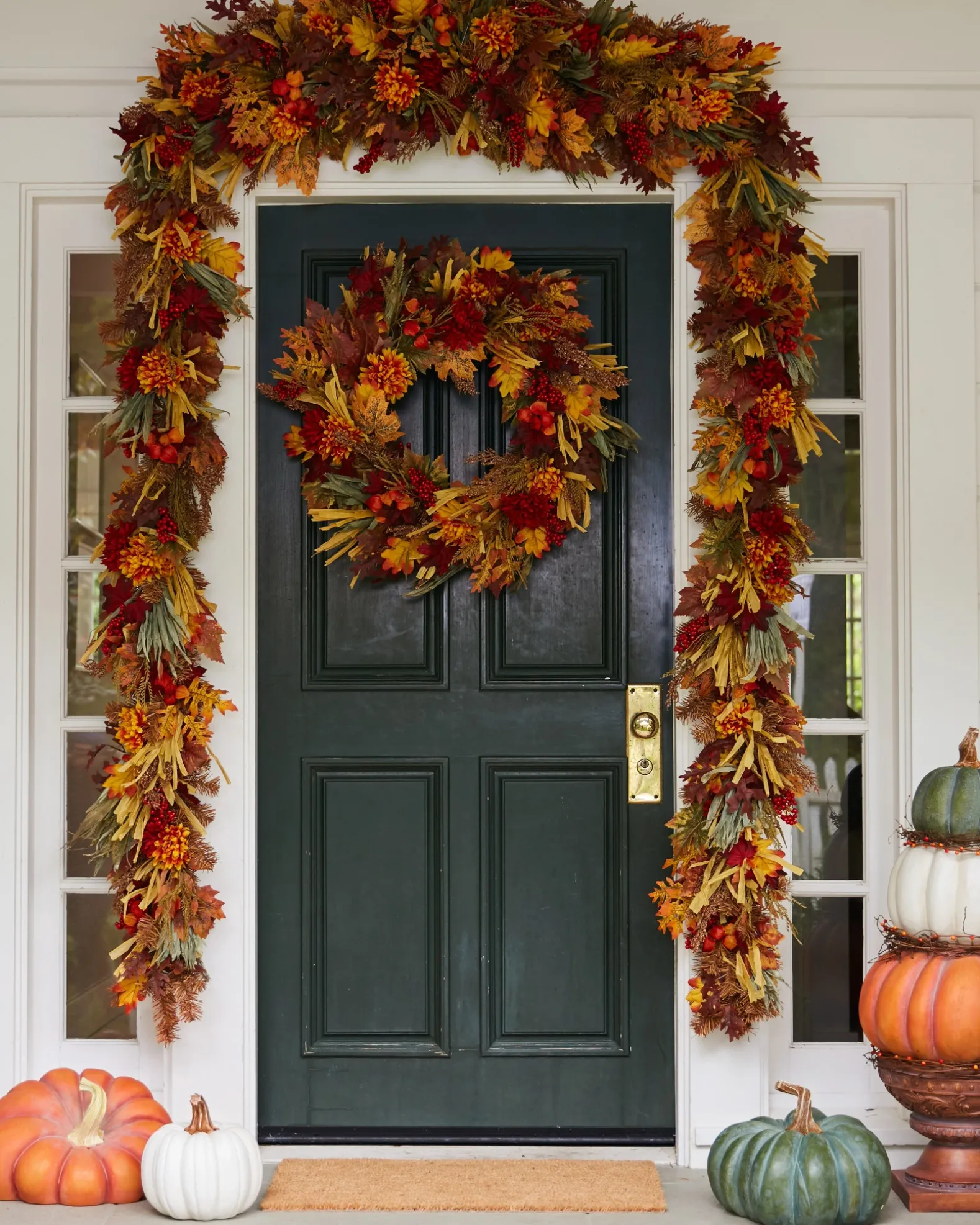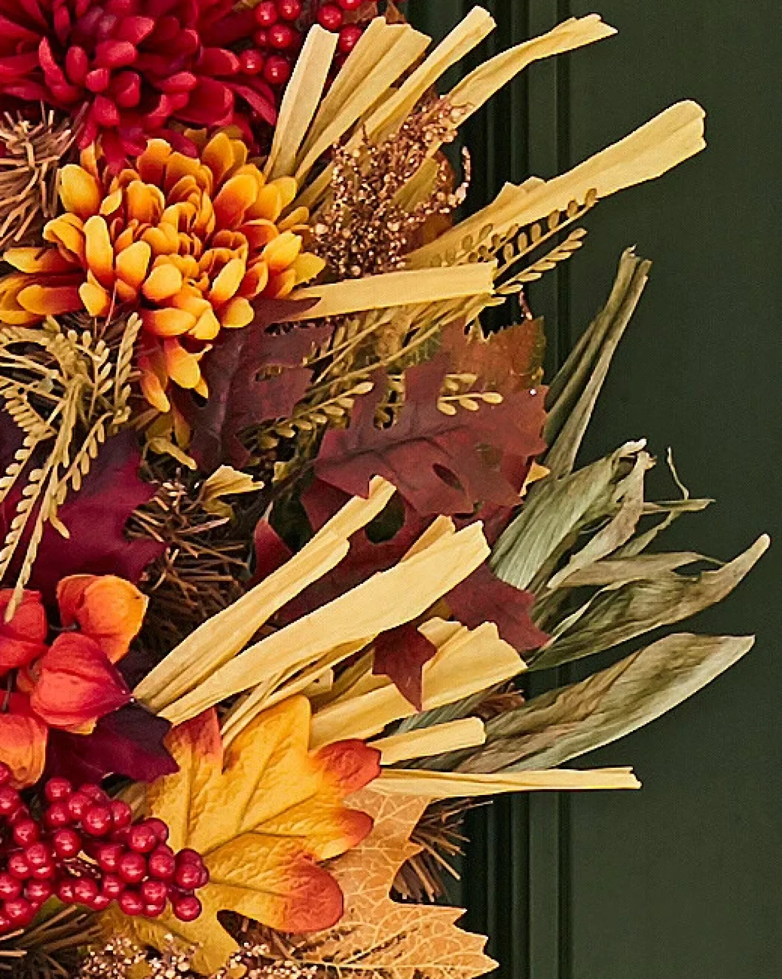 Add countryside charm to your fall decorations with this collection designed by celebrated floral artist Brad Schmidt. Wheat stalks, corn husks, and turning maple leaves complement mums, Japanese lanterns, and berry clusters in lively auburn and orange shades. Display on the front porch or in the living room to welcome the season into your home.