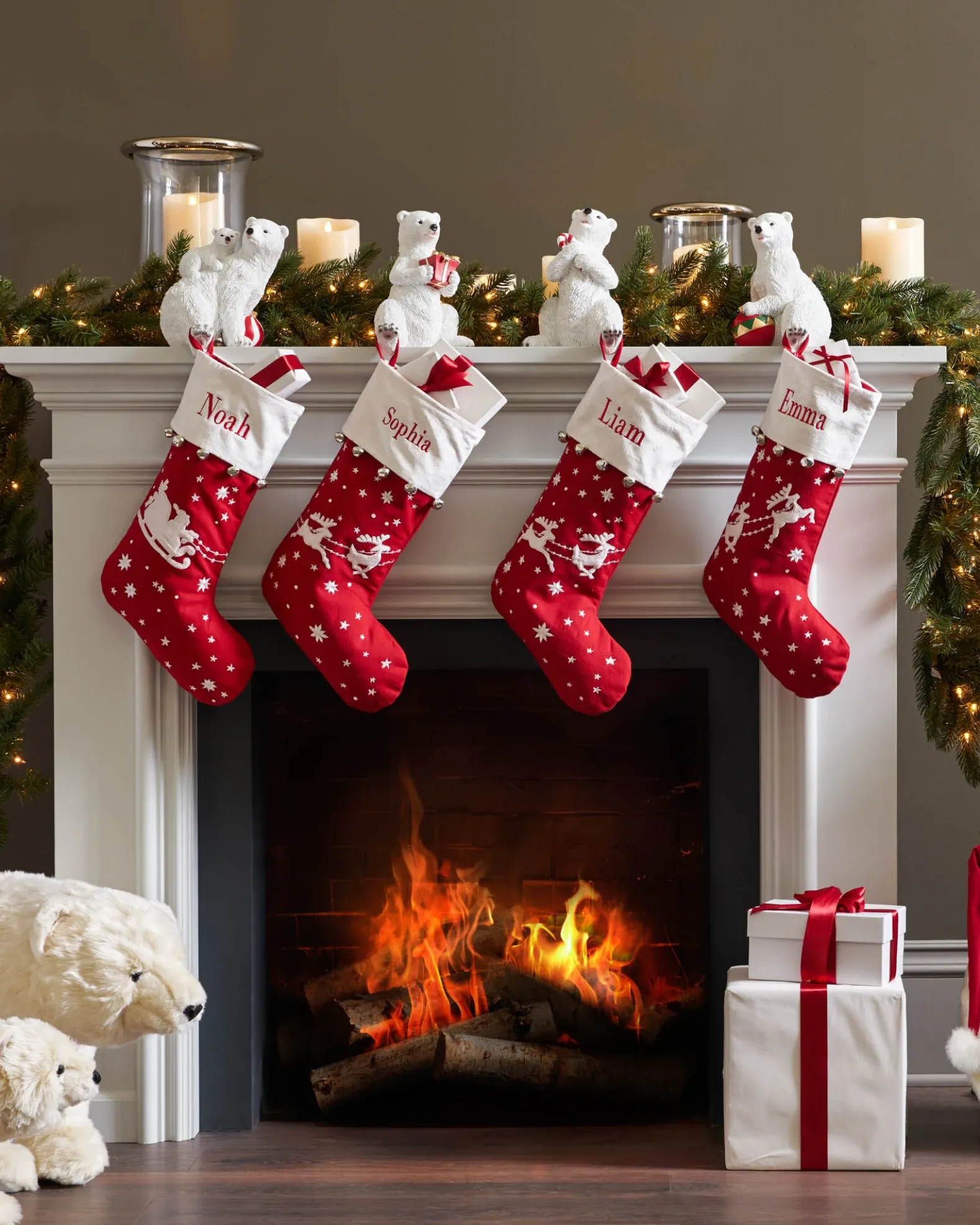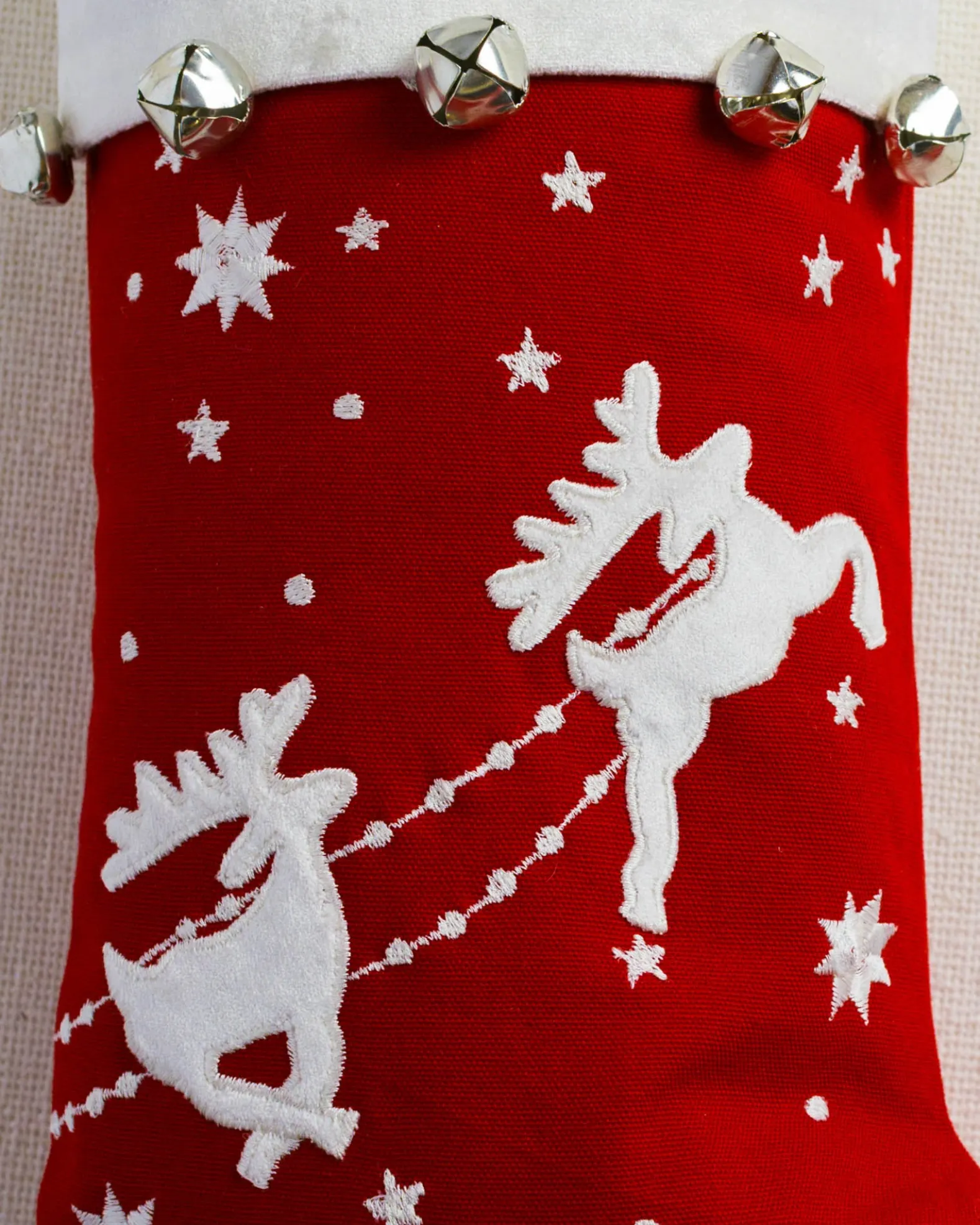 Give your mantel a dash of Christmas joy. These exclusive stockings feature rich red fabric with white hand-embroidered appliqués of Santa and his reindeer shooting across the sky. Accented by jingle bells, the stocking has a wide cuff for added charm.