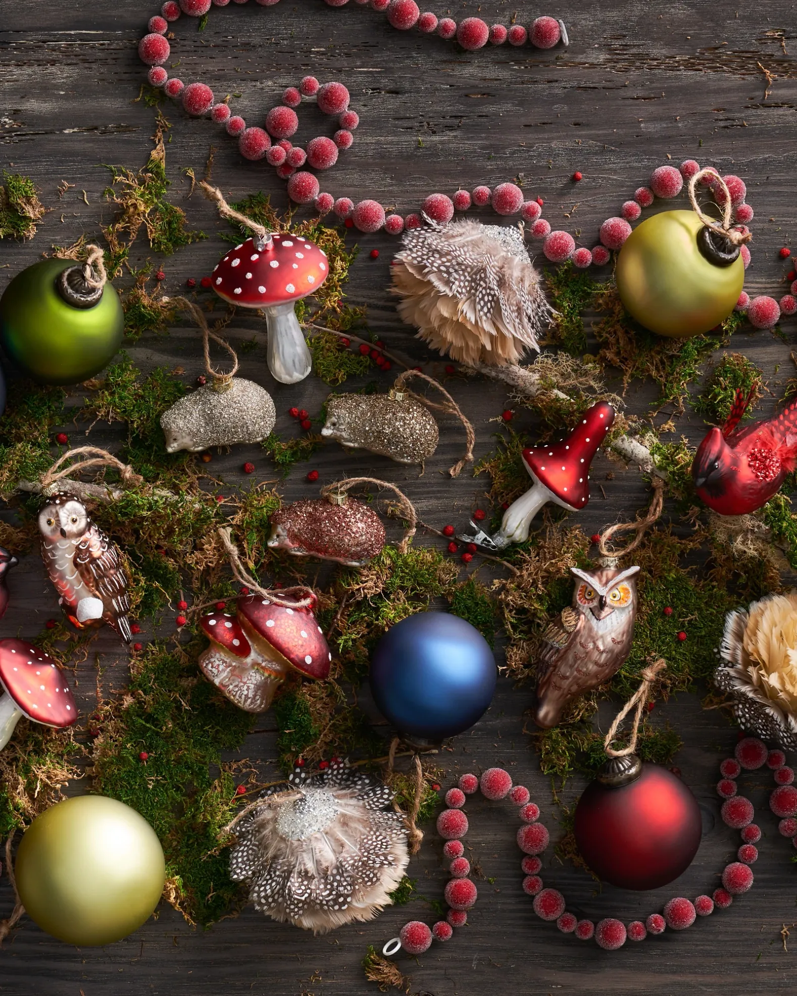 - Features an assortment of Christmas balls, mushrooms, and woodland animal ornaments made from glass and feathers