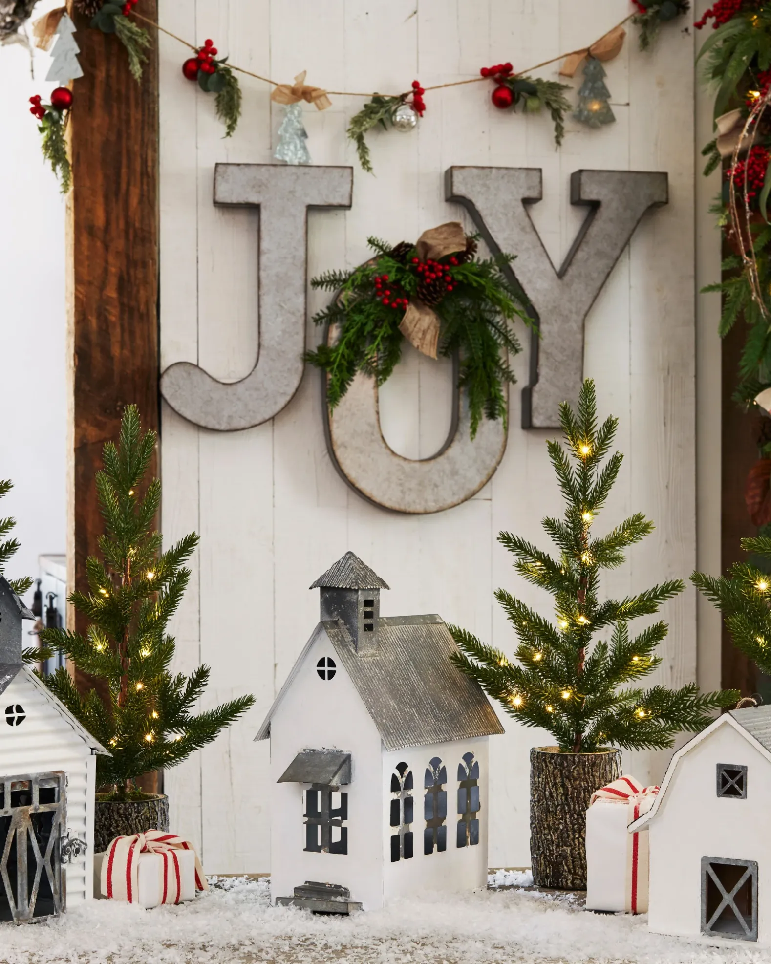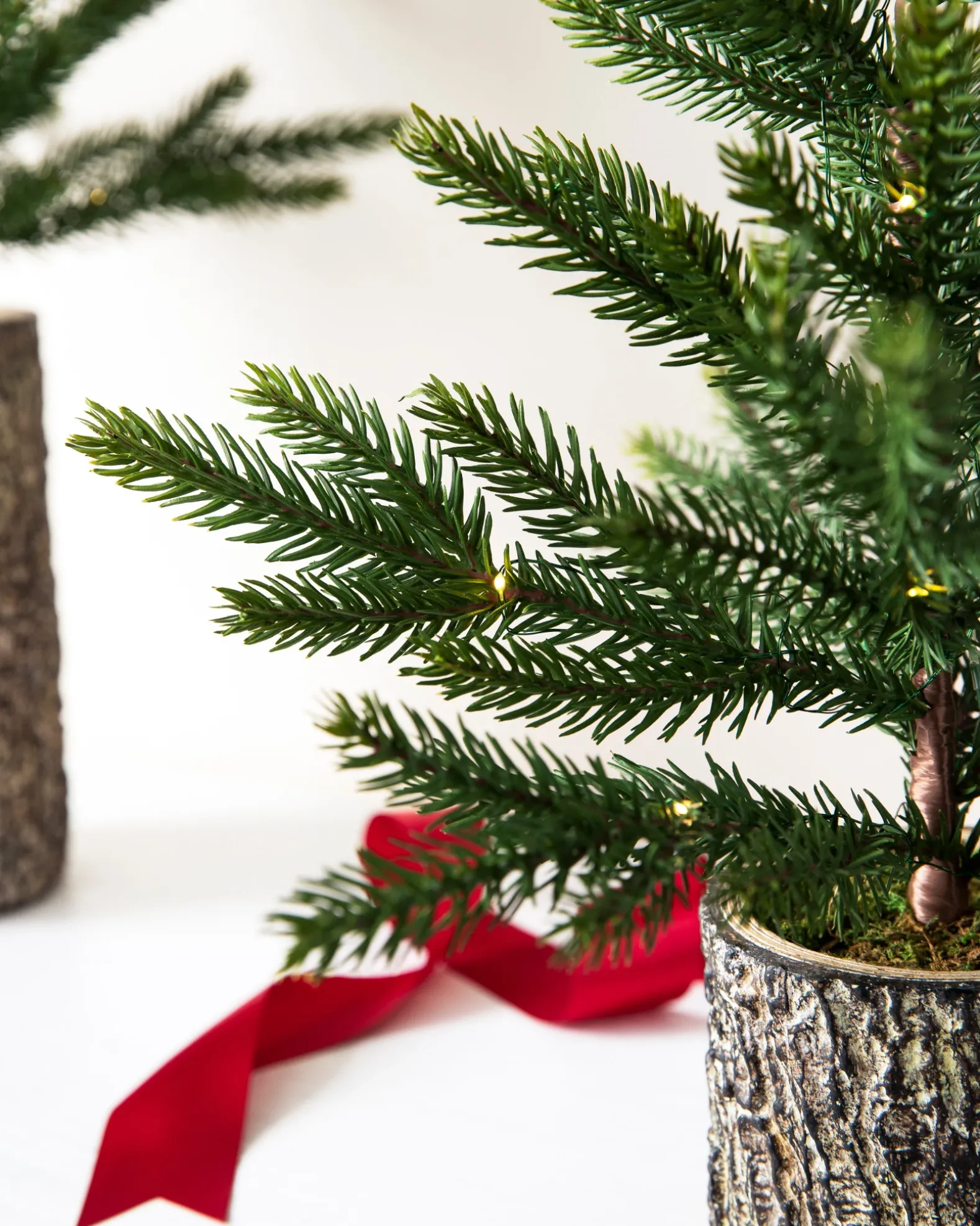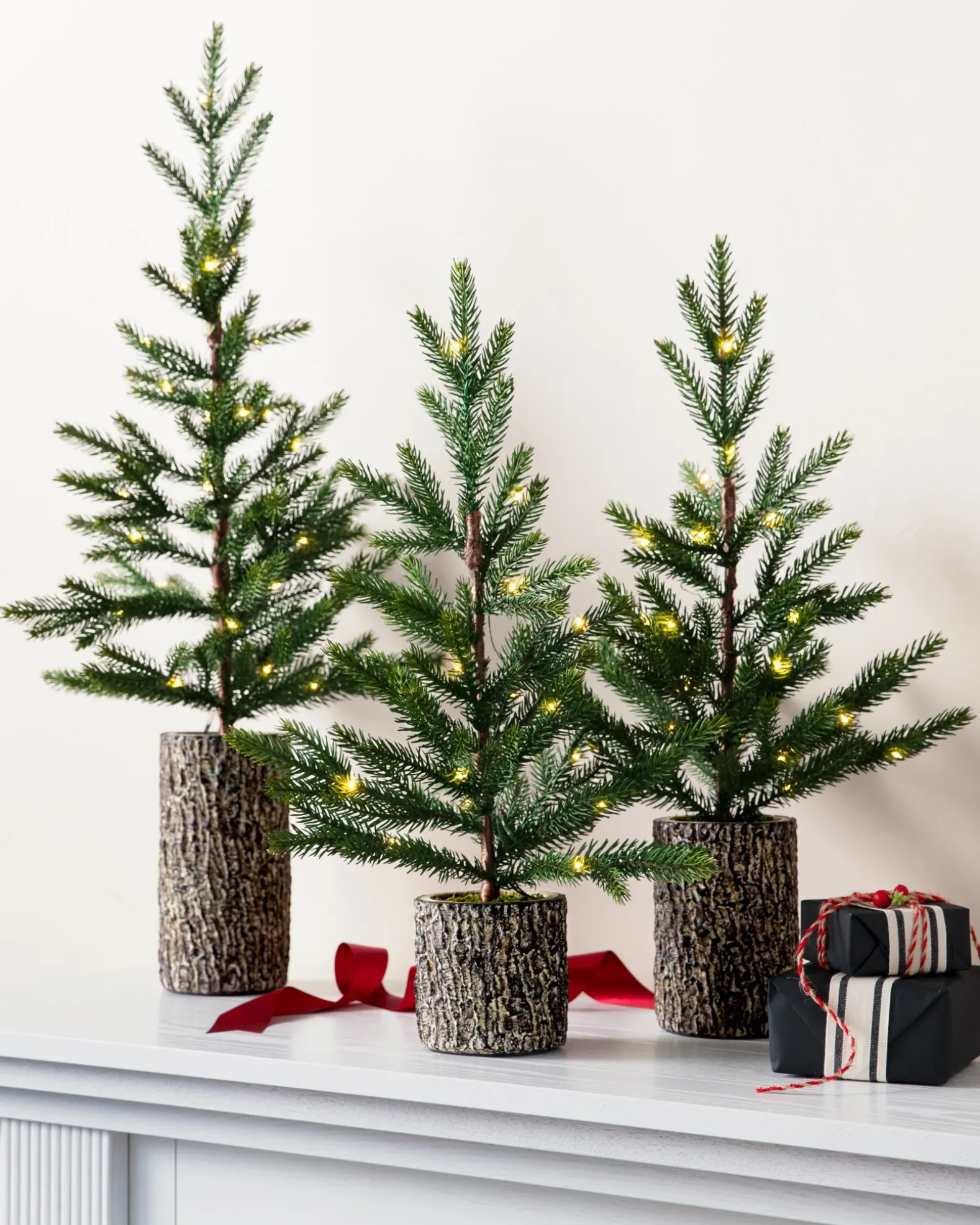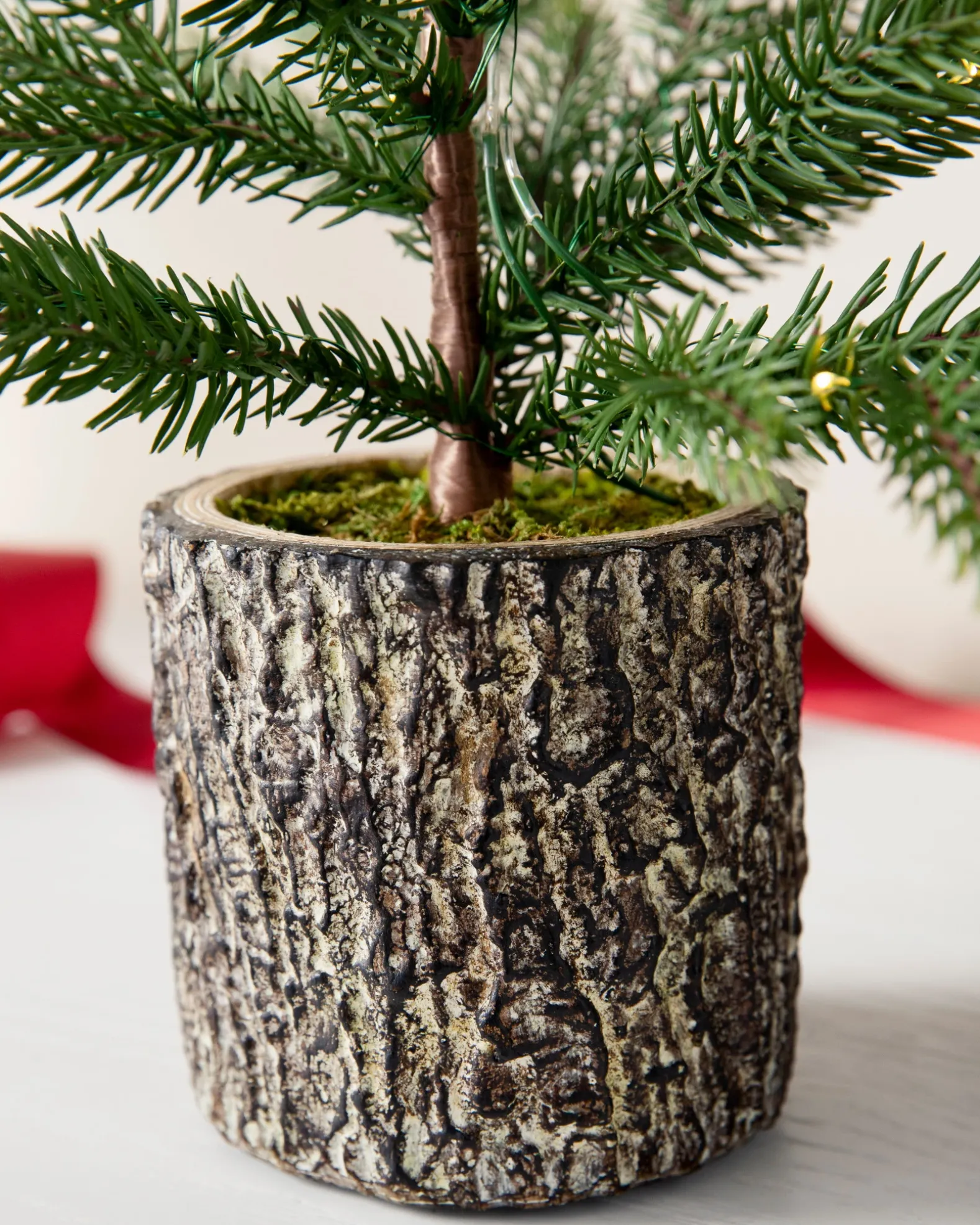 Welcome the season with the charming look of baby evergreens. Nestled in textured bark pots, this set adds a rustic touch to mantels and tablescapes.
