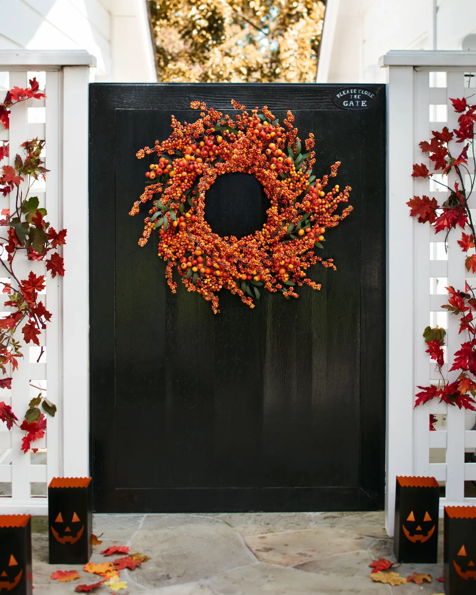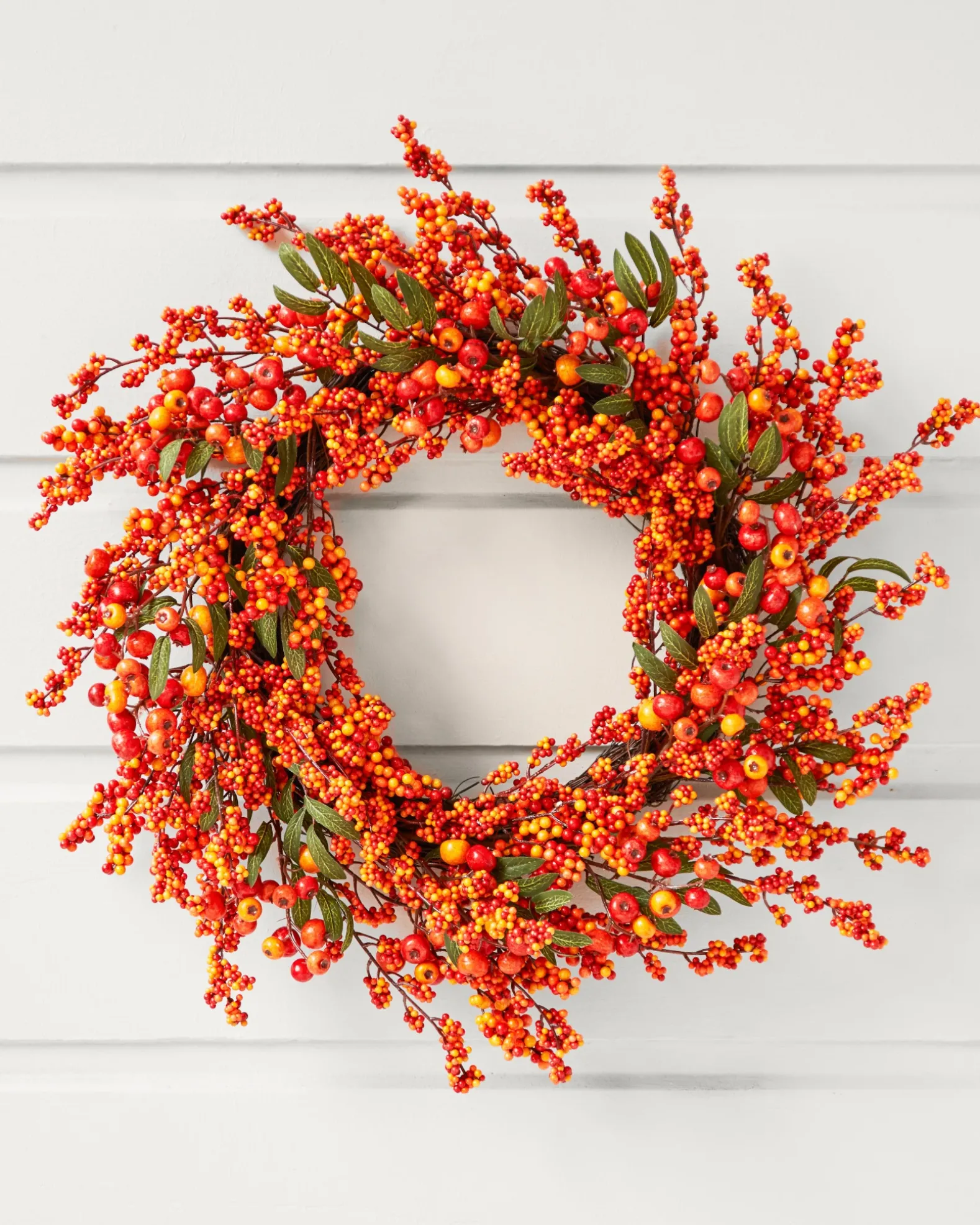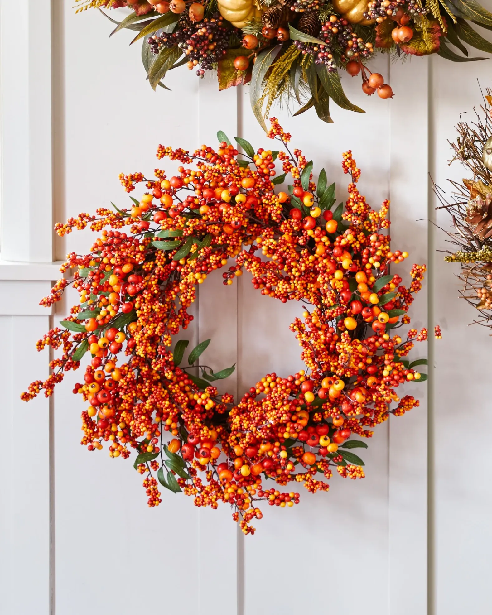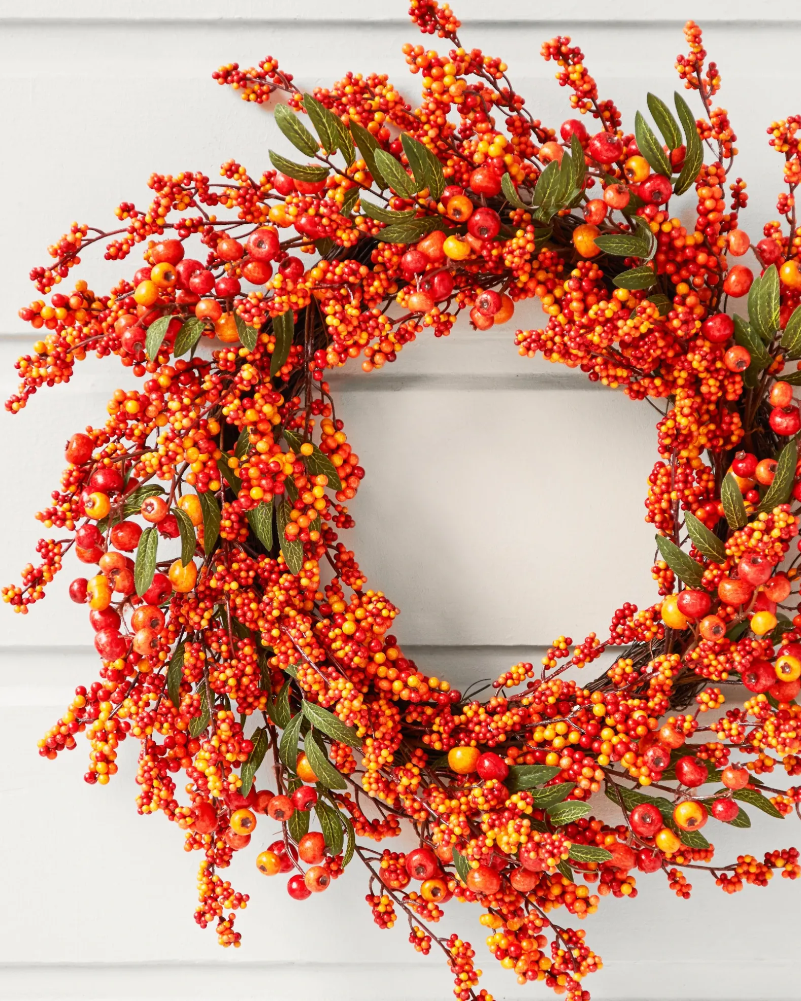 Celebrate the harvest season with a splash of vibrant fall colors. Our exclusive wreath features an array of berries in various shades of orange complemented by faux green leaves. Hang it on the front door to create a warm welcome for guests or place it on the mantel for a cheerful autumn display.