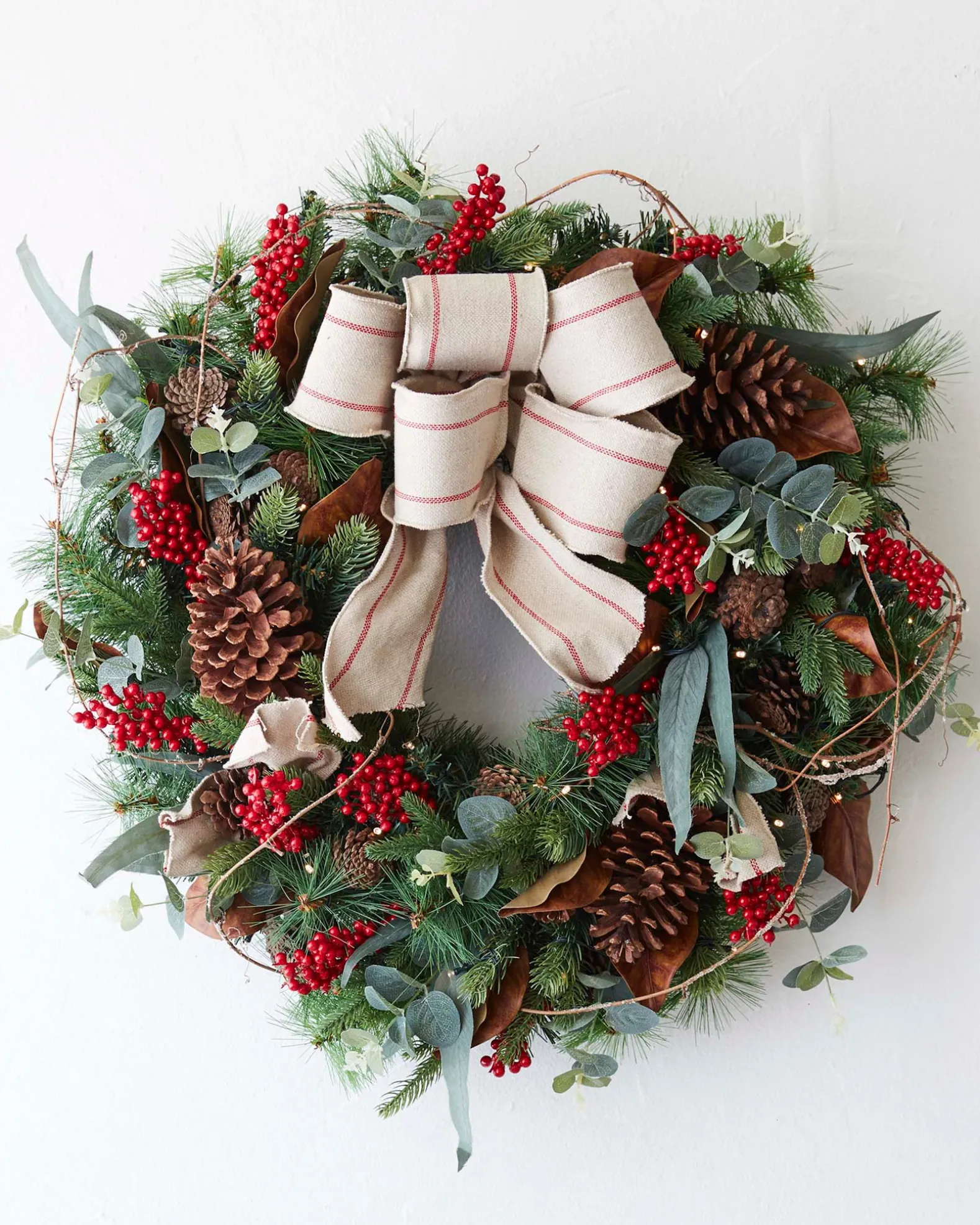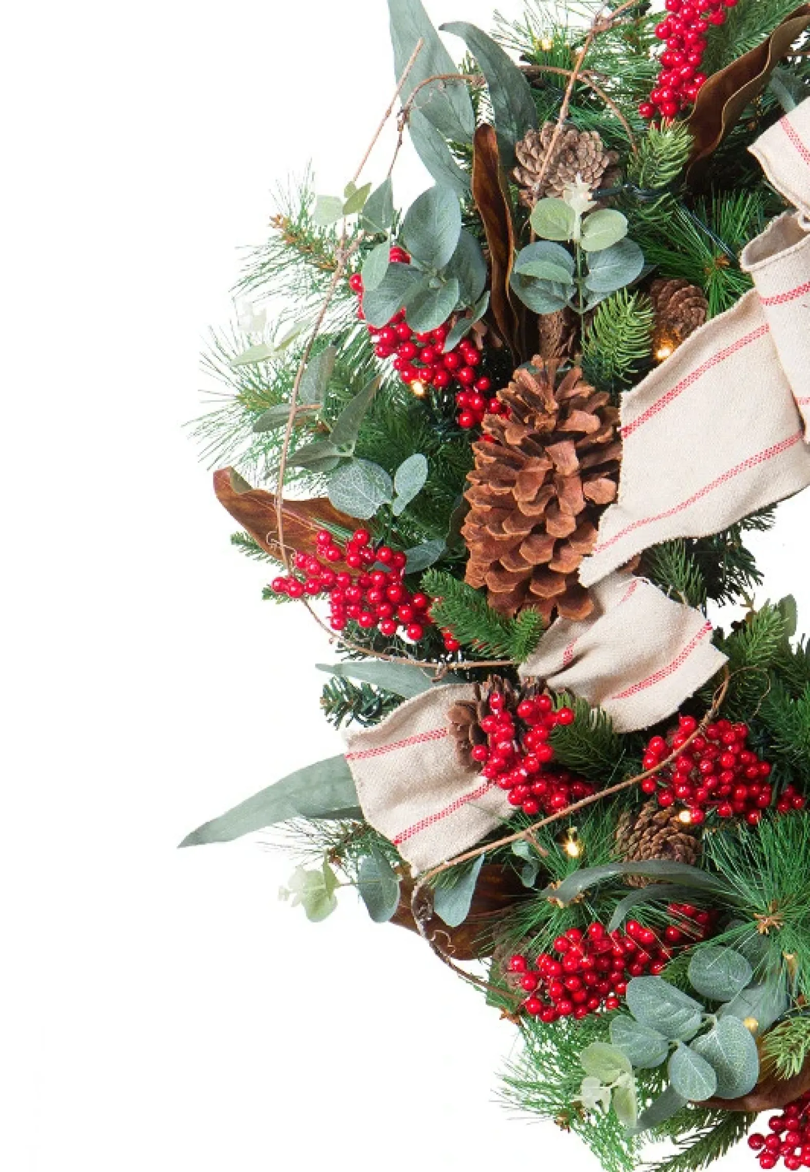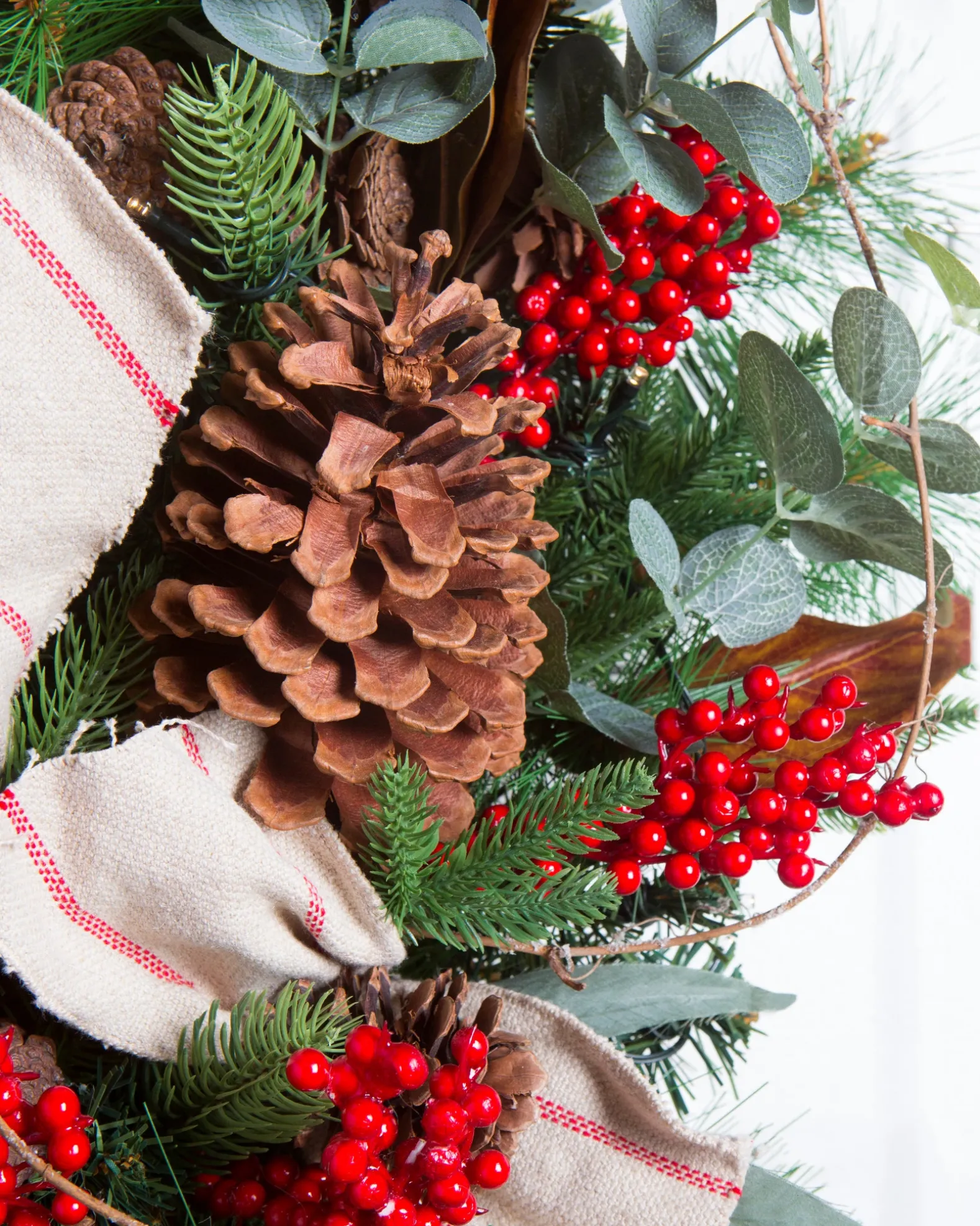 - All products in this collection feature pine foliage accented with eucalyptus leaves, red berries, natural pinecones, magnolia leaves, and linen bow