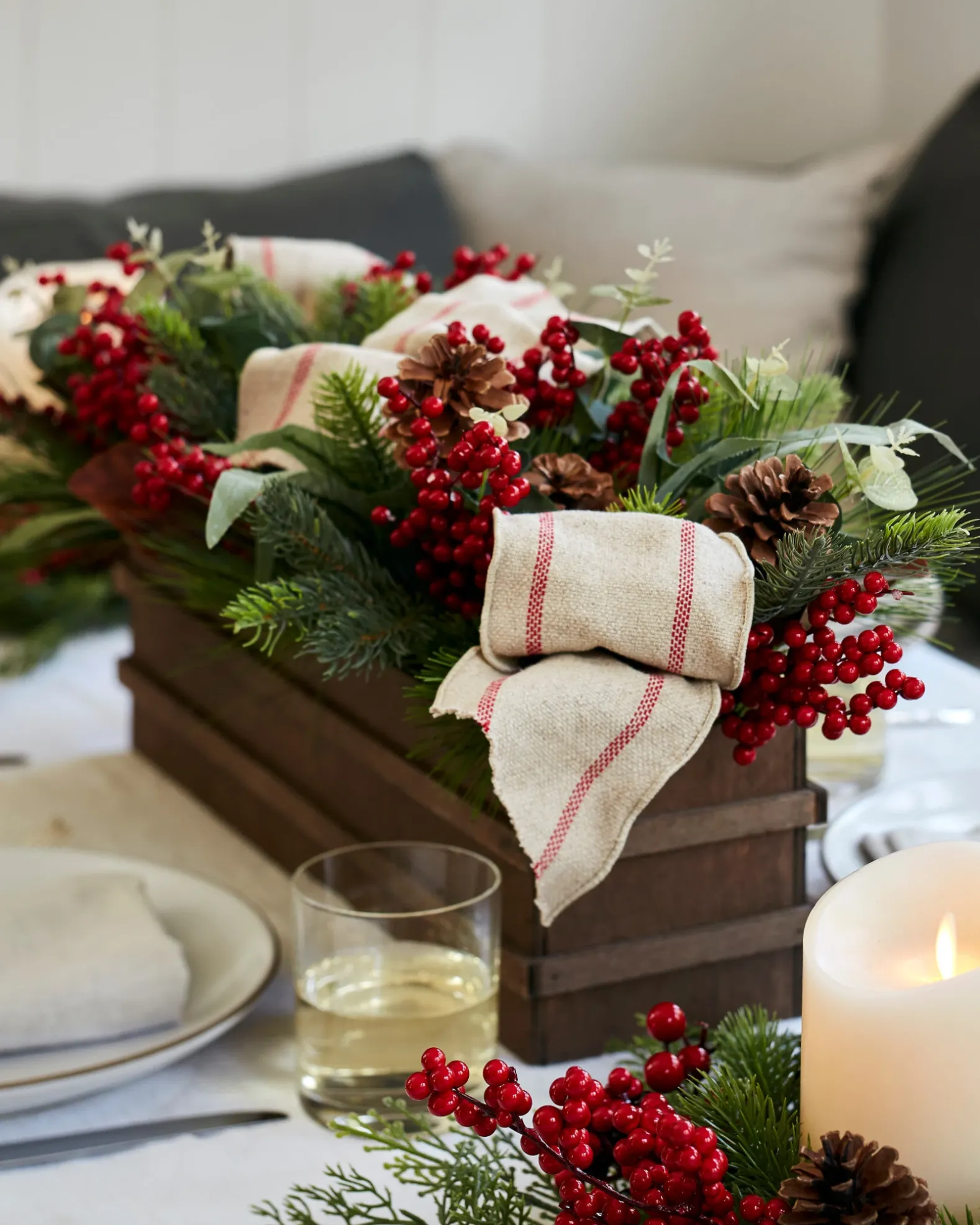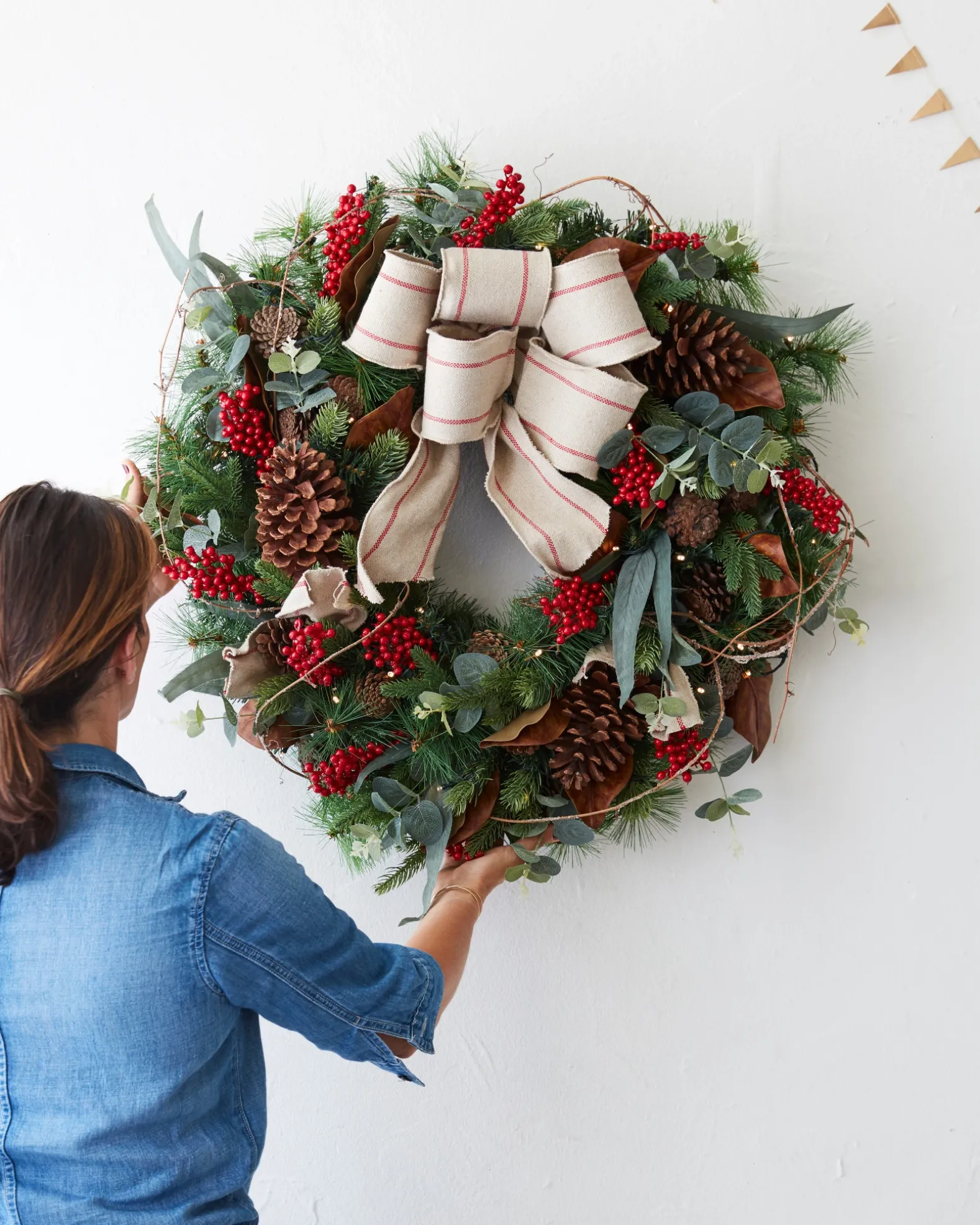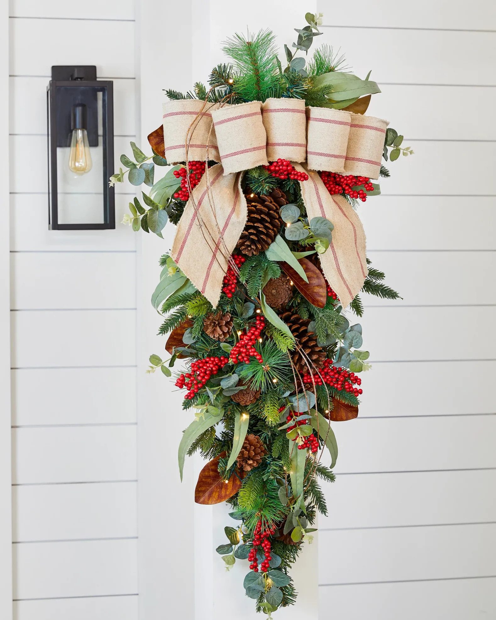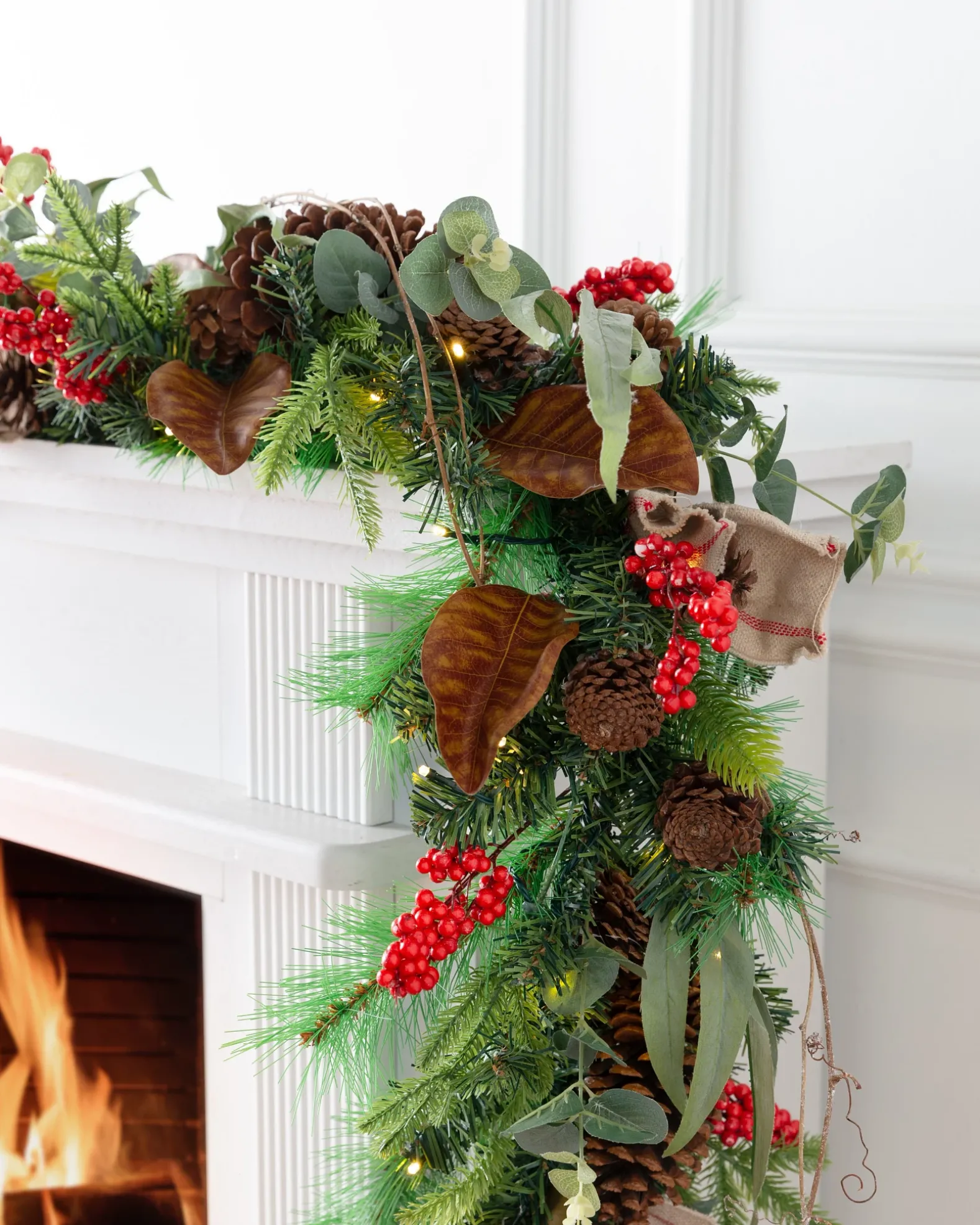 - All products in this collection feature pine foliage accented with eucalyptus leaves, red berries, natural pinecones, magnolia leaves, and linen bow