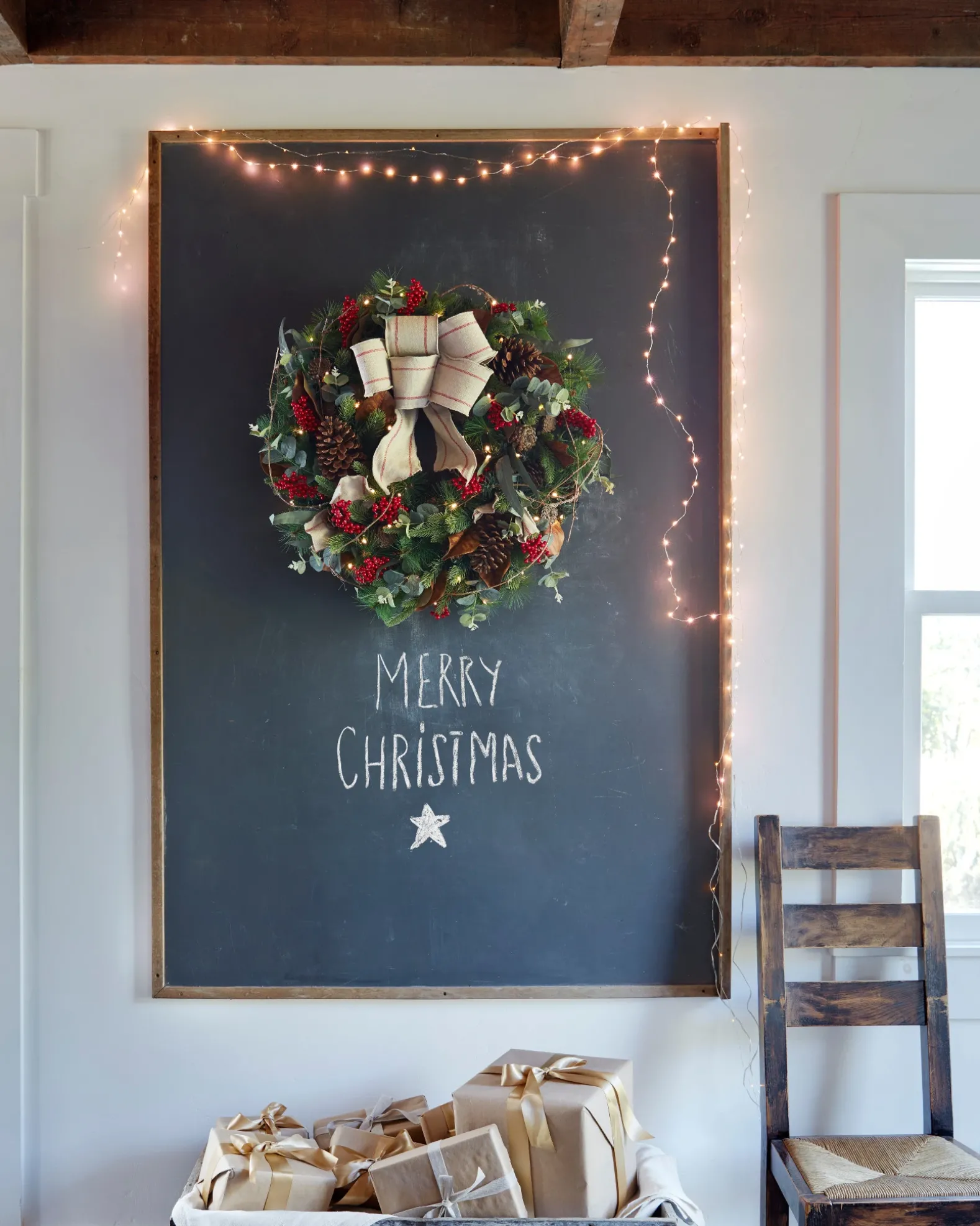 Bring rustic elegance into your holiday home. Brown magnolia leaves add depth and color while a linen bow reminiscent of French grain sacks lend a vintage look to any space.