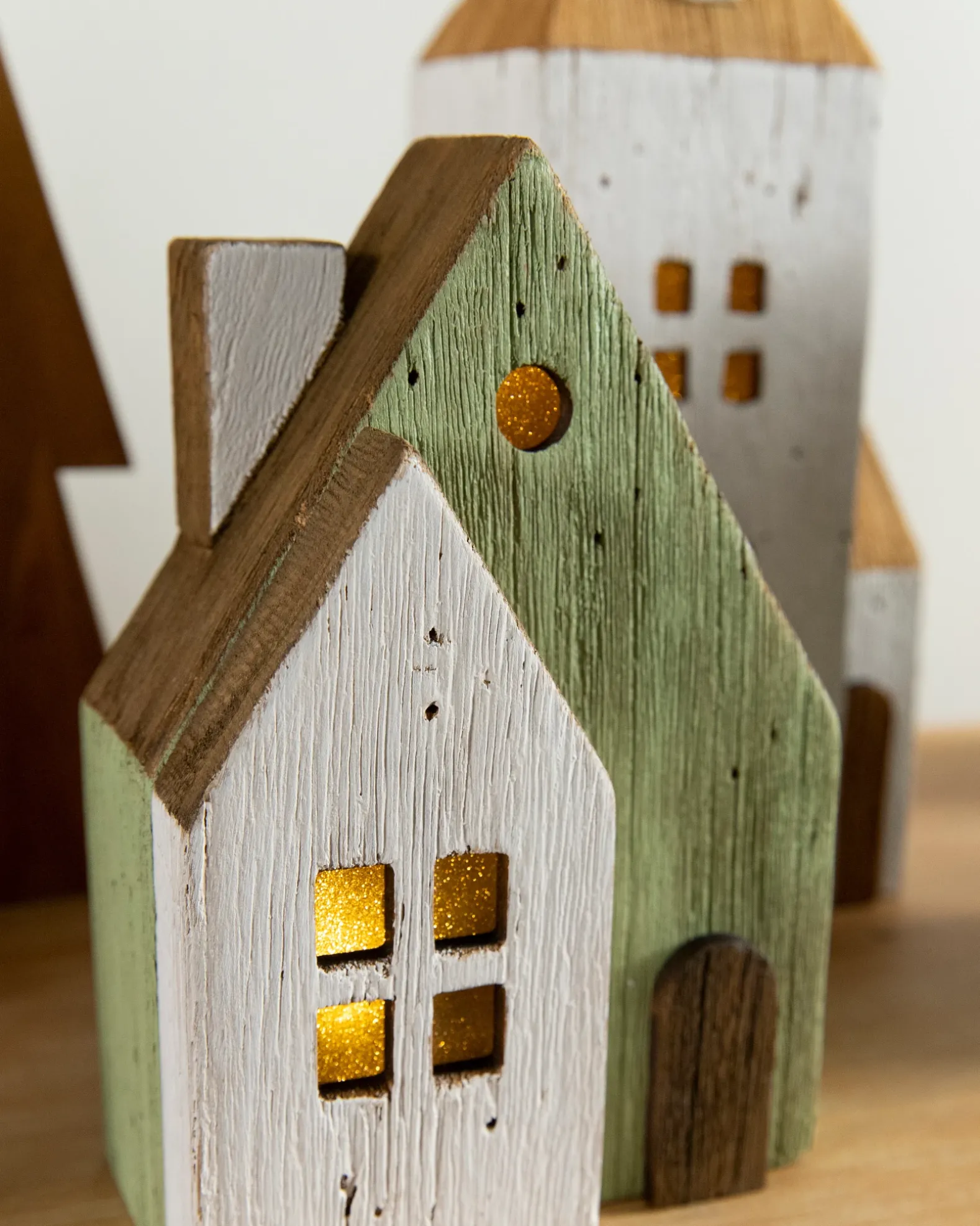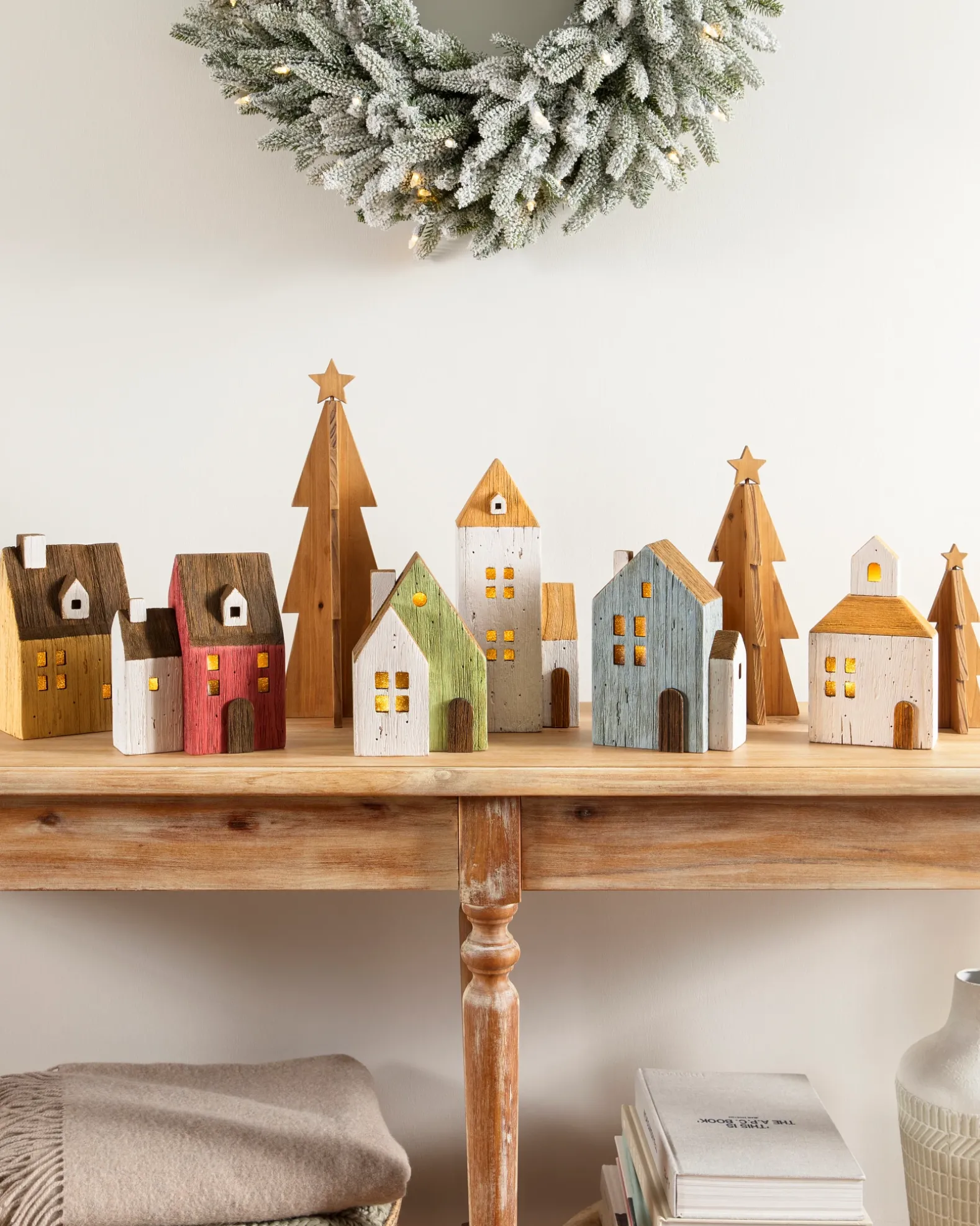 Create a charming holiday scene on your mantel or around your tree. This pre-lit wooden village collection captures the nostalgia of Christmases past.