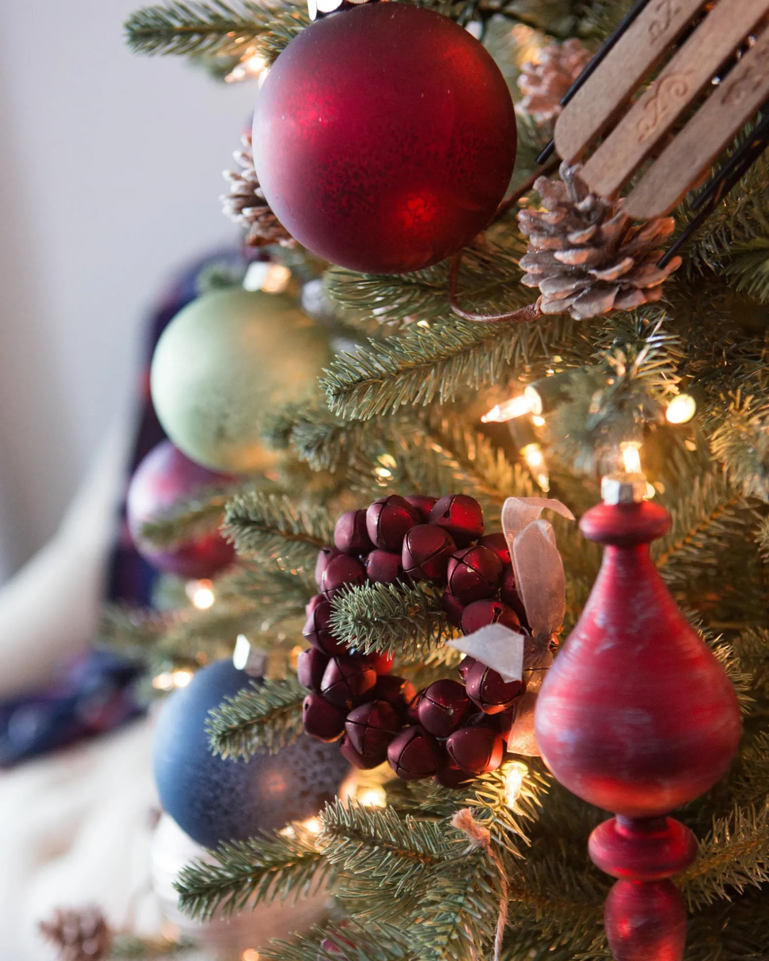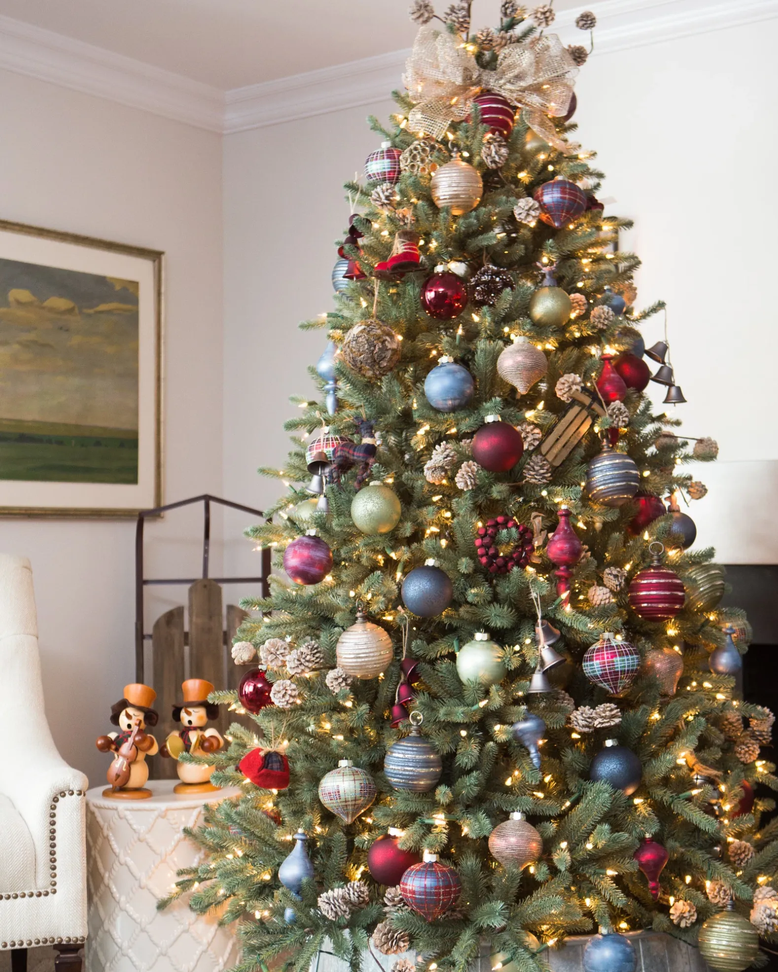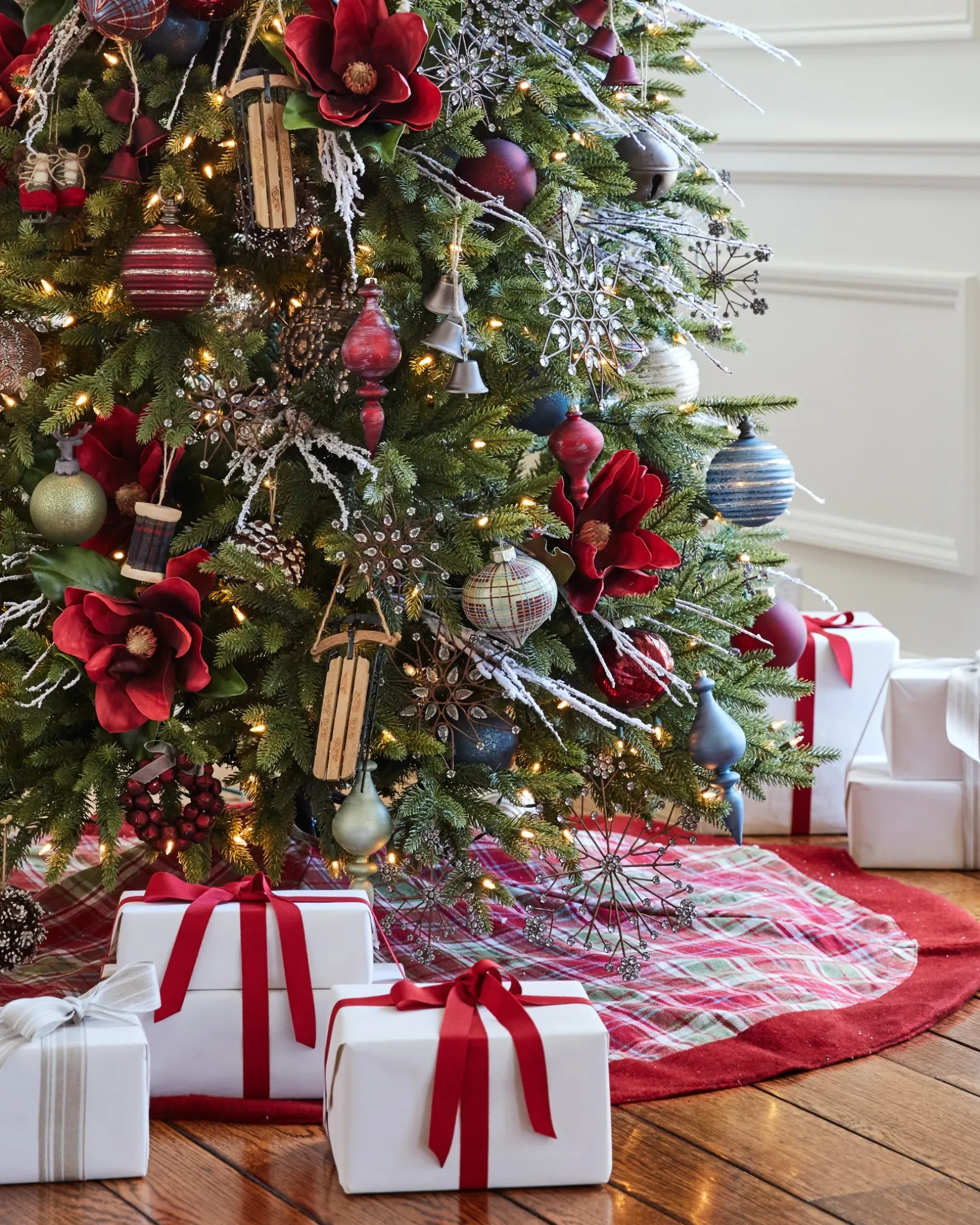 Spruce up your tree with an assortment of charming rustic ornaments. This eclectic mix of miniature sleds and ice skates, vintage sleigh bells, wooden villages, and fabric reindeers creates a cozy countryside look.