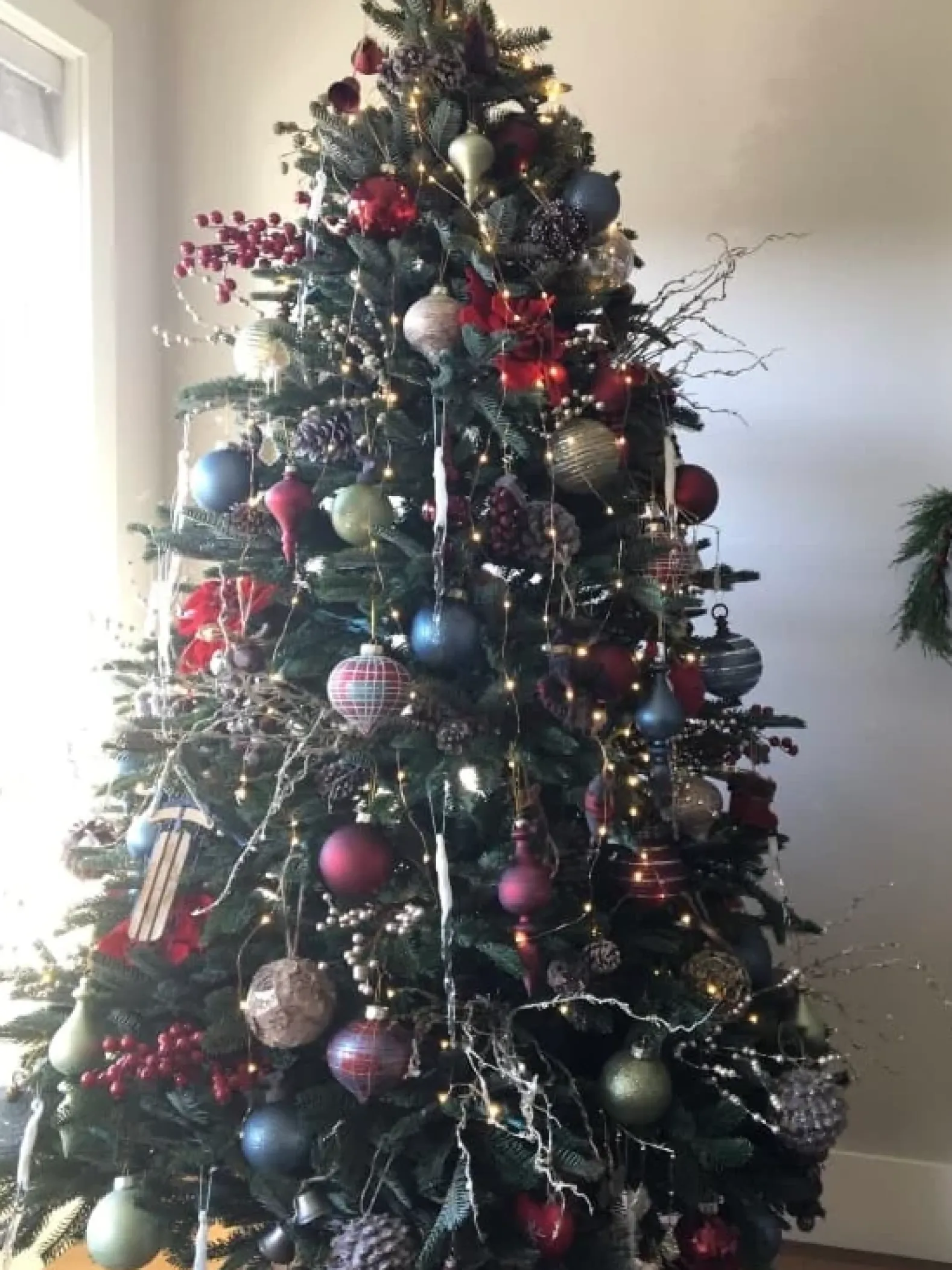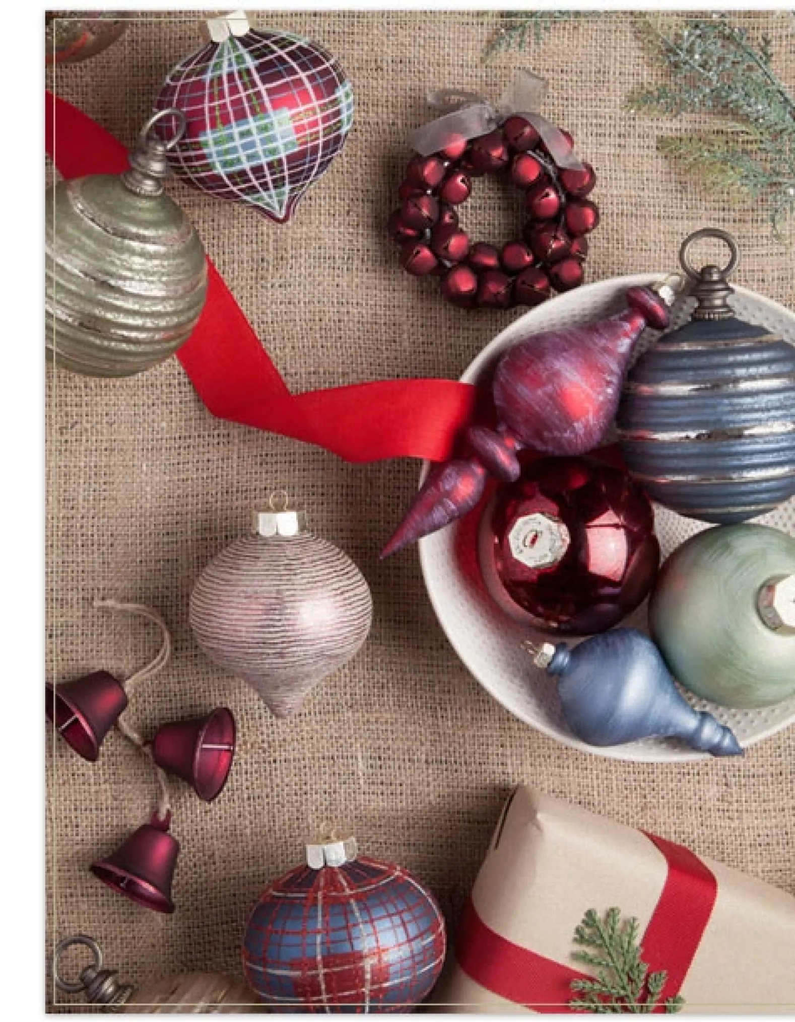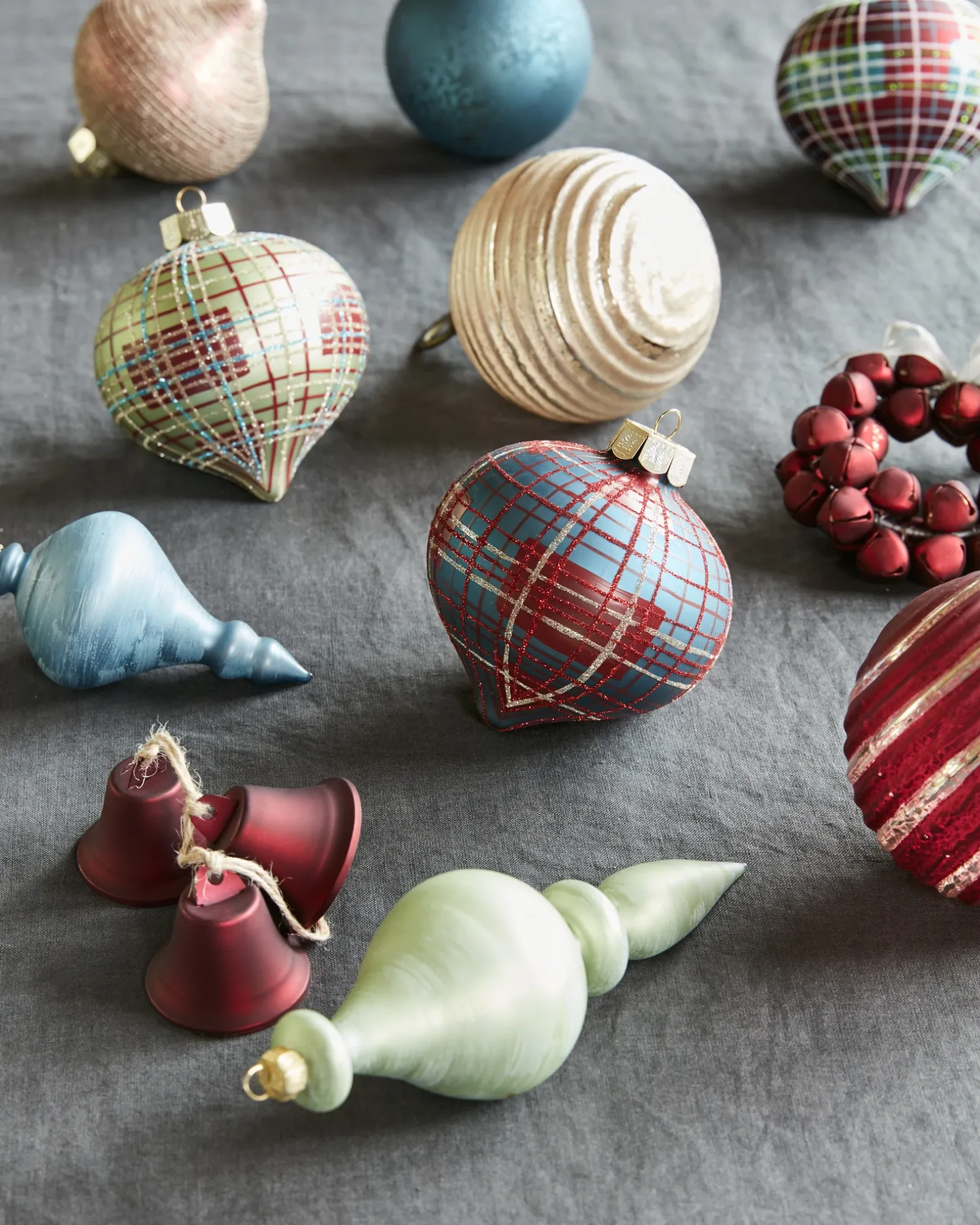 - Feature mouth-blown glass ornaments in red, blue, and green hues with glitter finish and plaid patterns