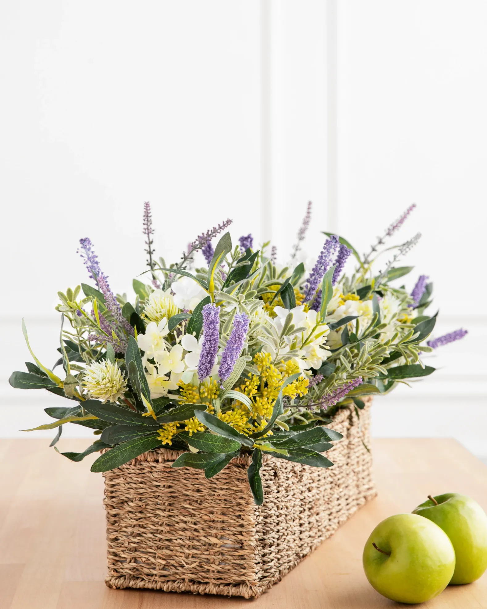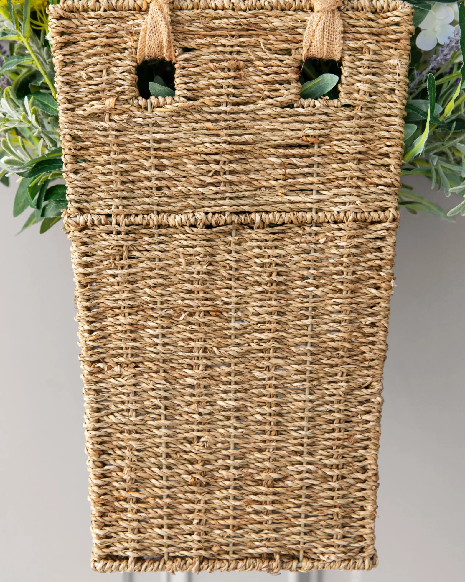 - Set in a woven seagrass basket that measures 21″ long x 9″ wide x 12.5″ high