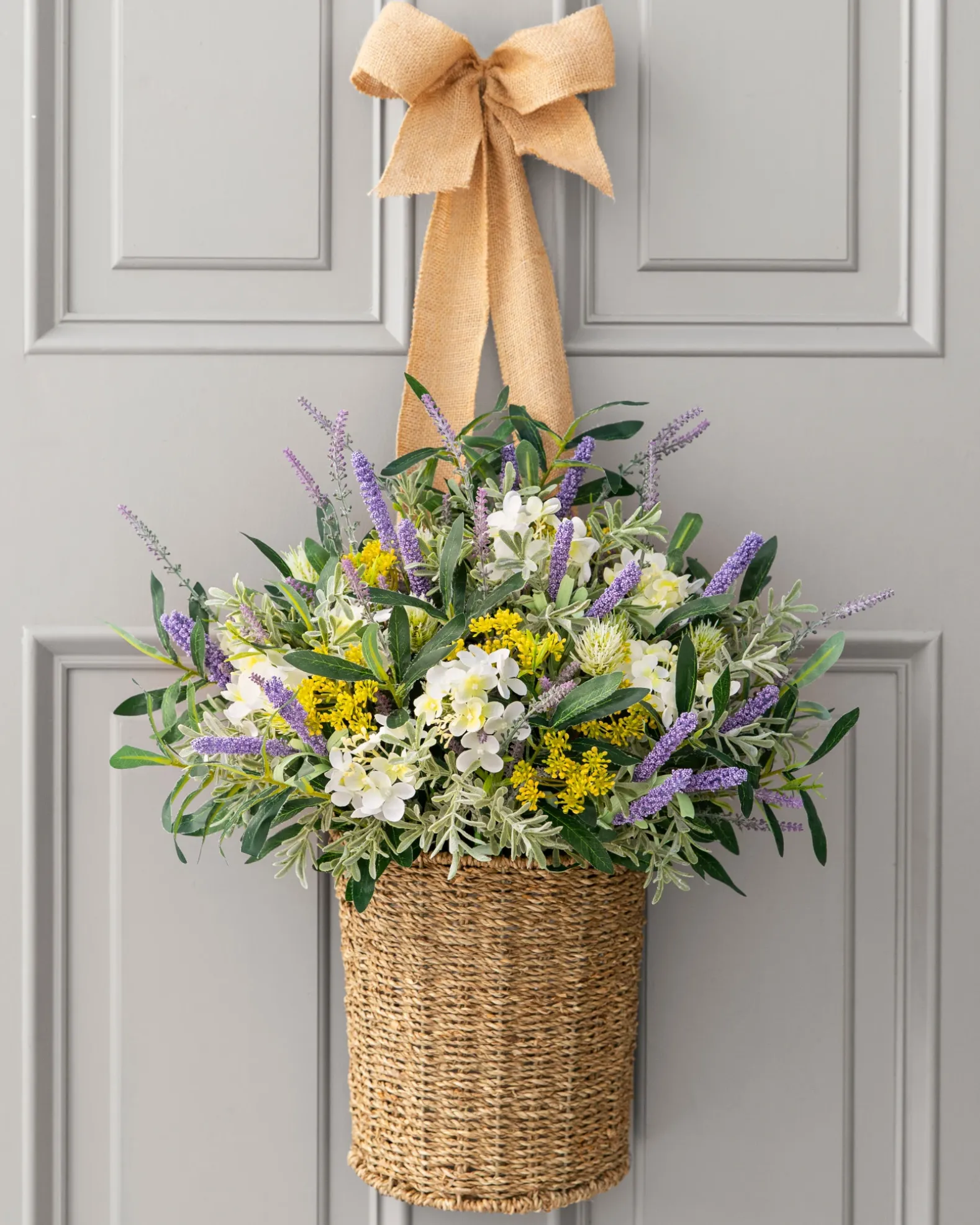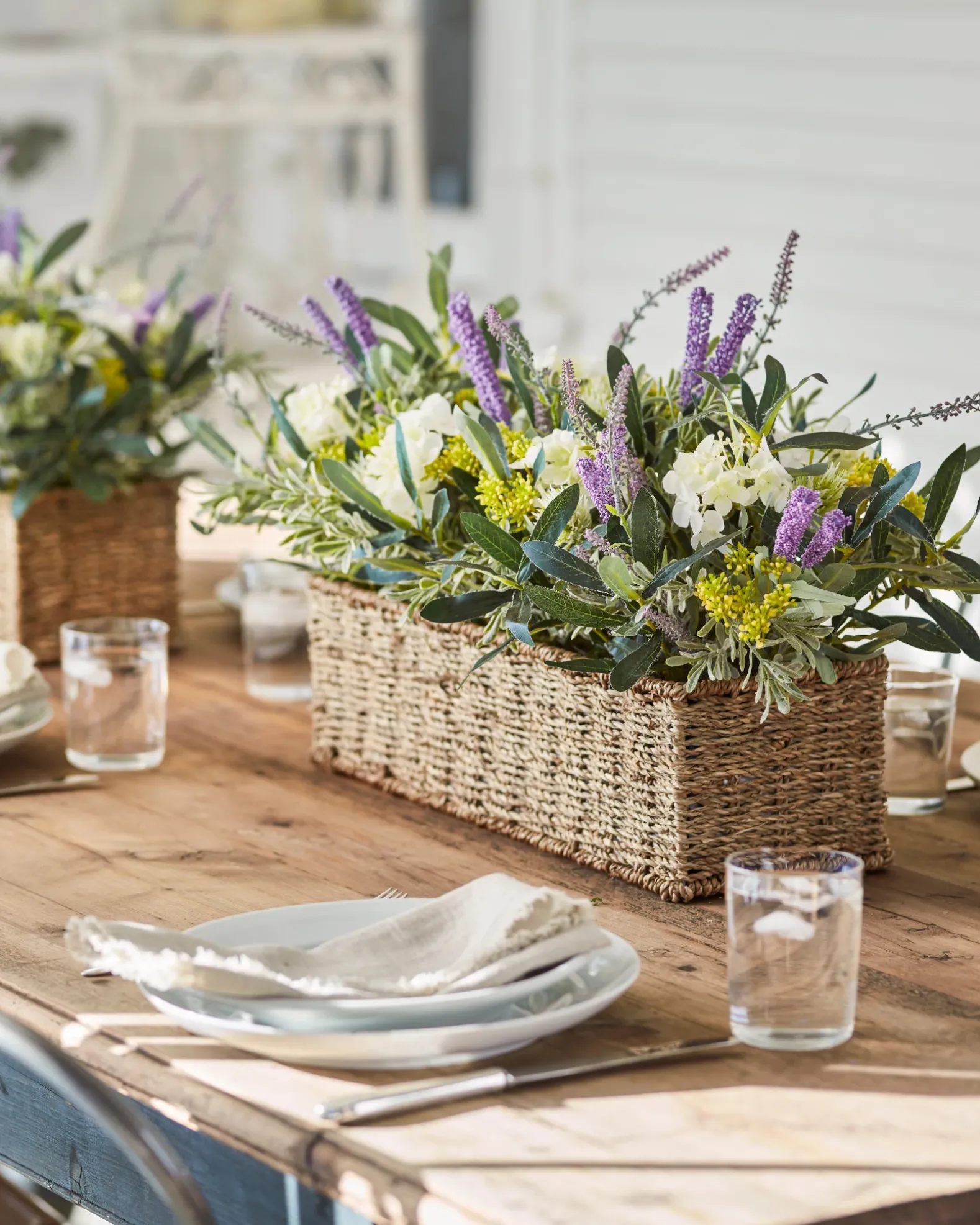 - All products in this collection feature an array of faux flowers, including purple cattails, white lilacs, and thistle with mixed greenery