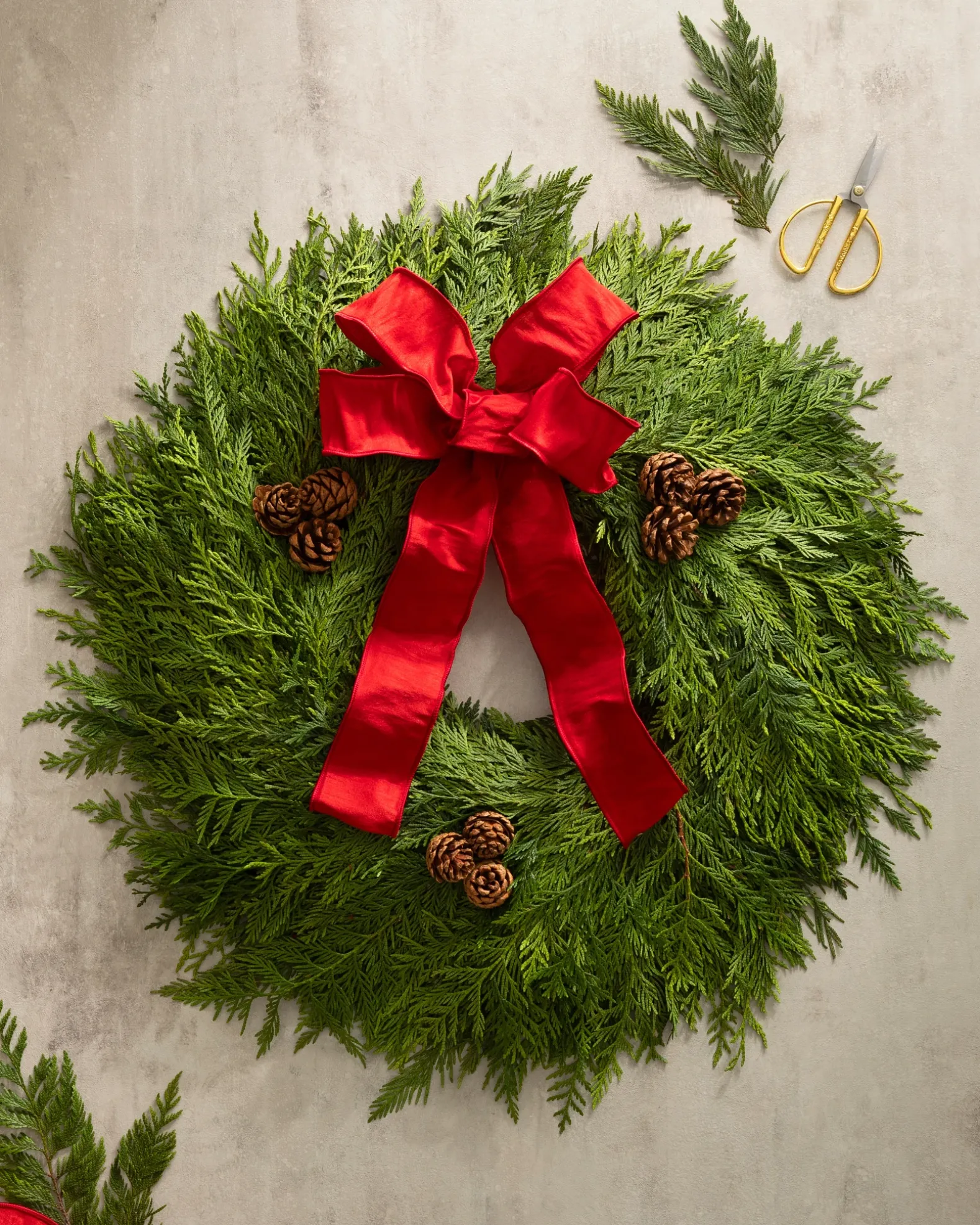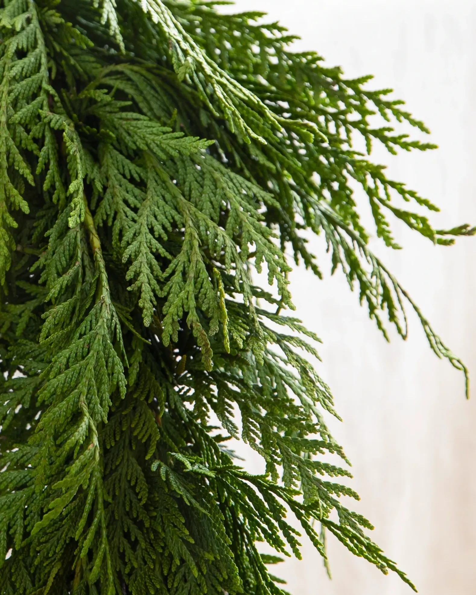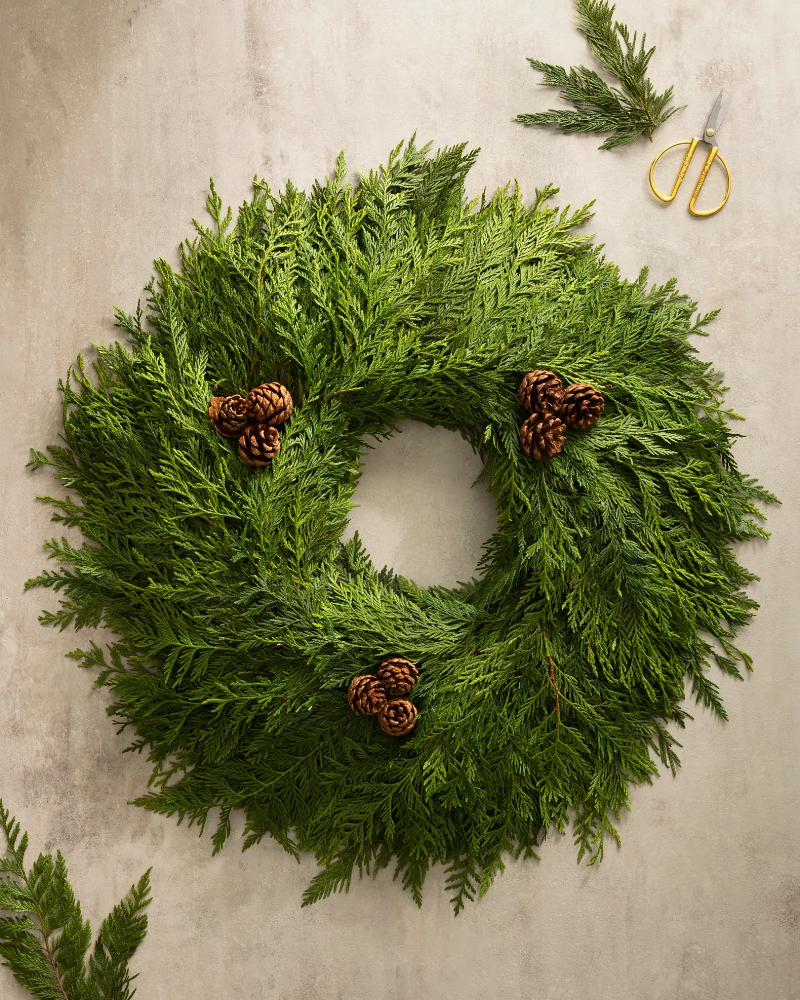 - All products in this collection feature fresh cedar foliage and pinecones.