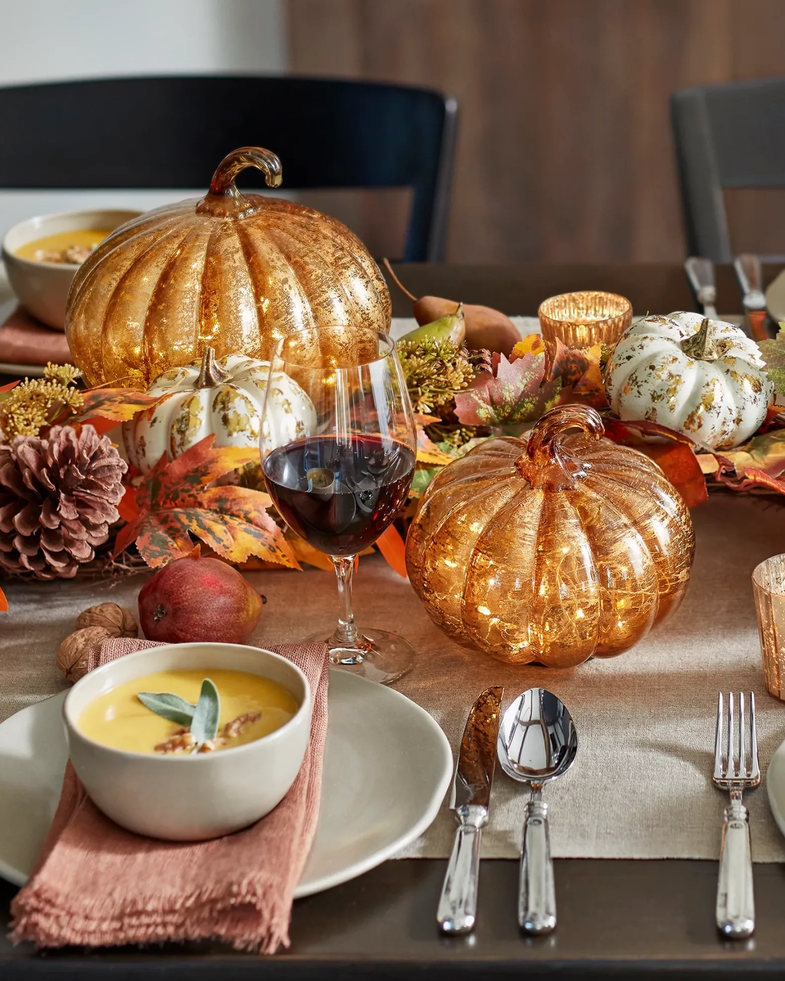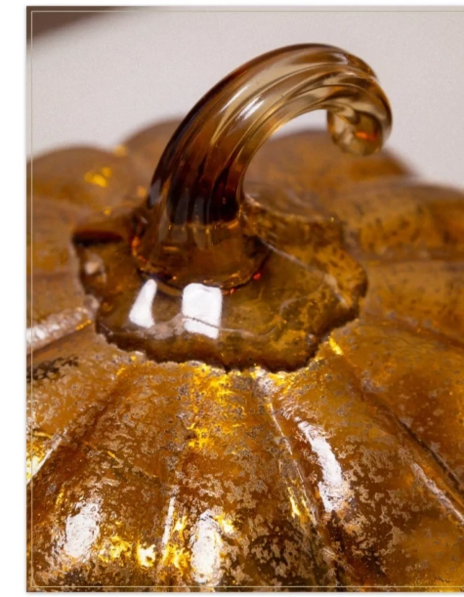 Give your fall décor a bright, modern look with elegant glass accents. An amber-tinted foil finish makes these pumpkins shimmer during the day, while fairy lights glimmer gracefully at night.