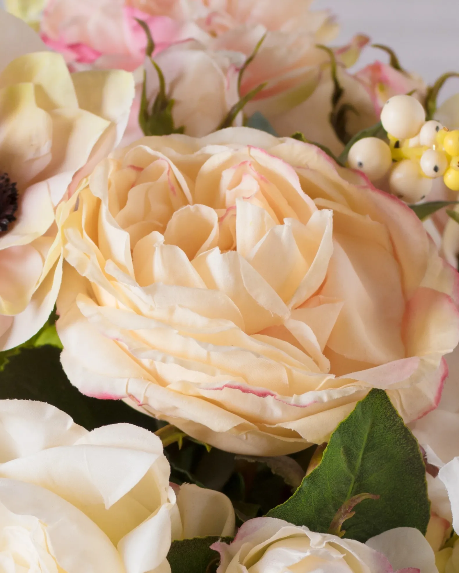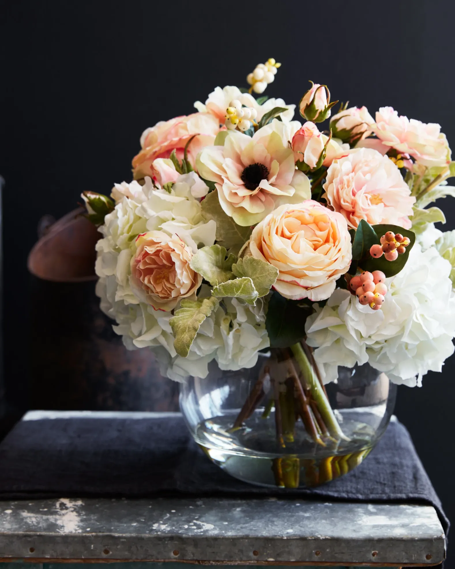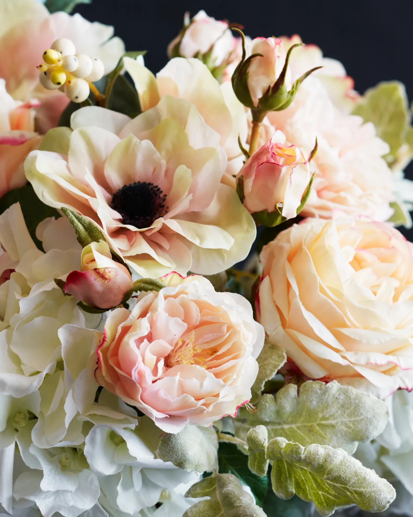 - Features a mix of hydrangeas, anemone, roses, and berries