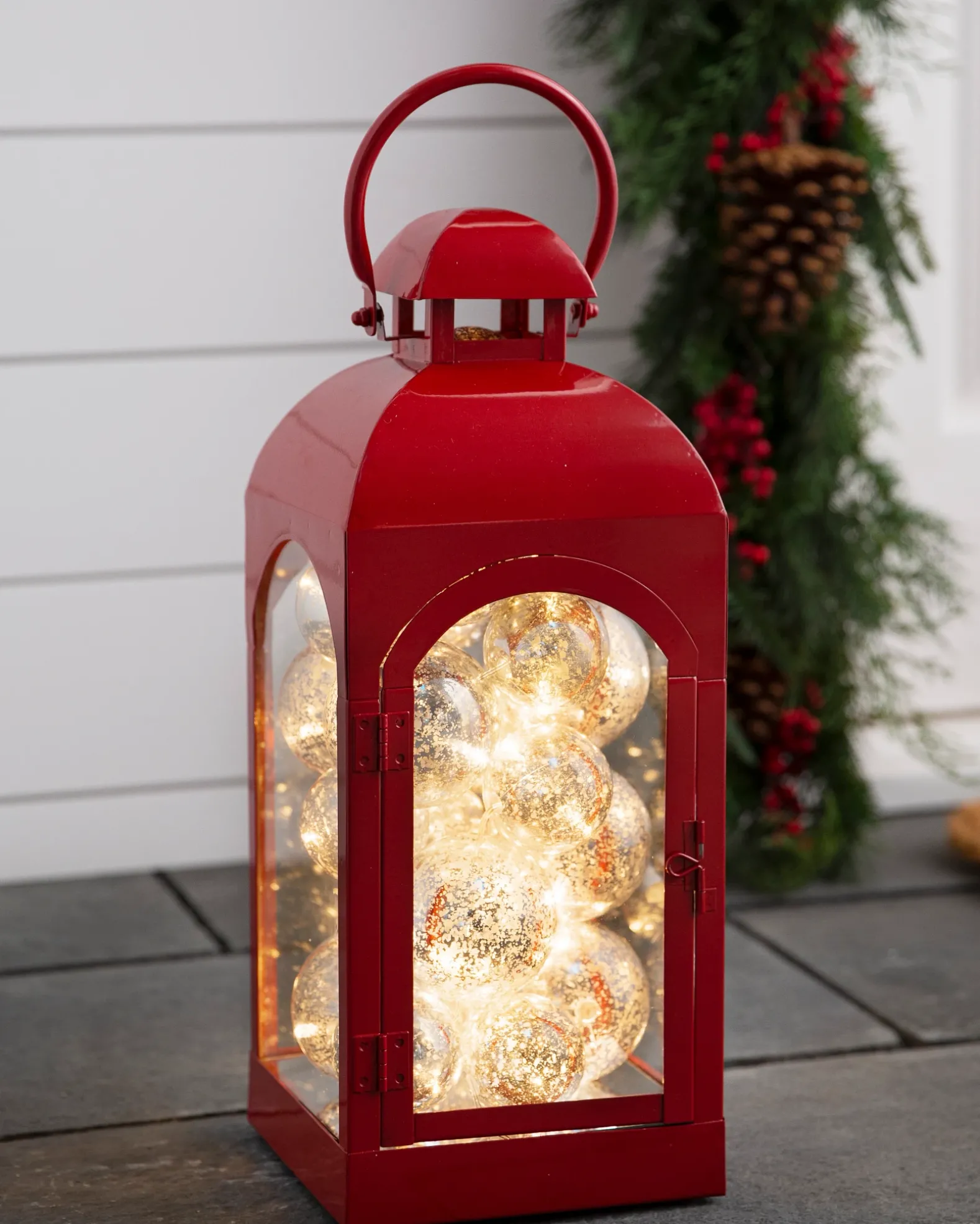 Set the scene for special occasions and cozy celebrations with this festive lantern. Fairy lights within glass ornaments add instant glow and cheer to any space.