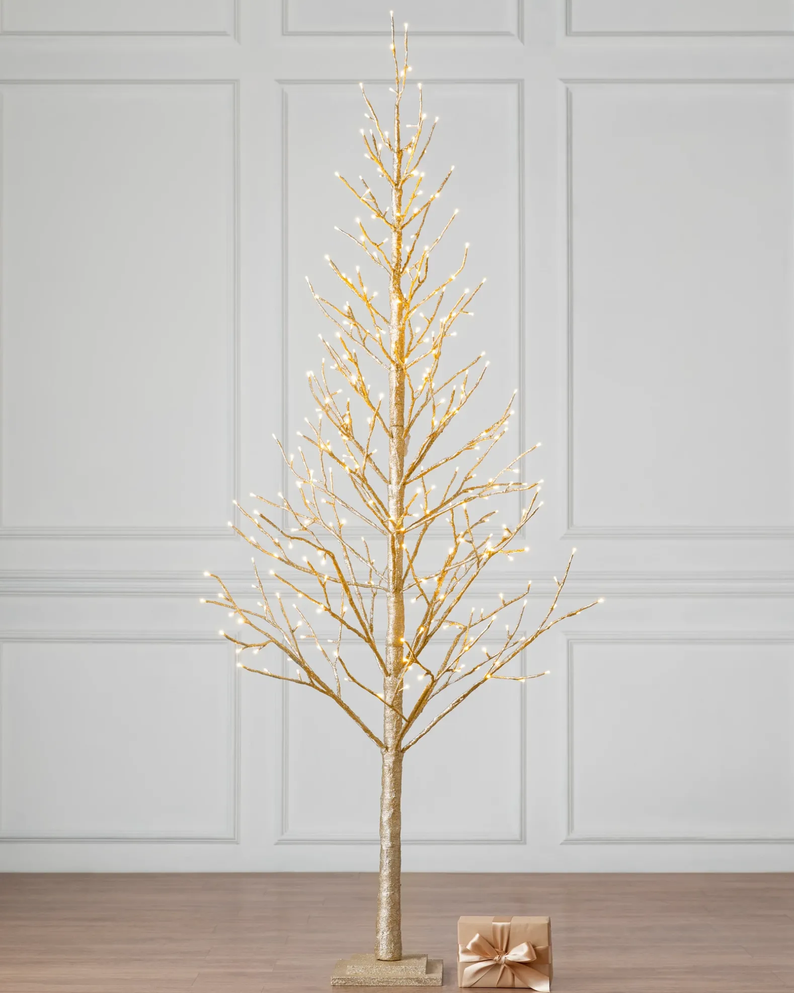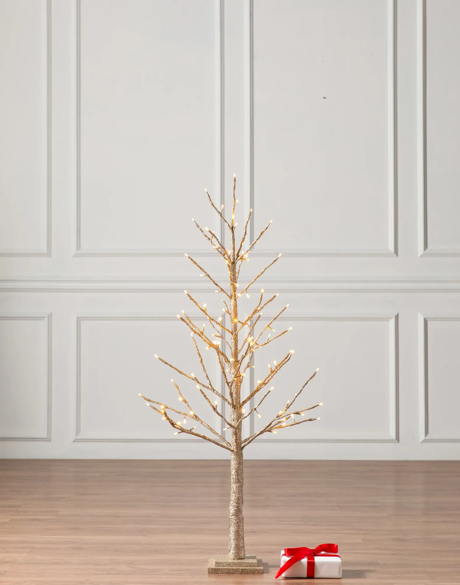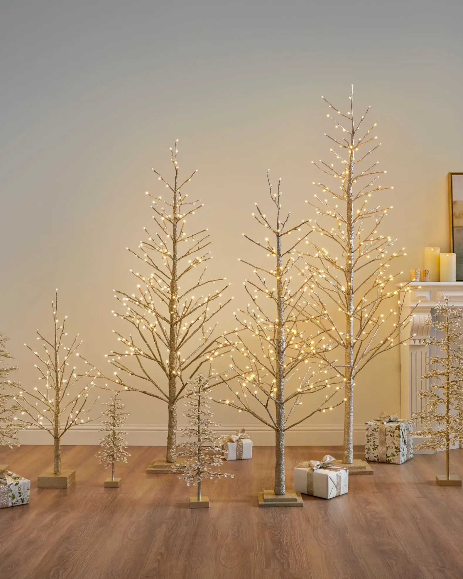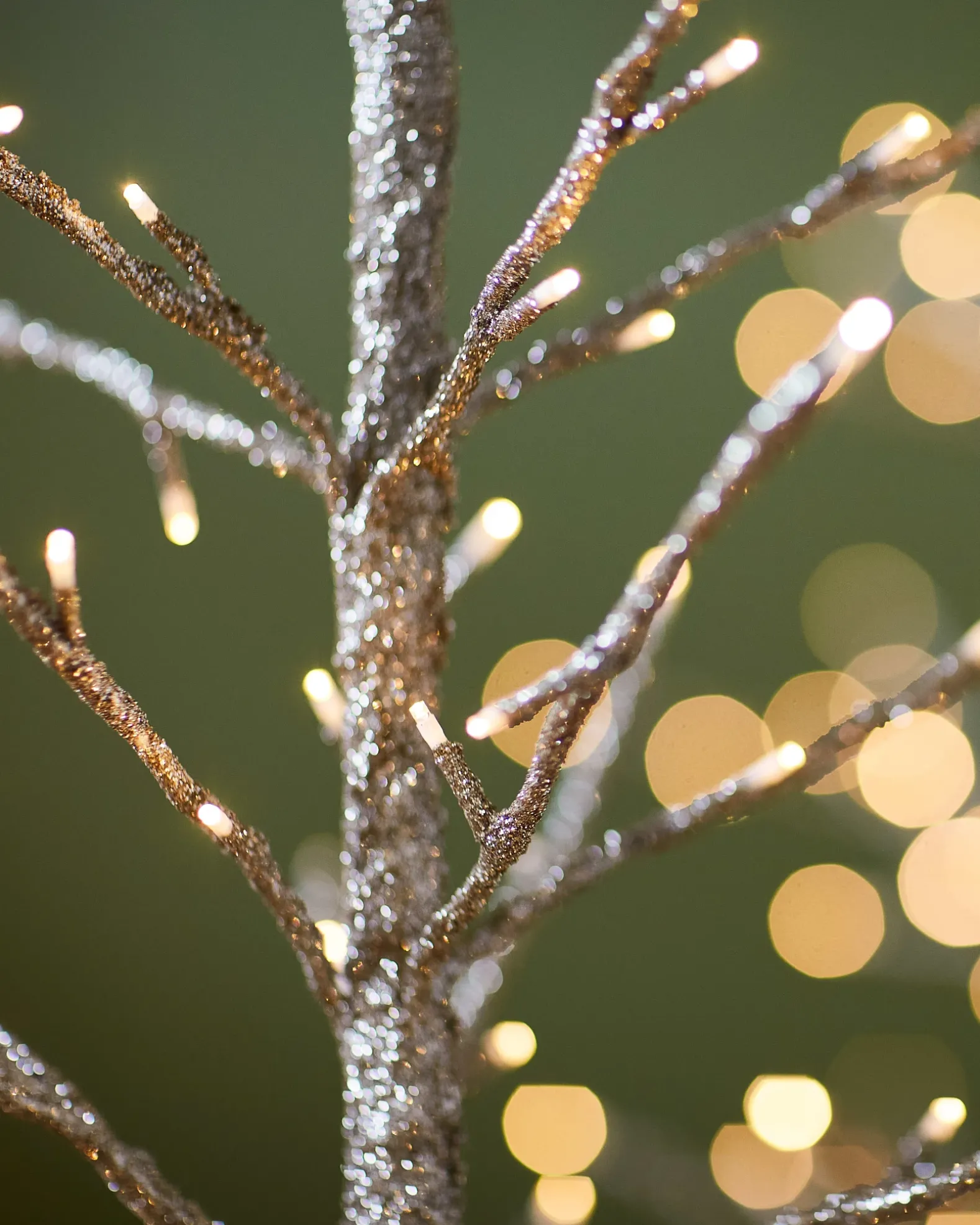 Elevate your holiday décor with the modern look of champagne twig trees. Enchanting LED lights glow to create the perfect ambience.