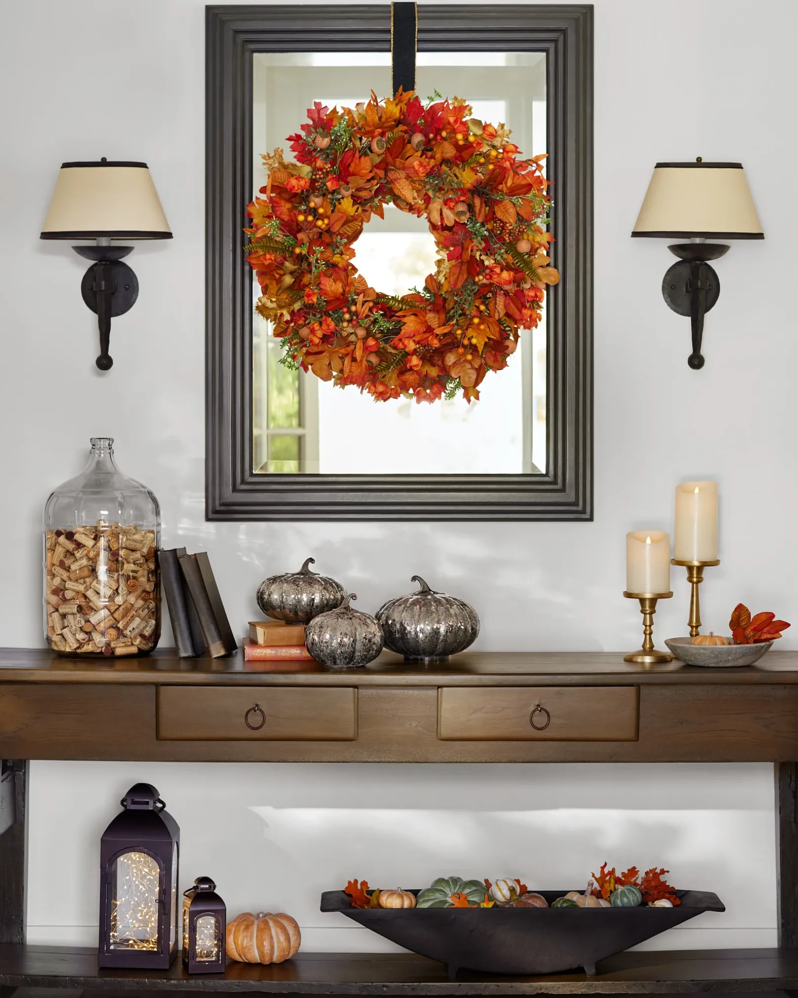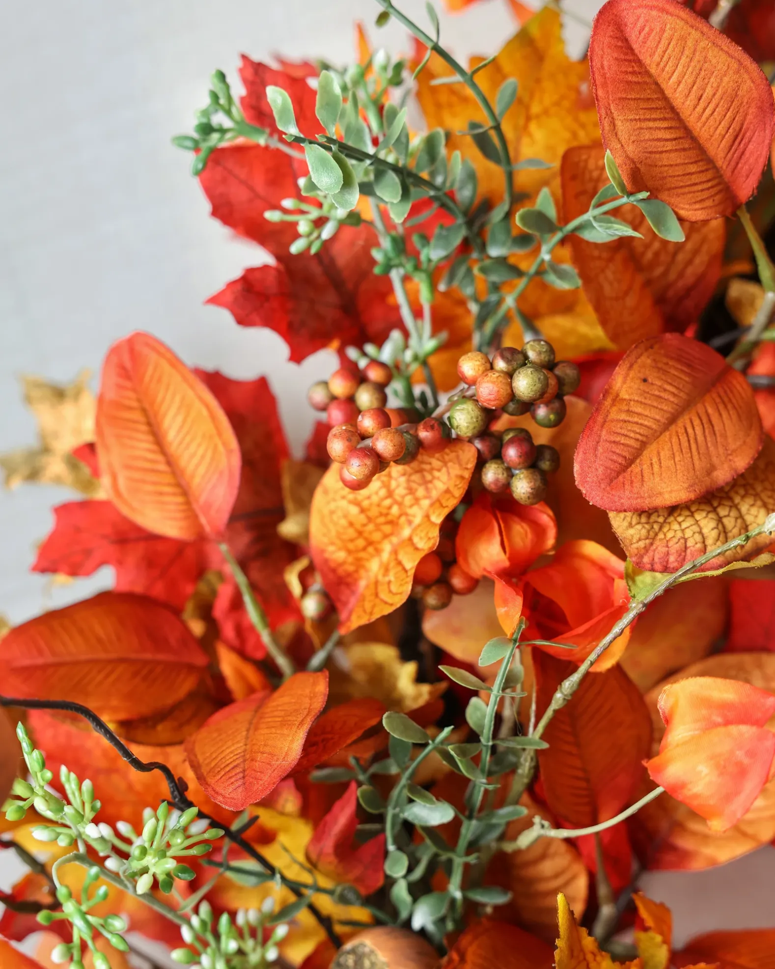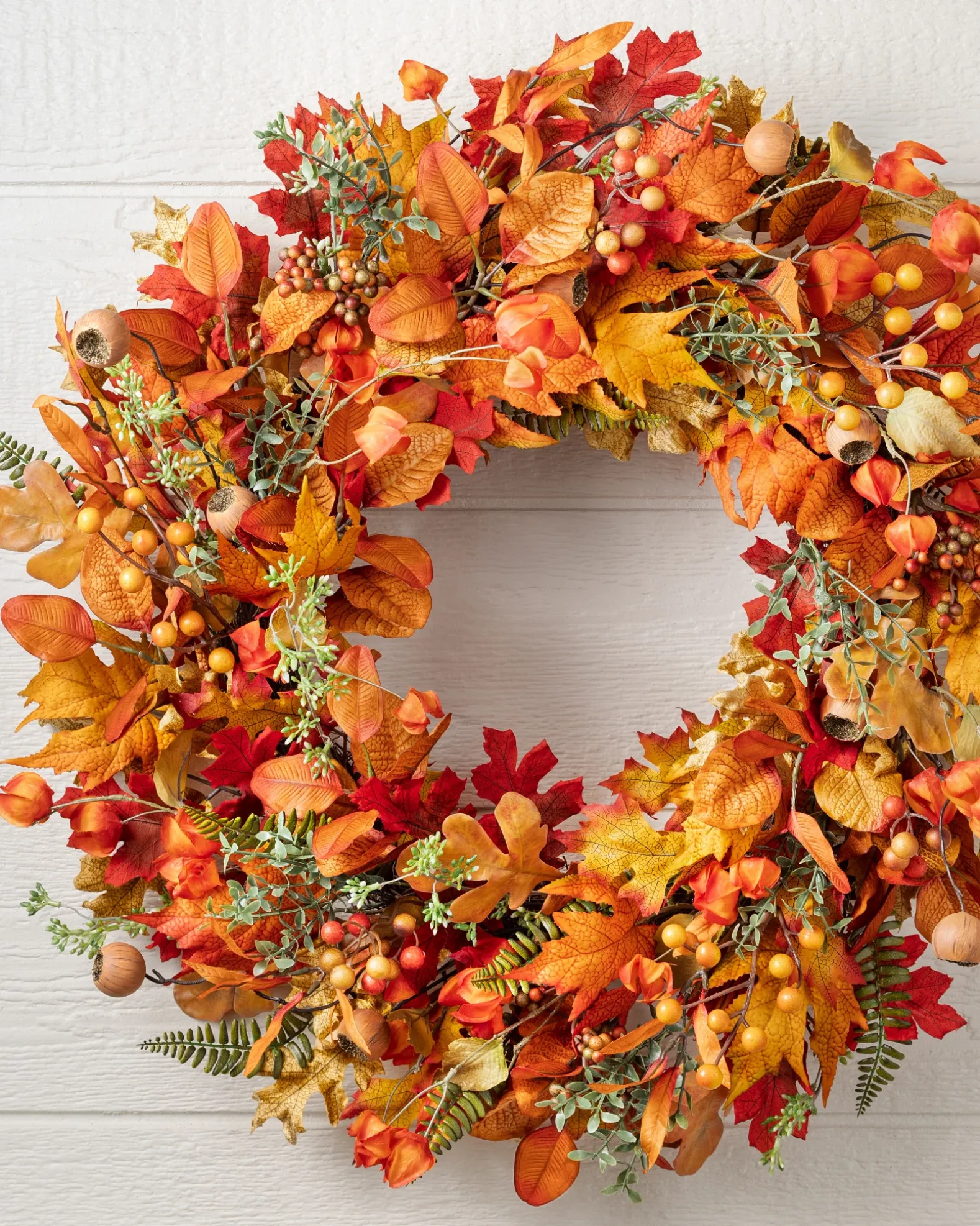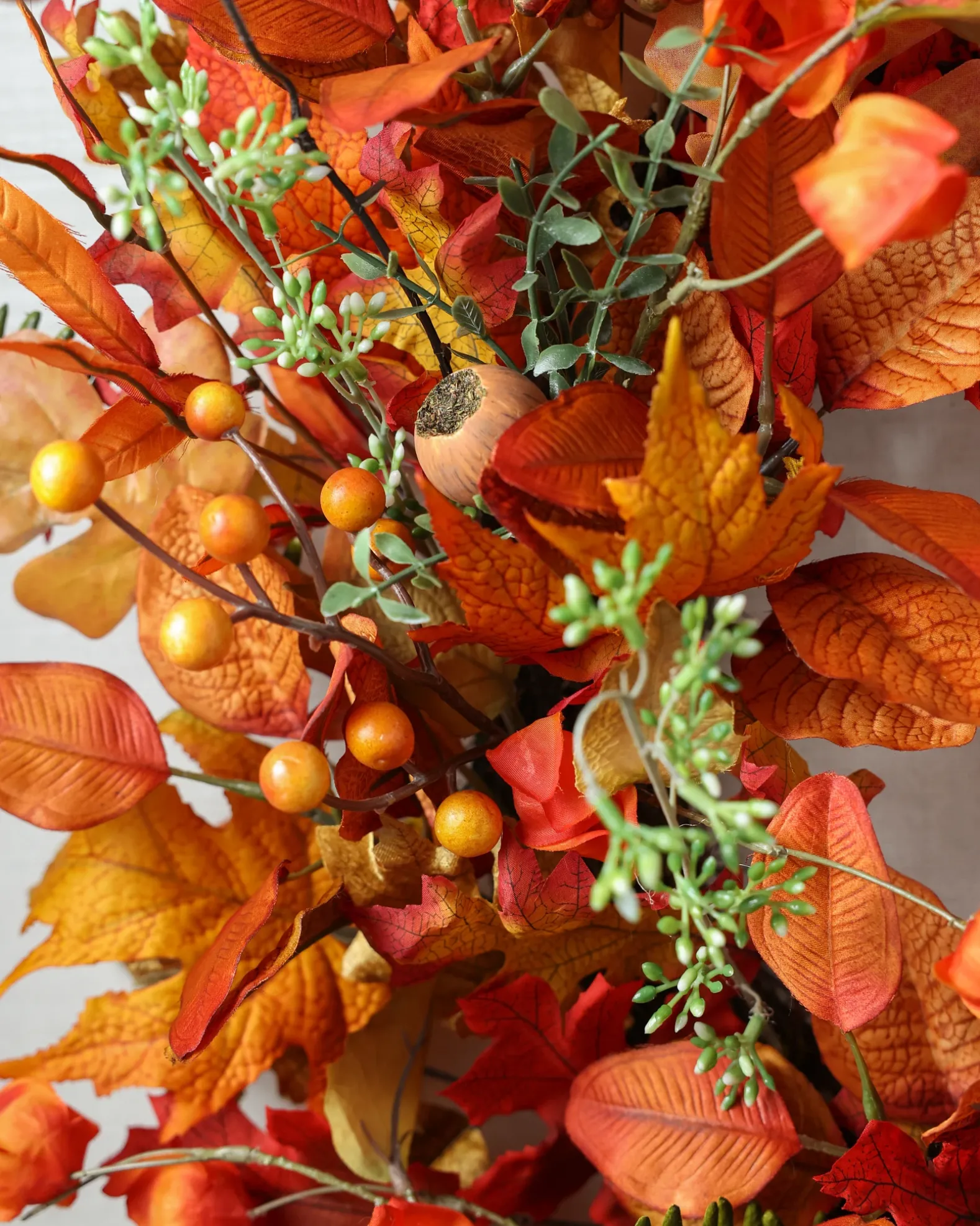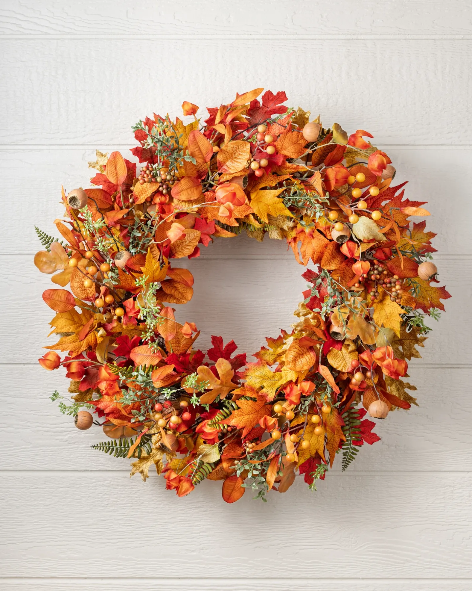 - All products in this collection feature Japanese lanterns, fall berries, and an assortment of greenery including olive, cedar, oak, and maple leaves.