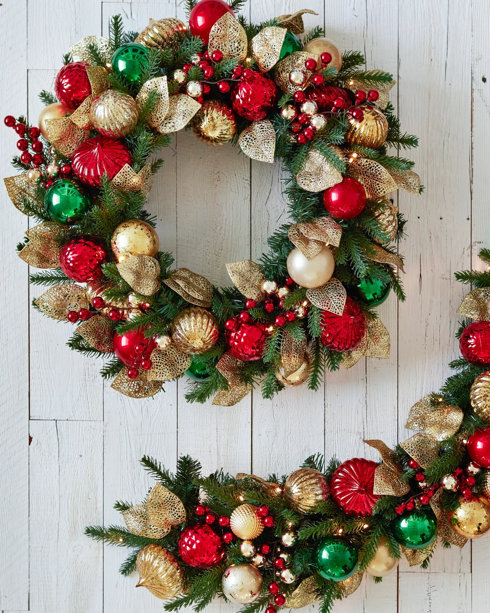 - All products in this collection feature gold glitter leaves, red and gold berry sprays, and red, green, and gold shatter-resistant ornaments.