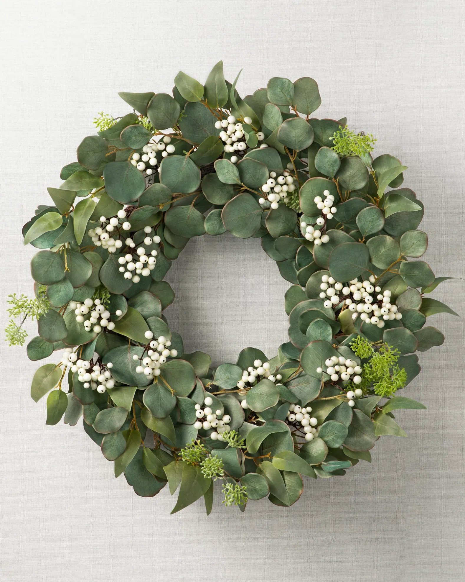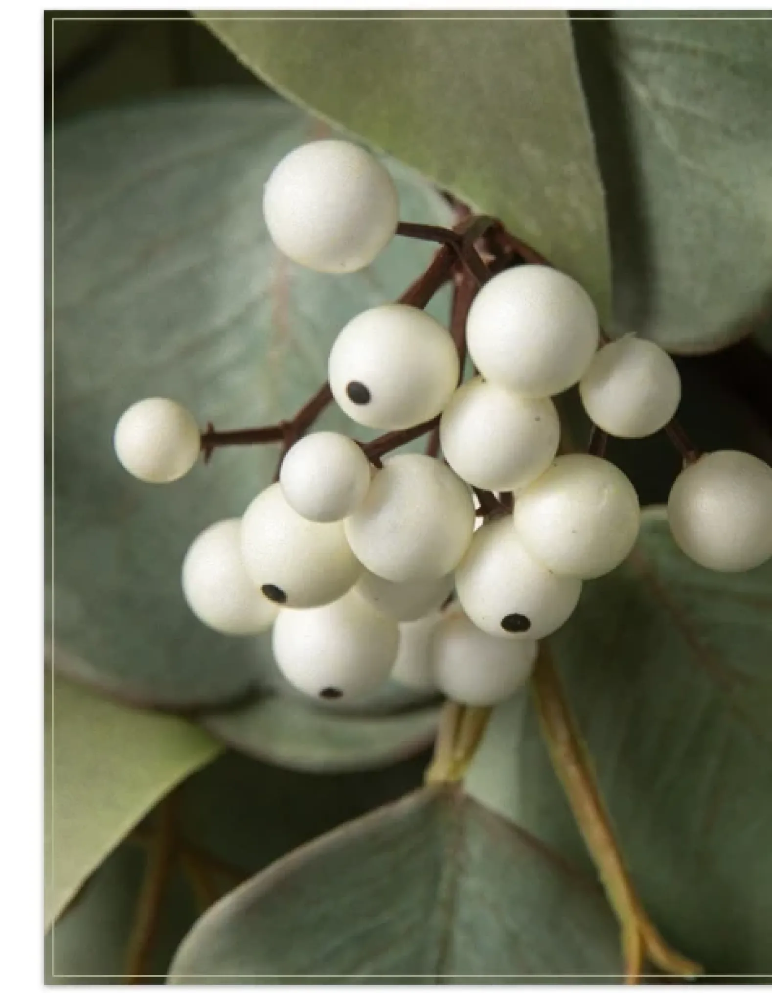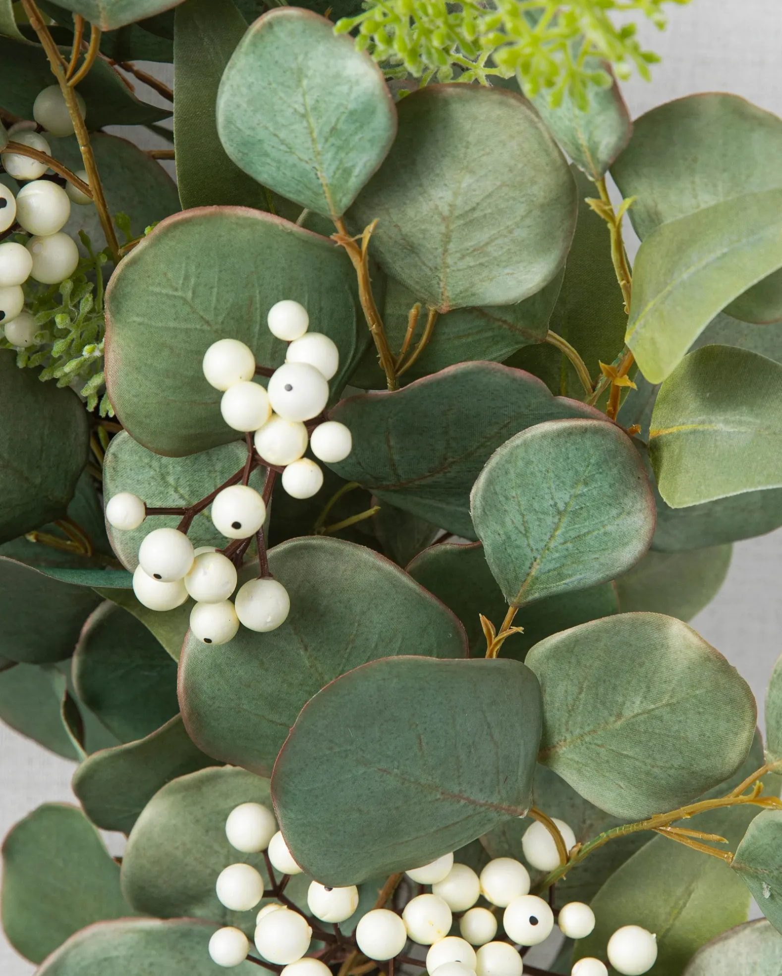 - All products in this collection feature an array of seeded, silver dollar, and willow eucalyptus leaves accented with ivory berries