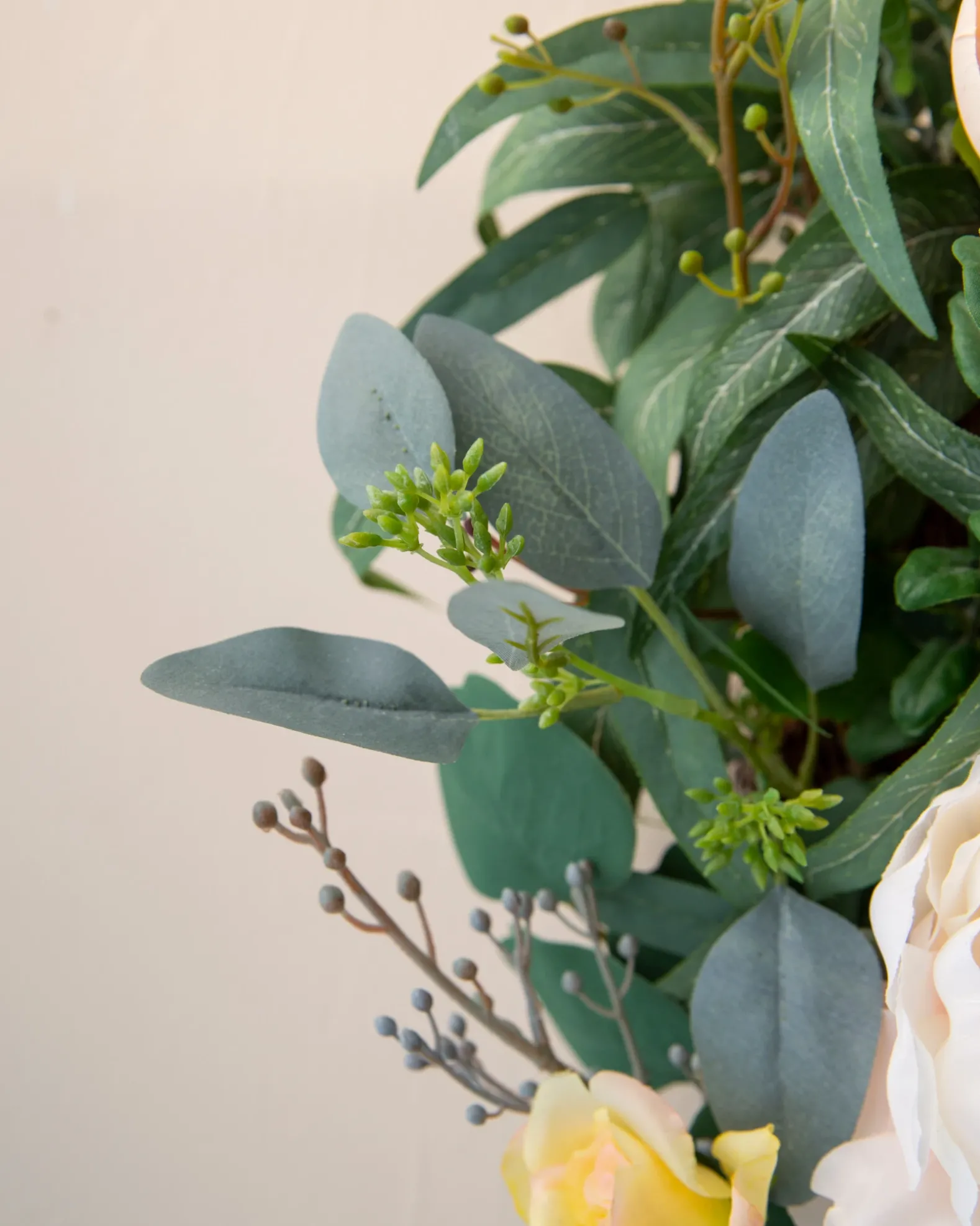 - Features peonies, dahlias, roses, and berries with buxus, eucalyptus, olive, and money leaves