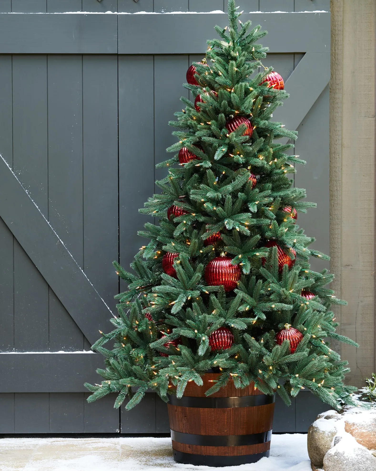 Showcasing forest-green foliage, long, tapered tips, and hand-painted stems, the Oakville Outdoor Tree calls to mind scenic views of Napa Valley’s tree-lined mountains. A mix of True Needle® and Classic Needle tips gives this narrow-shaped tree a lifelike look, allowing it to blend beautifully with natural outdoor surroundings.