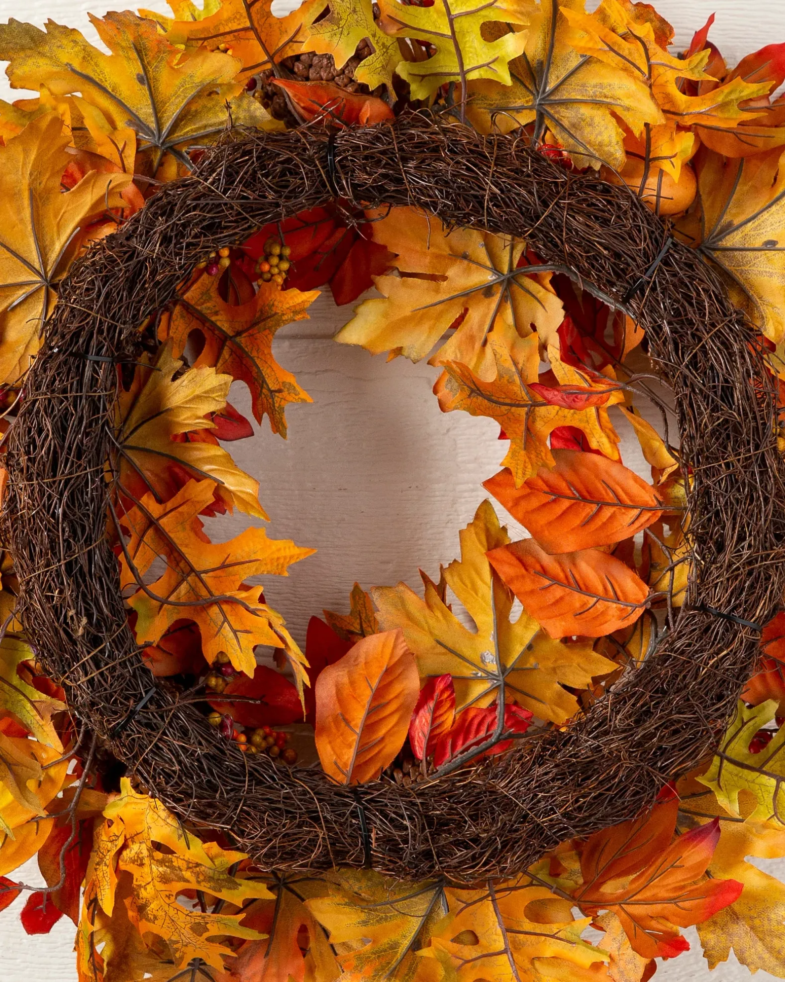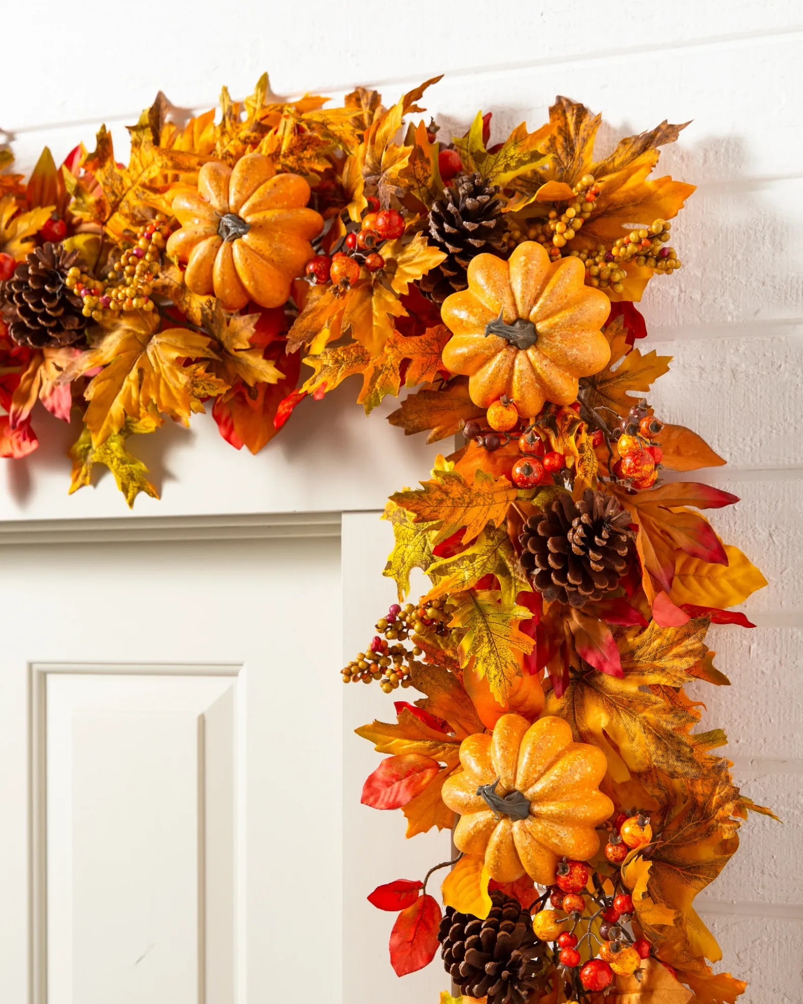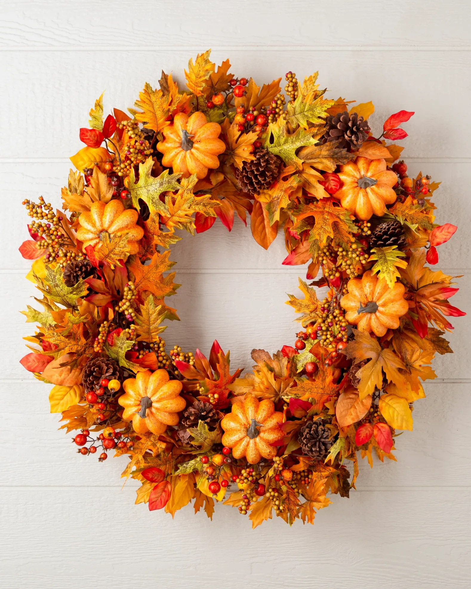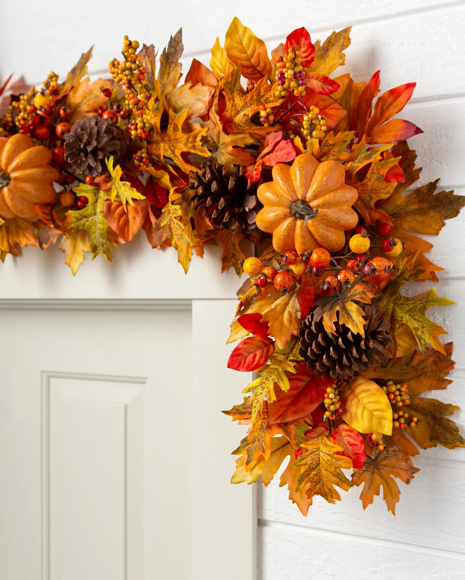 - All products in this collection feature an array of pumpkins, pinecones, orange berries, small berry clusters, and a mix of marble, oak, peony, and magnolia leaves