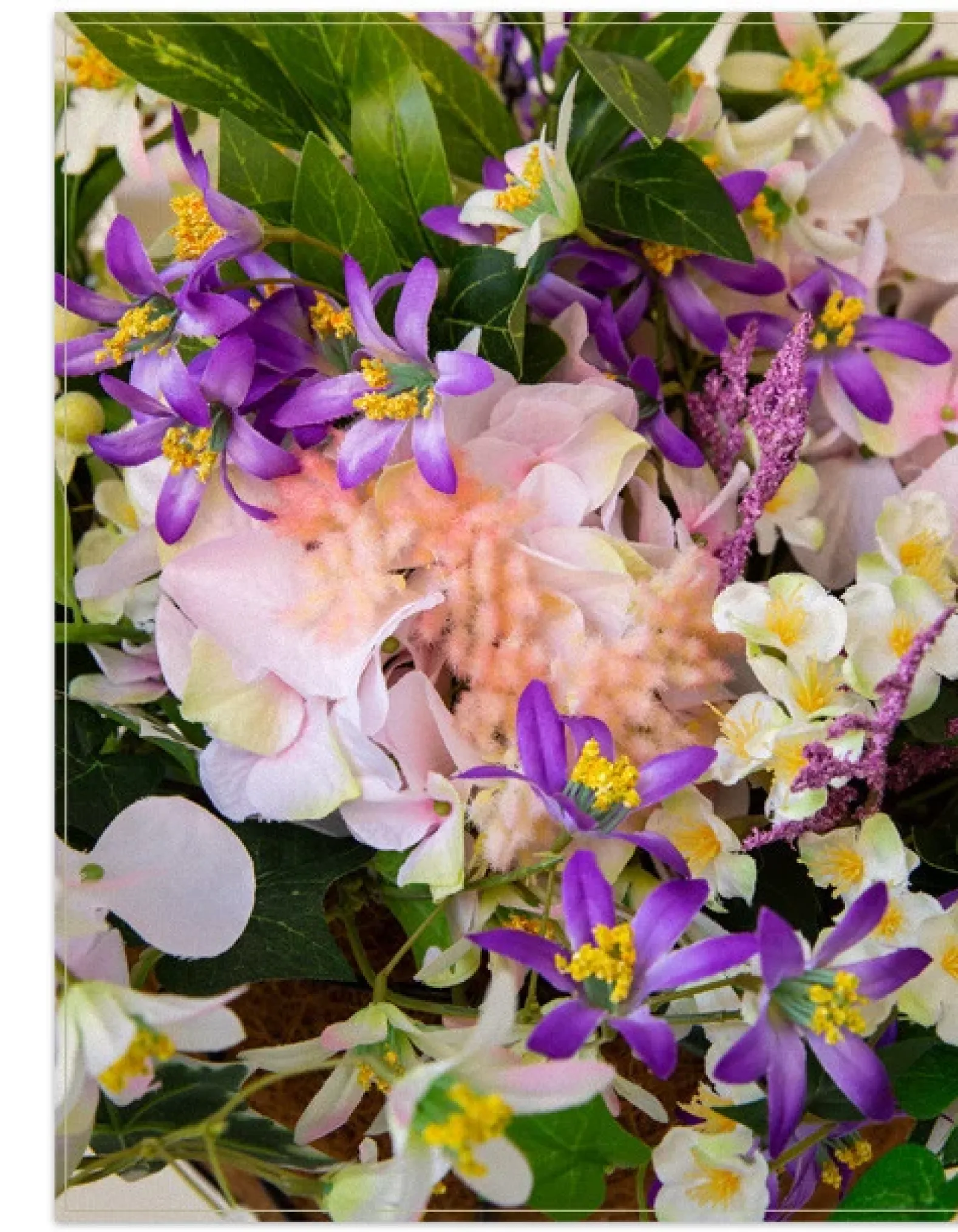 - All products in this collection feature an array of faux foliage, including: variegated ivy, mini grape leaves, foam berries, faux green moss, and pothos leaves