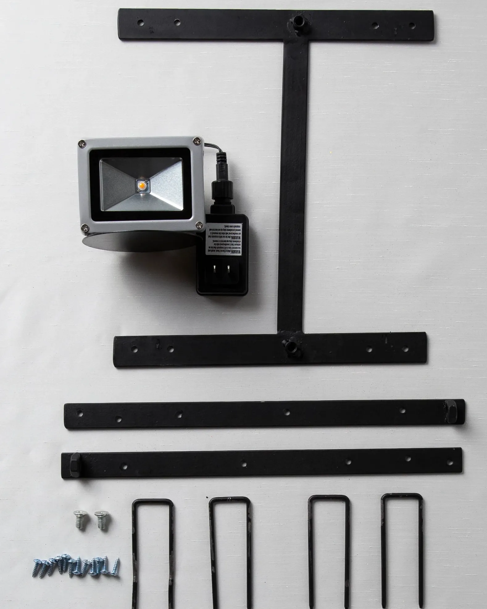 - Comes with one orange LED spotlight that features an 8′ plug-in cord