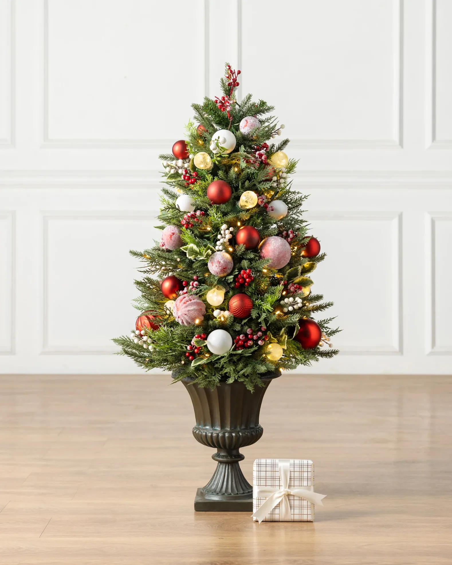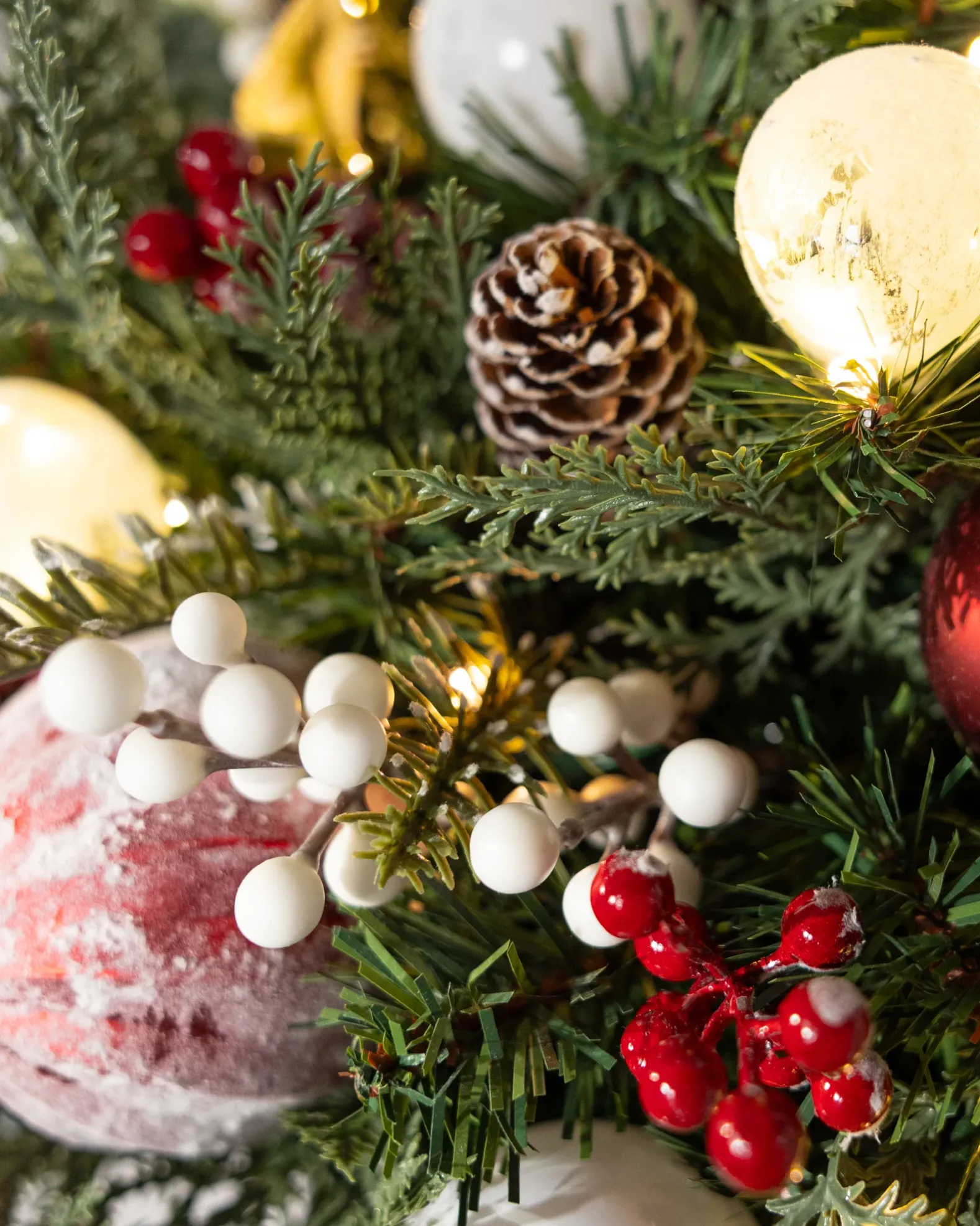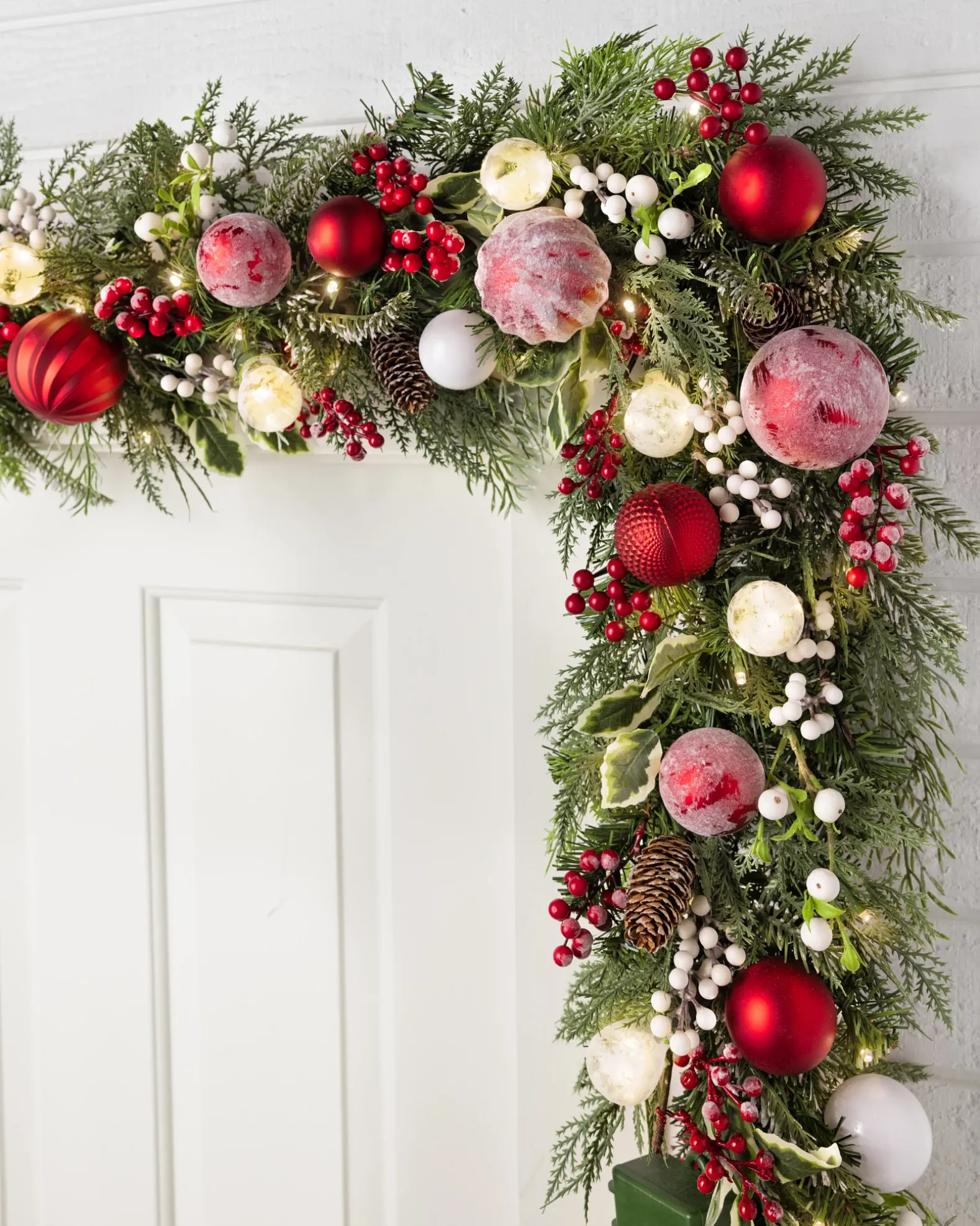 Classic red and white accents on lifelike greenery never go out of style. Combine with similar themed décor to complete your Scandinavian holiday look.