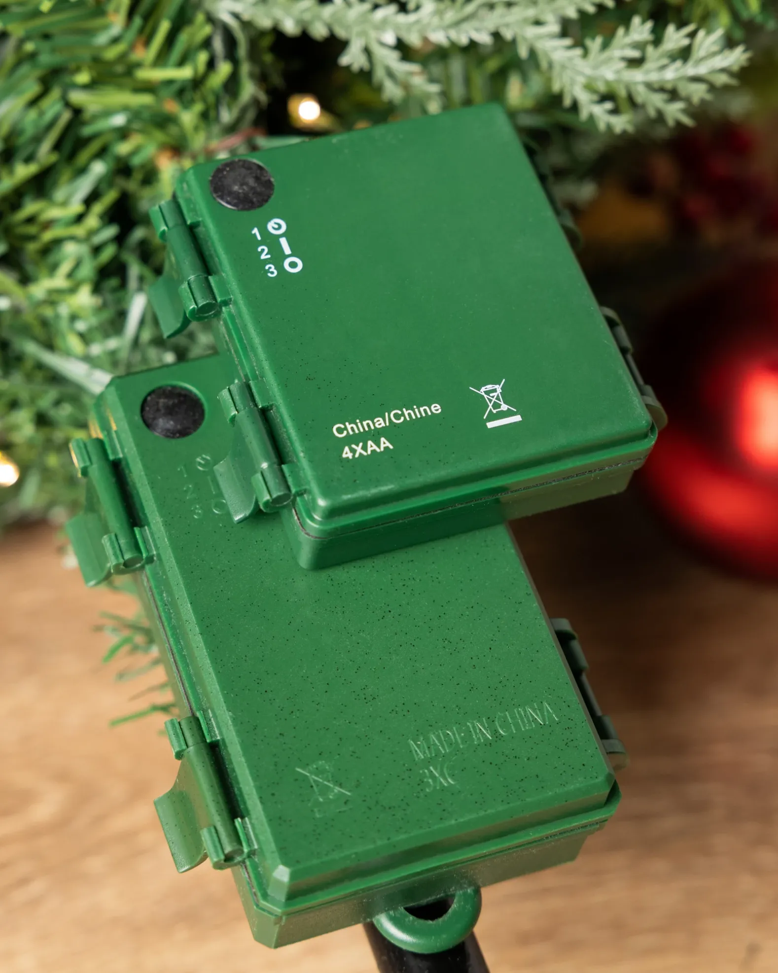 - Battery-operated lights include a built-in timer; 6 hours on, 18 hours off