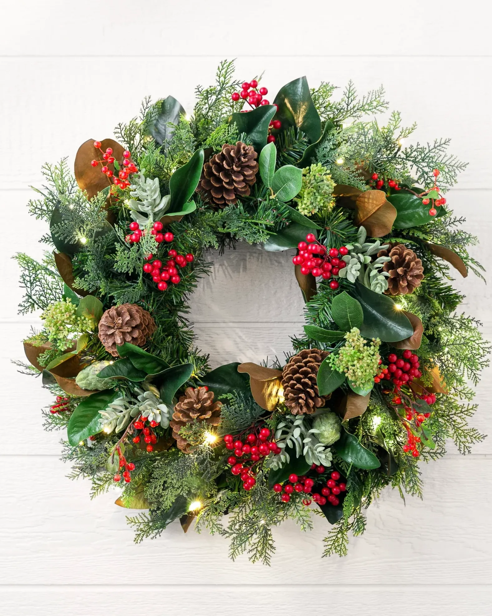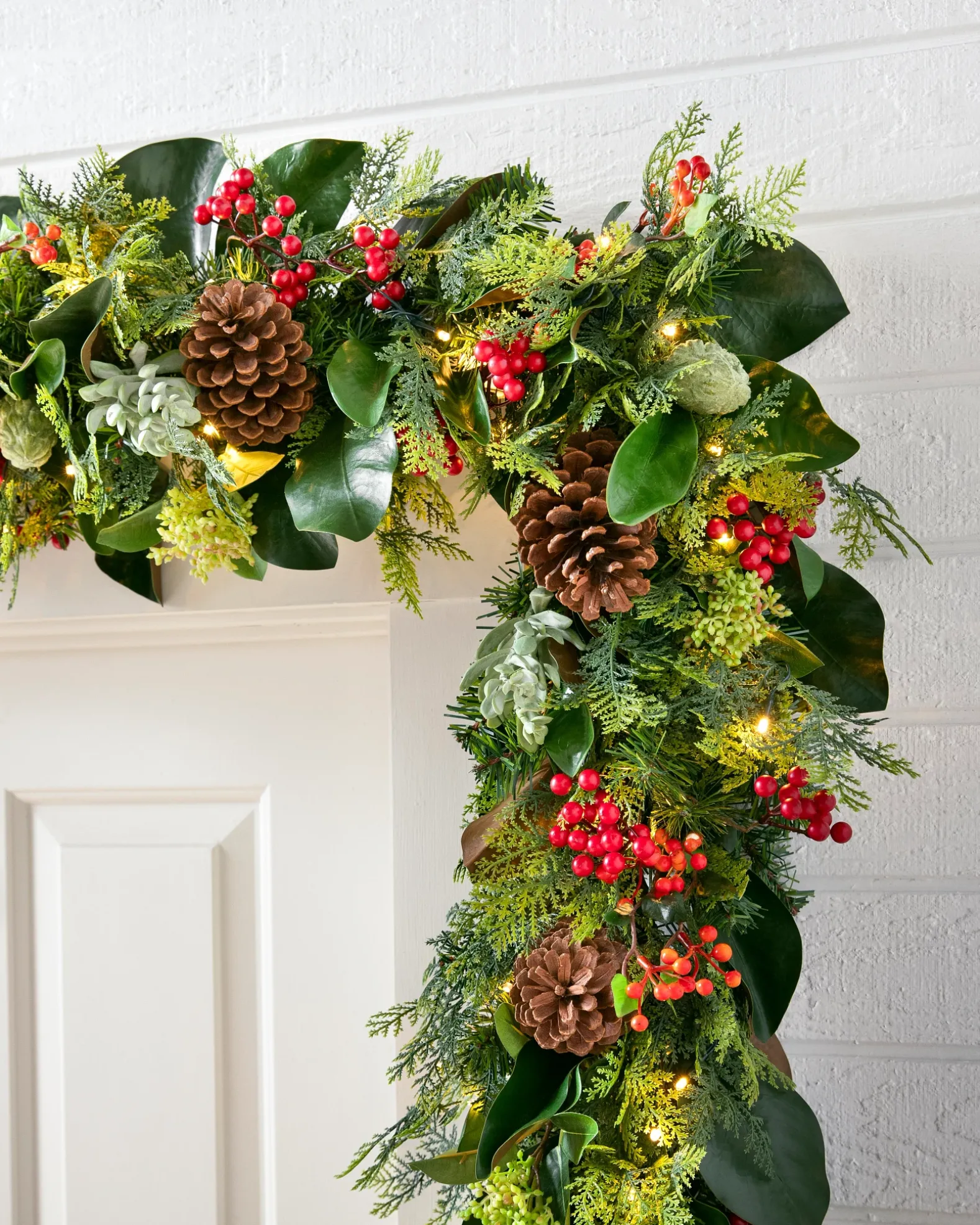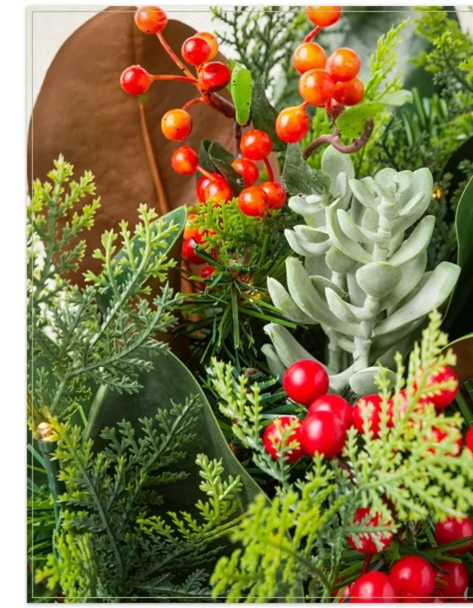 - All products in this collection feature pine foliage mixed with lifelike magnolia leaves, accented with faux succulents, red berries, and natural pinecones.