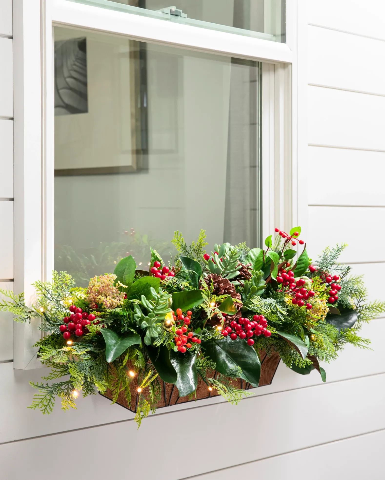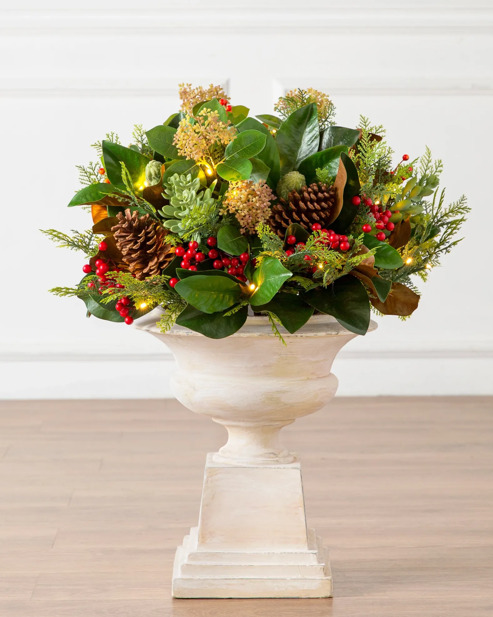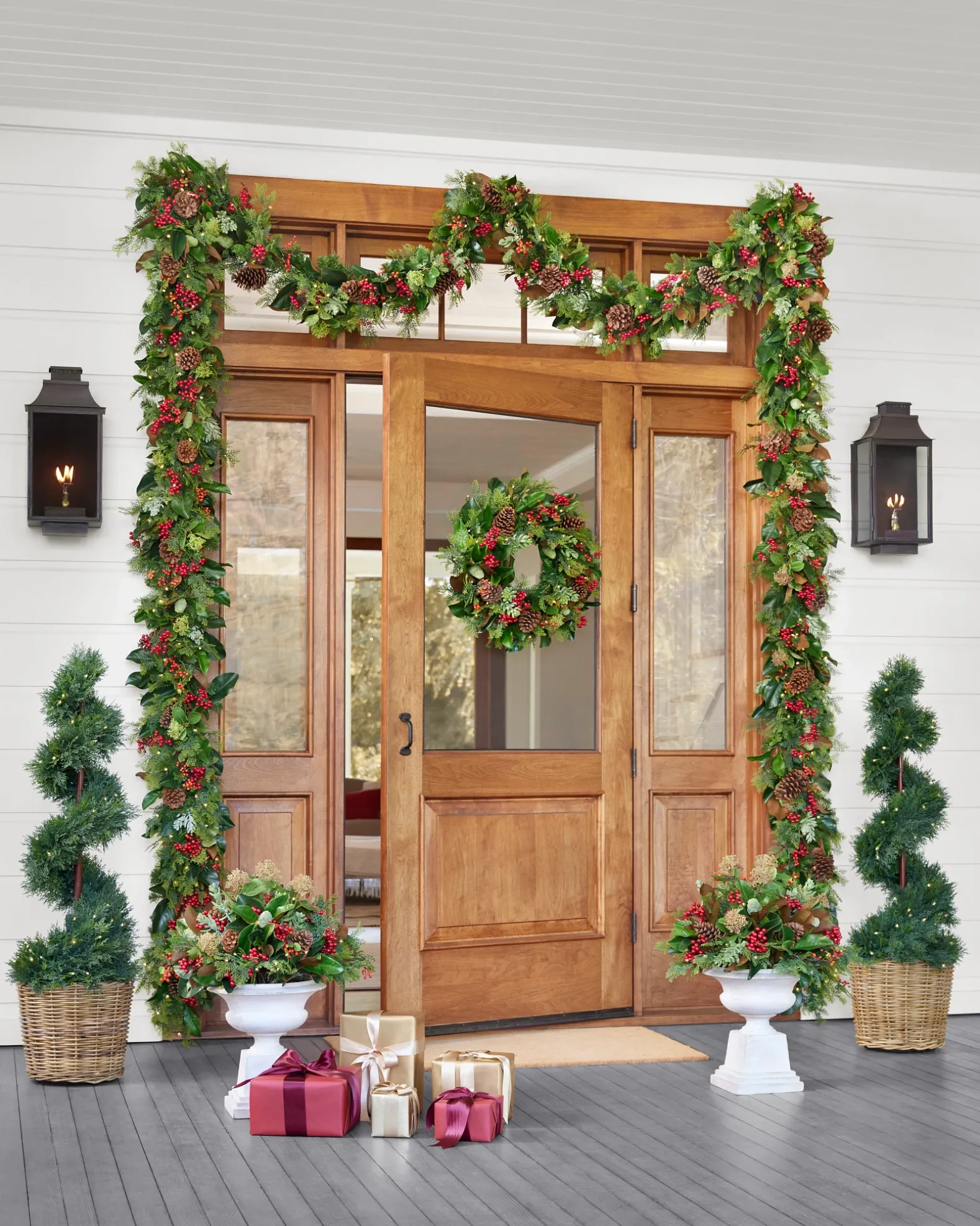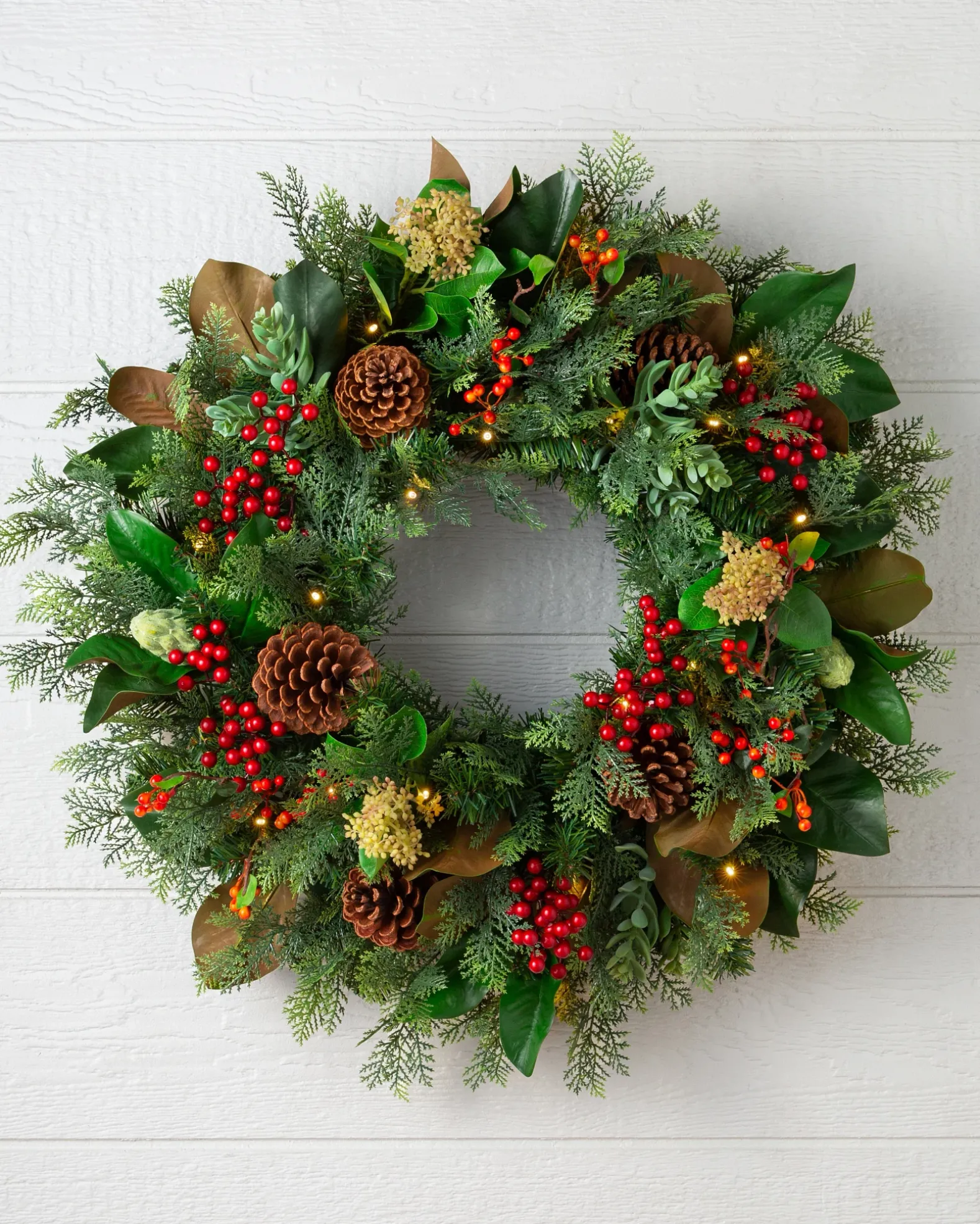 - All products in this collection feature pine foliage mixed with lifelike magnolia leaves, accented with faux succulents, red berries, and natural pinecones.