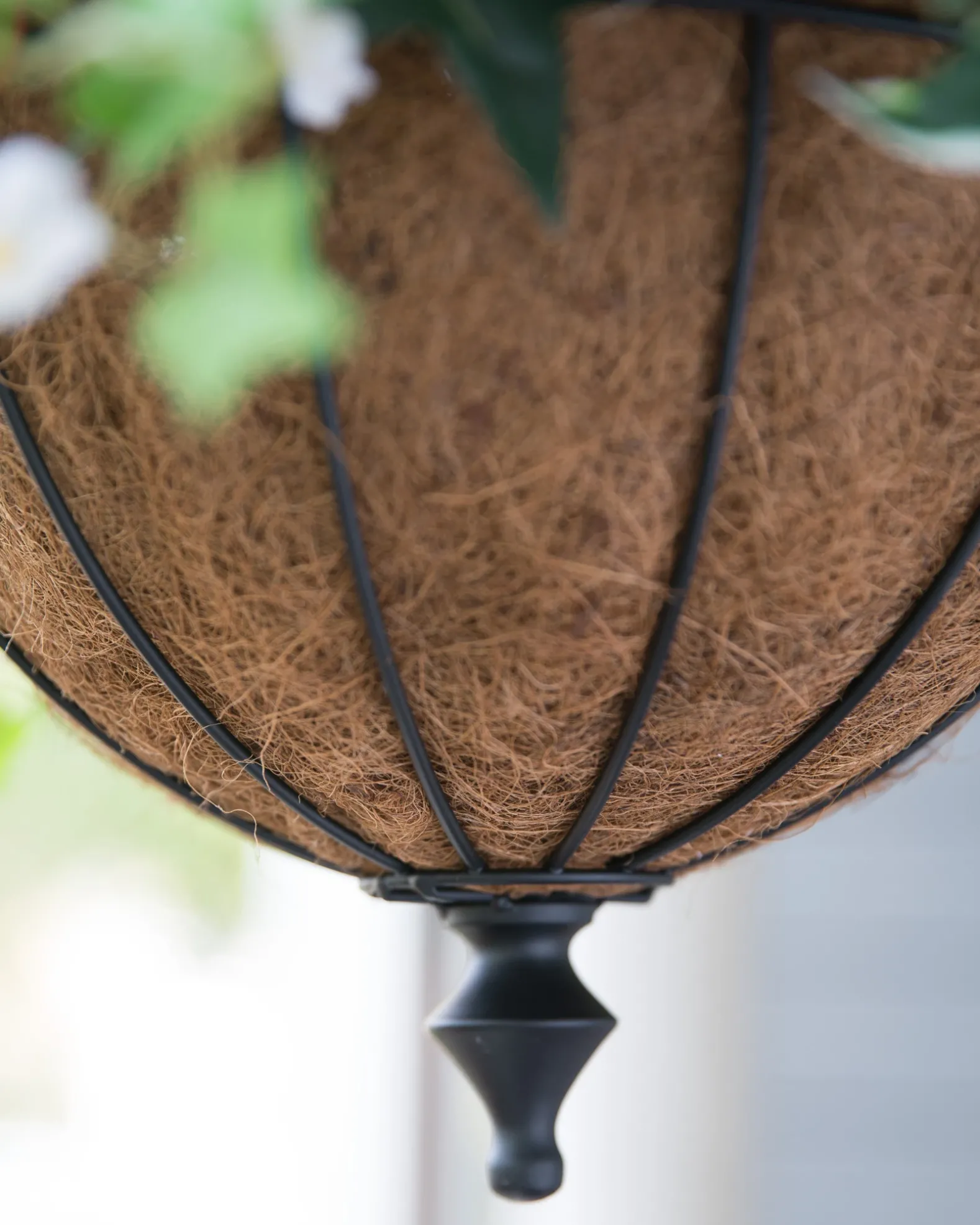 - Set with coconut fiber in a metal-framed carrier measuring 12″ in diameter x 9″ high