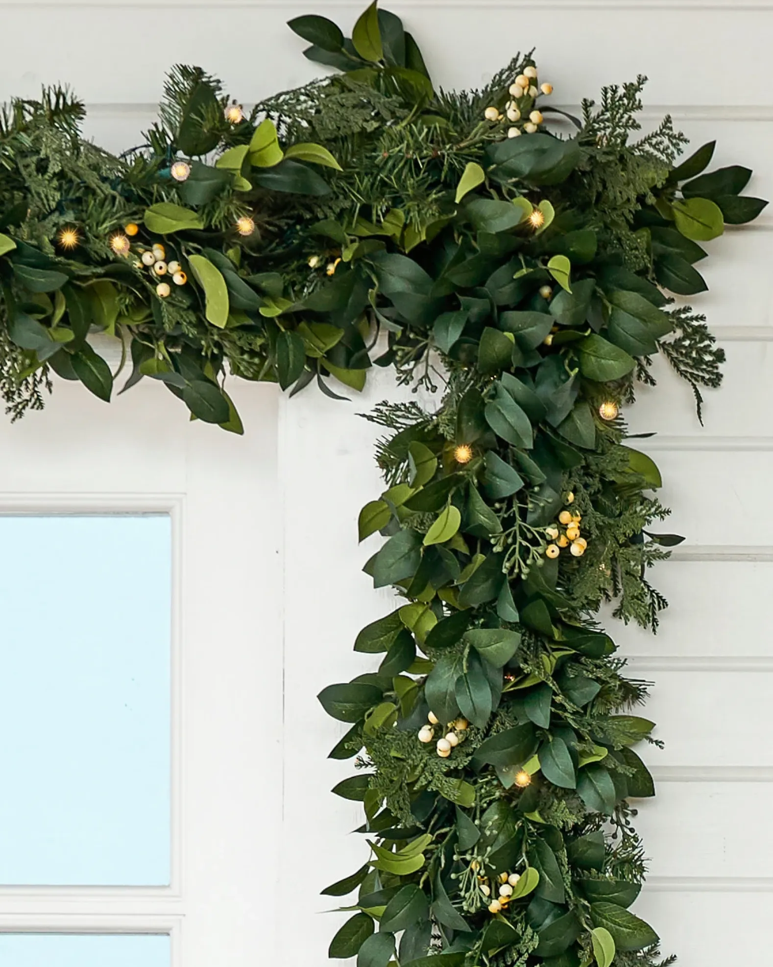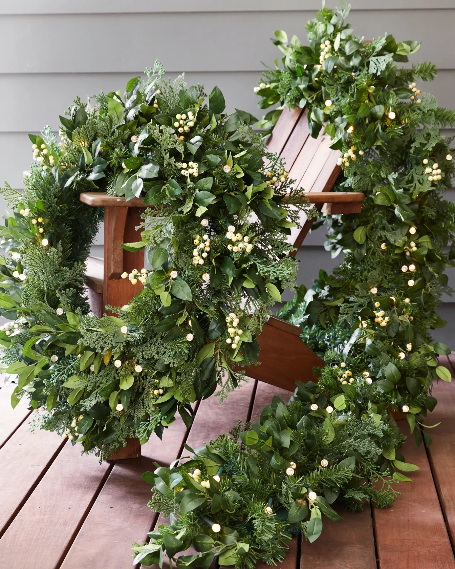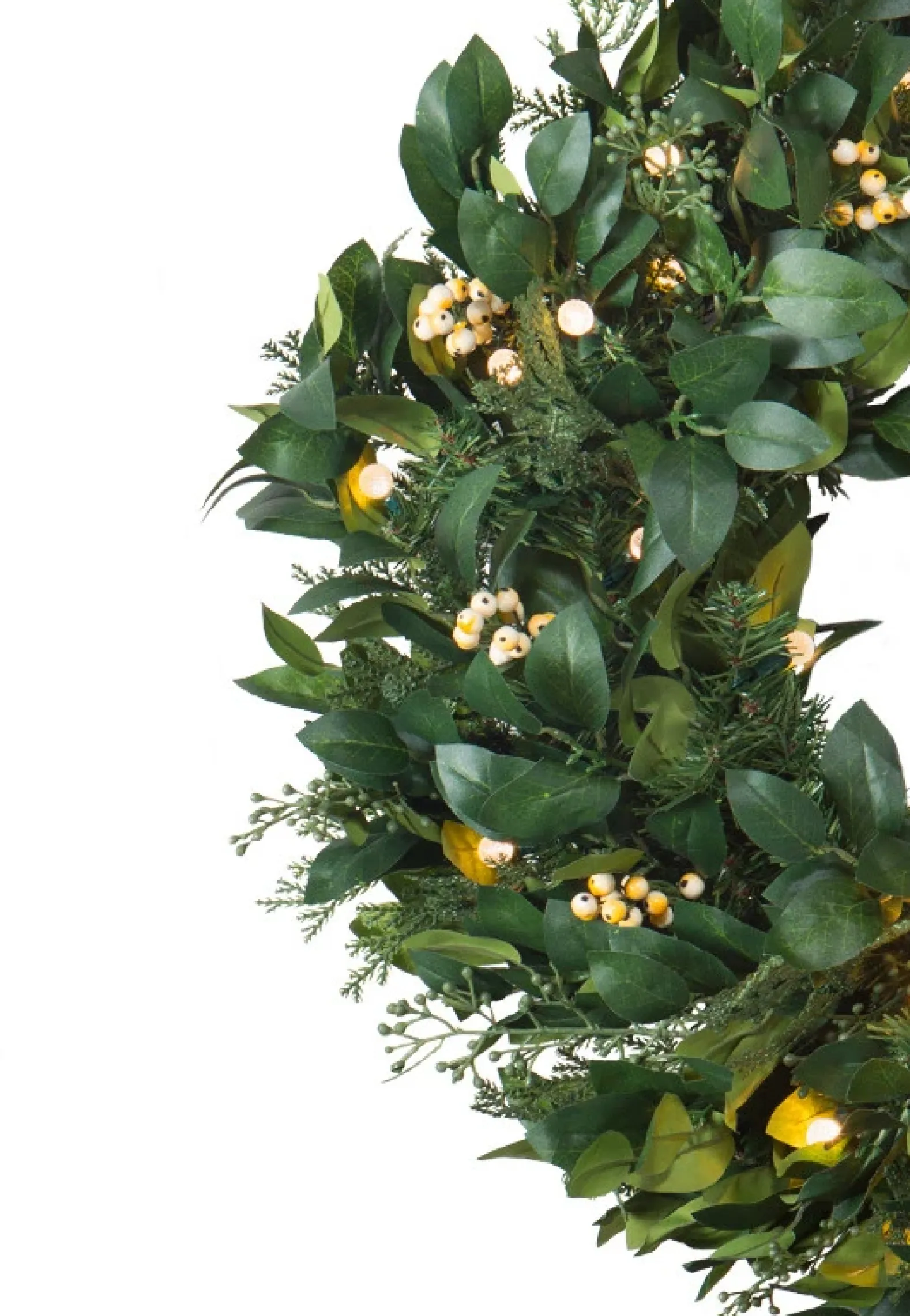 - All products in this collection feature an array of cedar, bay laurel, and cypress leaves accented with white berry sprays