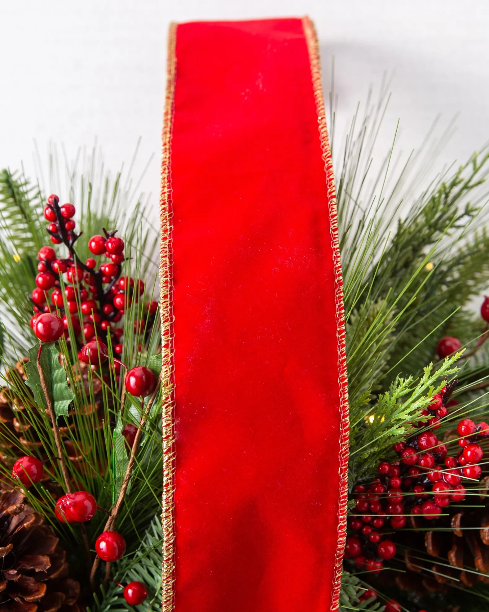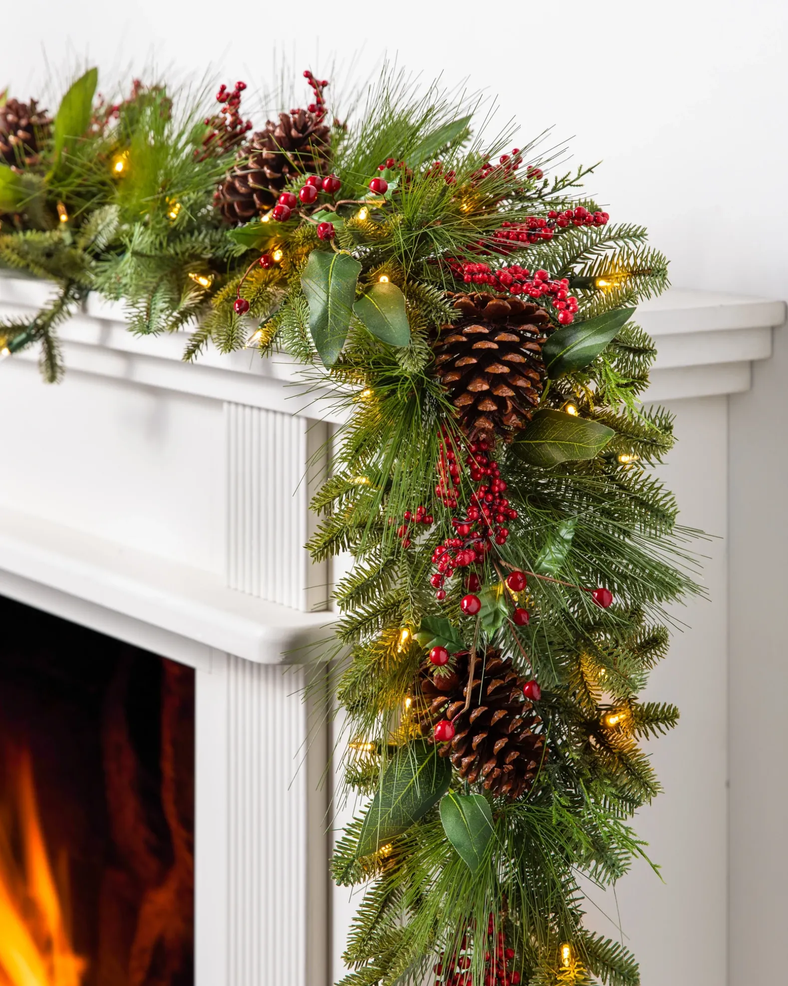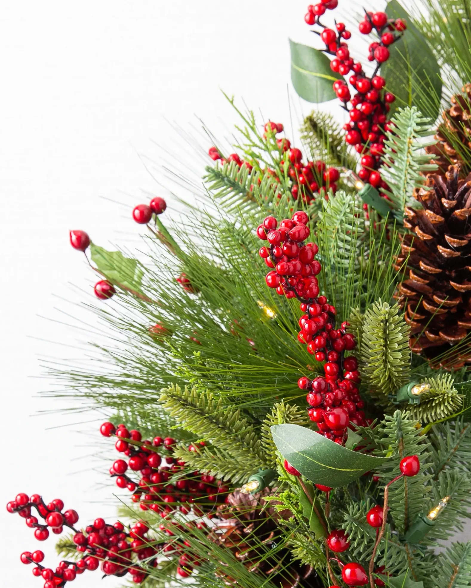 Create an ambience of countryside comfort with timeless Christmas colors. Vibrant evergreens with bright red berries and natural pinecones welcome the holidays with a touch of rustic charm.