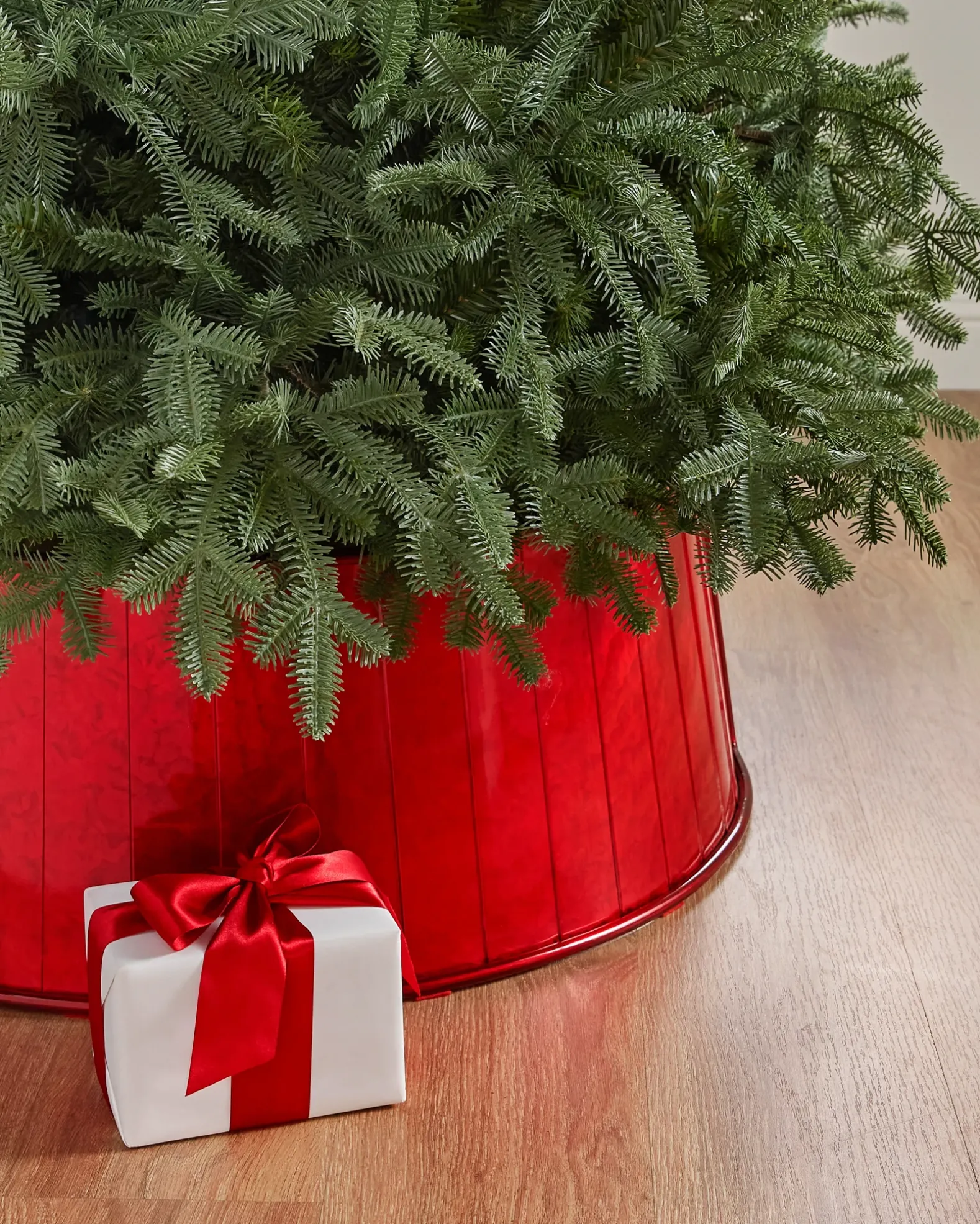 A unique alternative to traditional tree skirts, our tree collar is a bold statement piece that gives your display a brilliant pop of color. Features hinged pieces that wrap around your tree stand for easy set-up and storage.