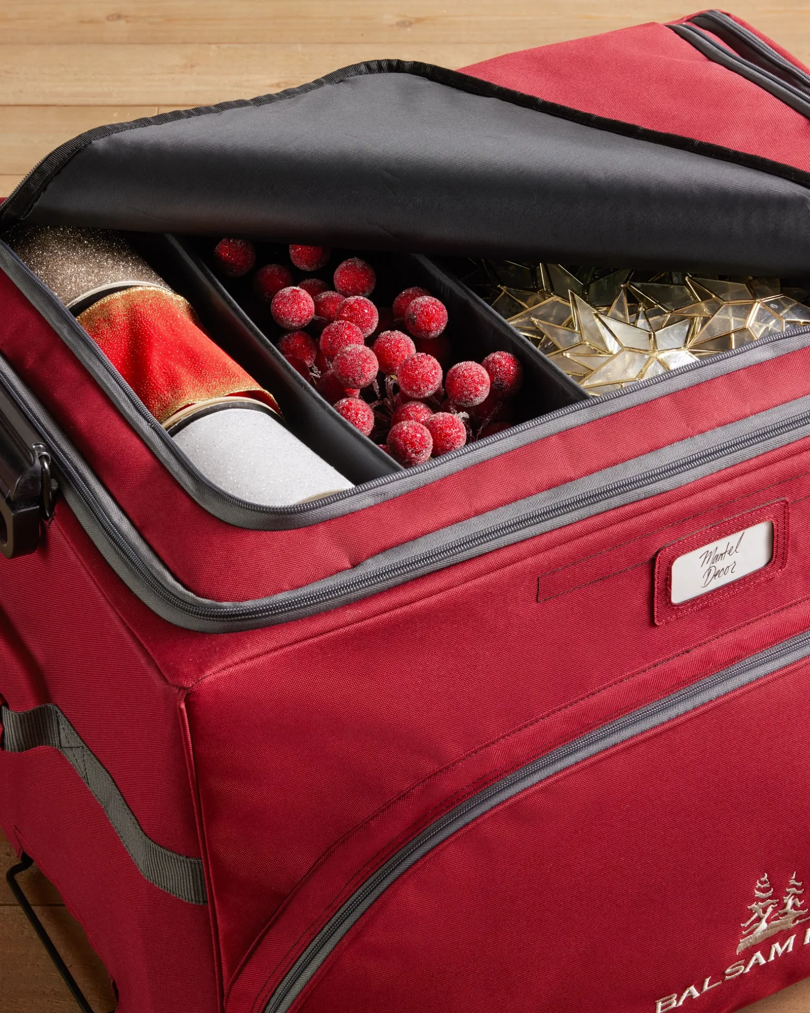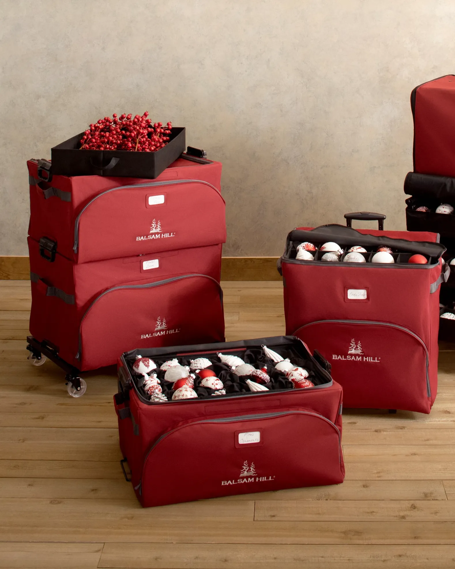 - Includes 3 stackable cases (Ornament Storage Case, Standard Storage Case, and Large Storage Case) and 1 rolling base