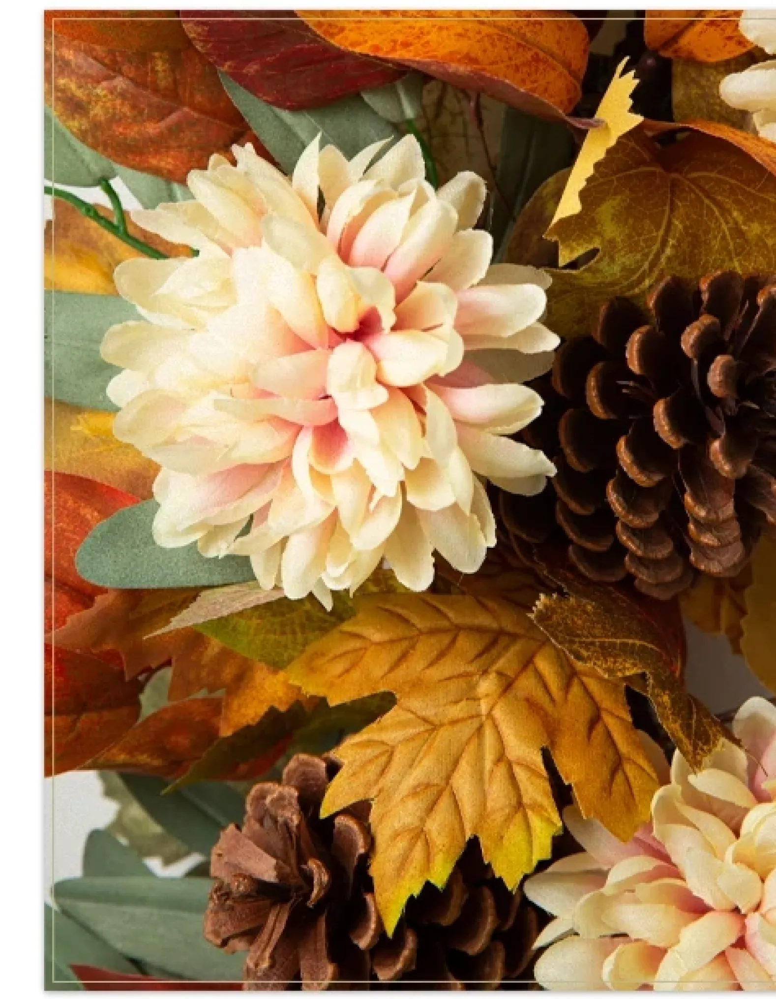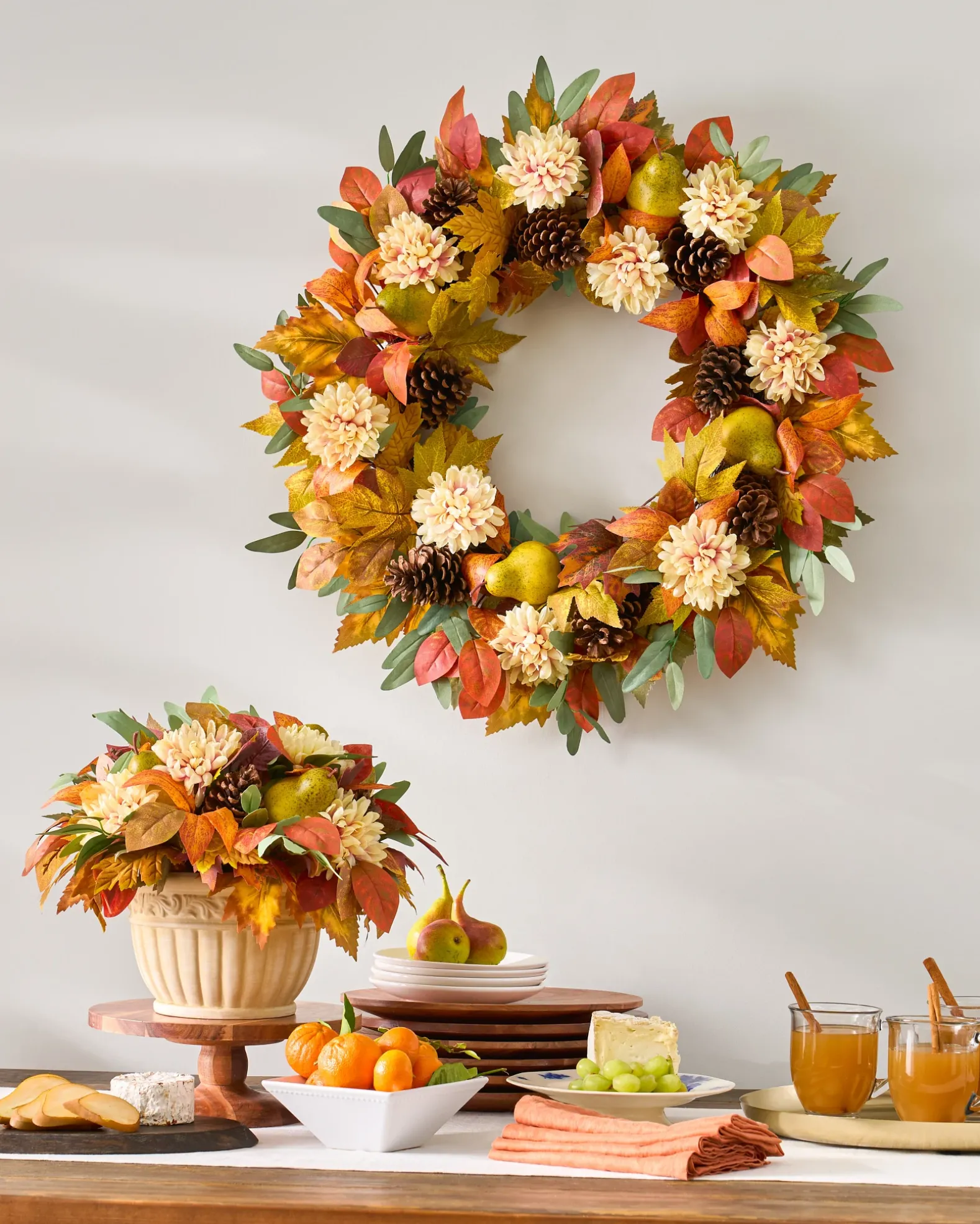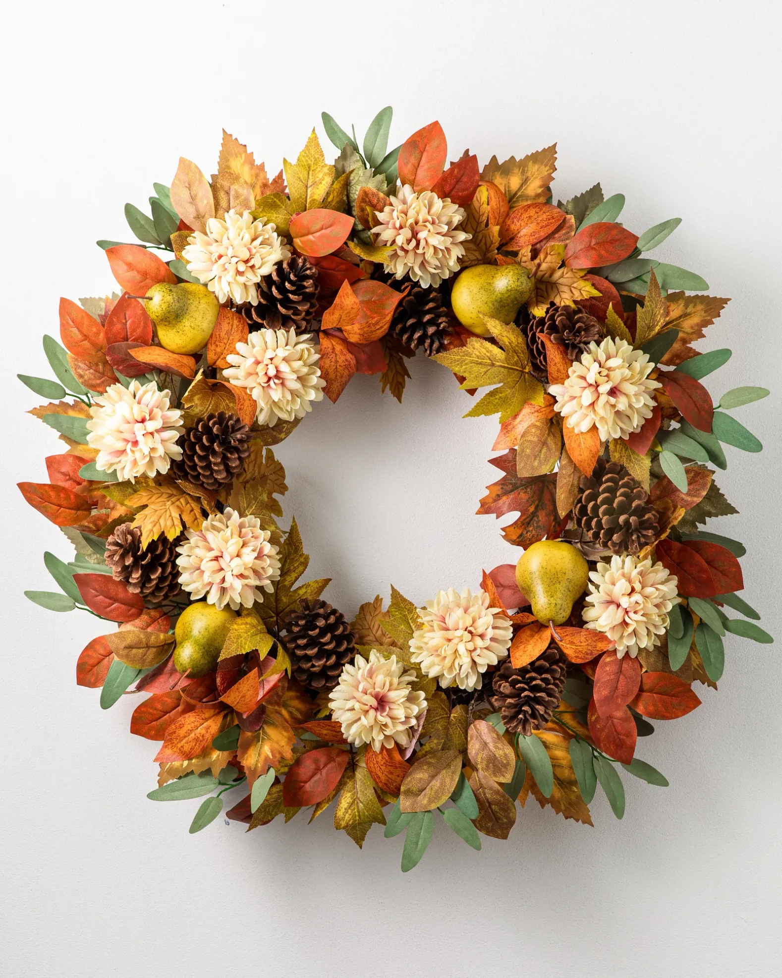 - All products in this collection feature faux pears, pinecones, ivory dahlias, oak, vine maple, beech, and eucalyptus leaves