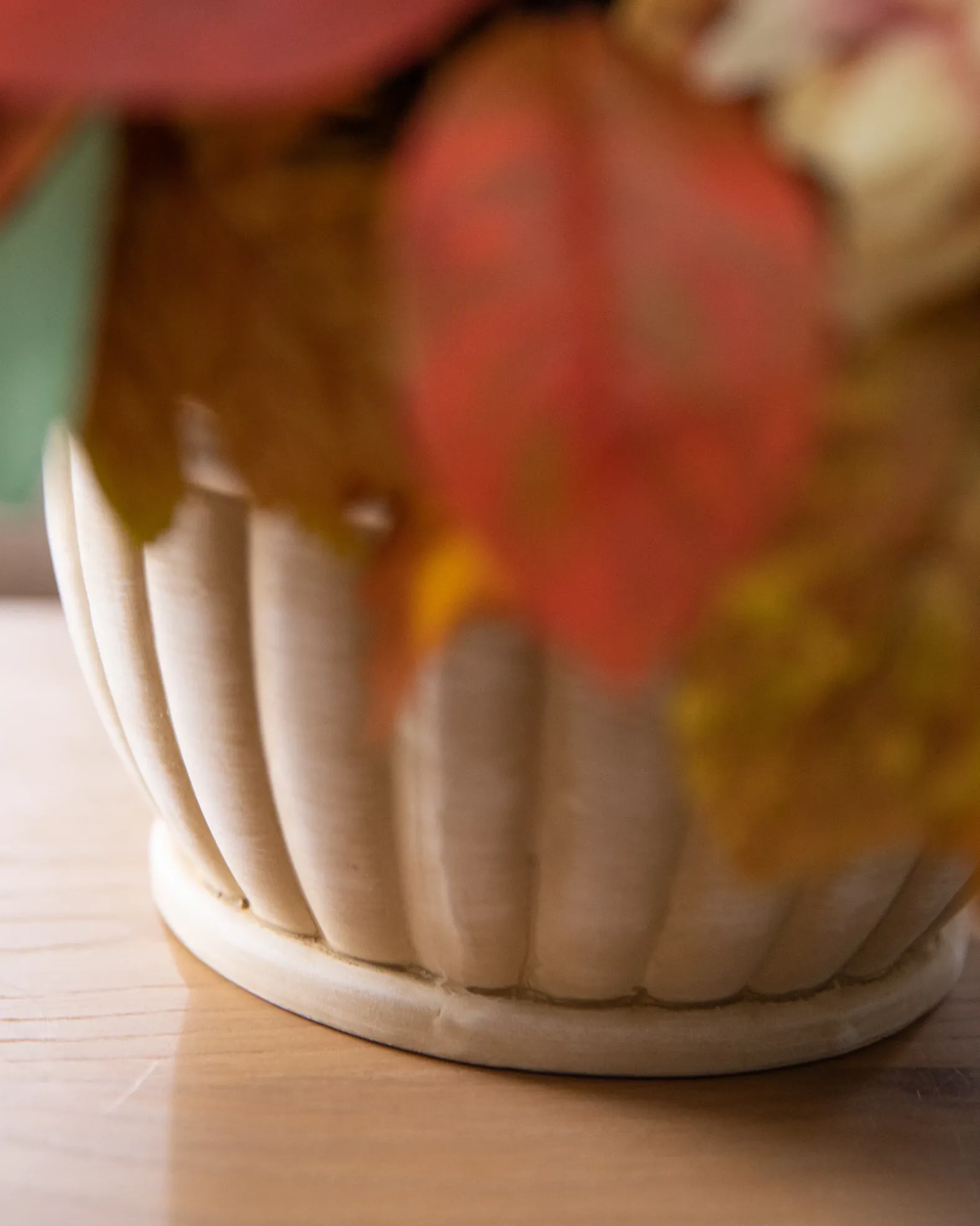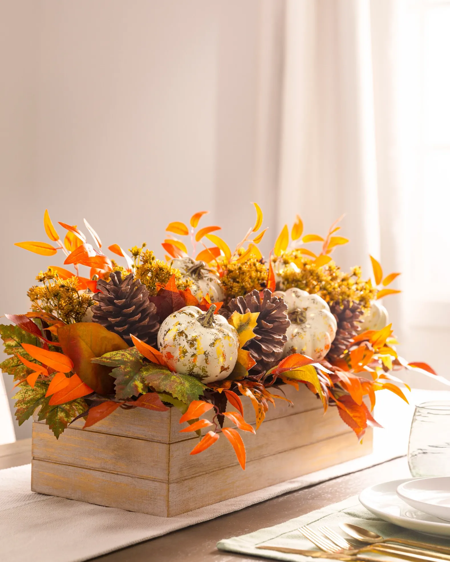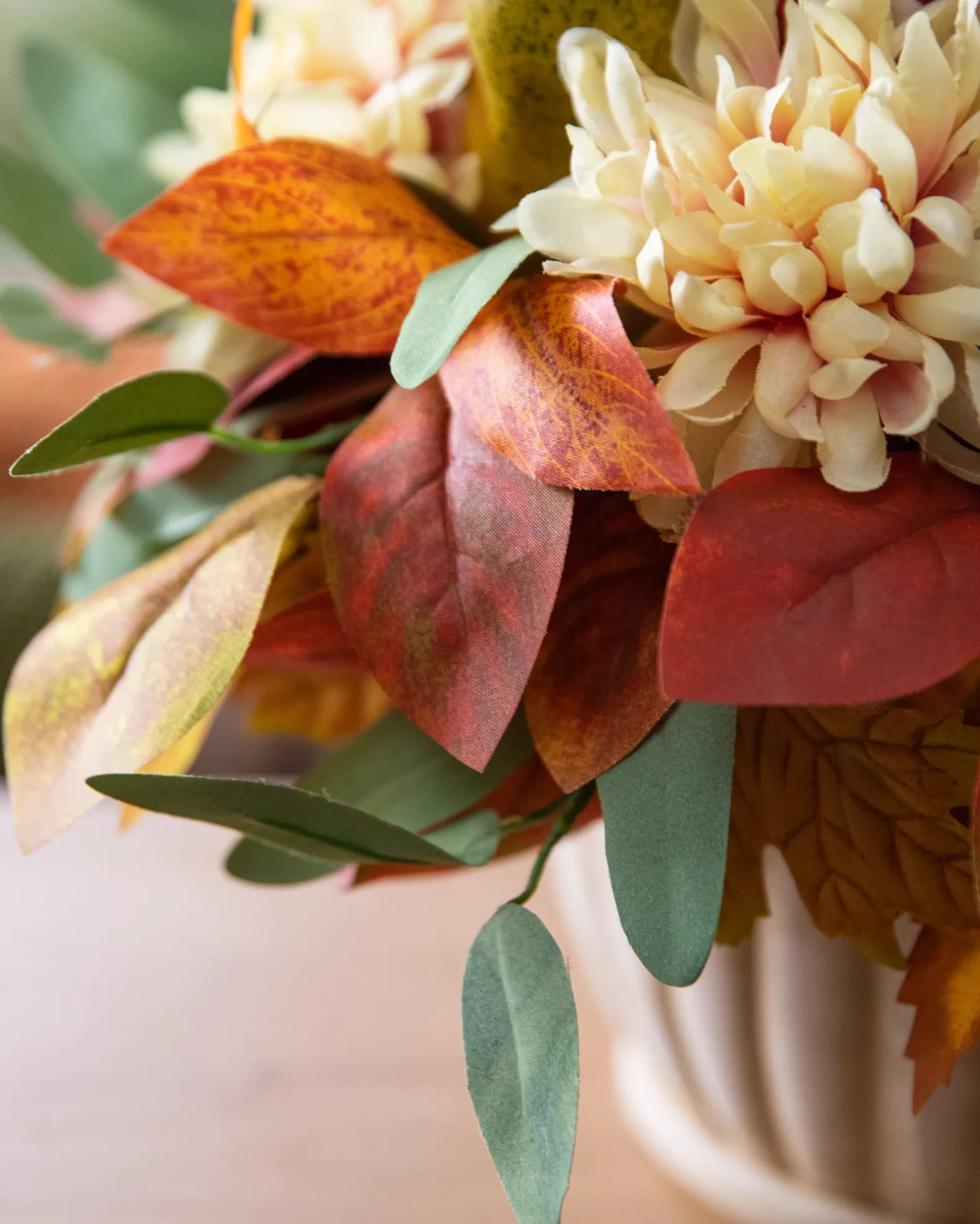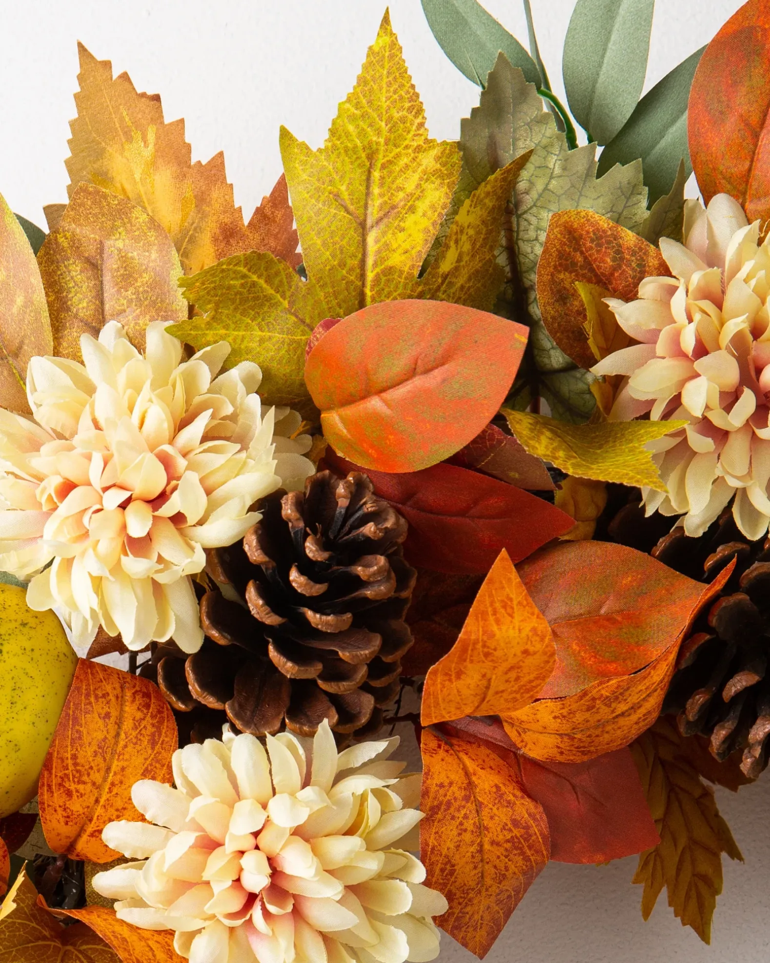 - All products in this collection feature faux pears, pinecones, ivory dahlias, oak, vine maple, beech, and eucalyptus leaves