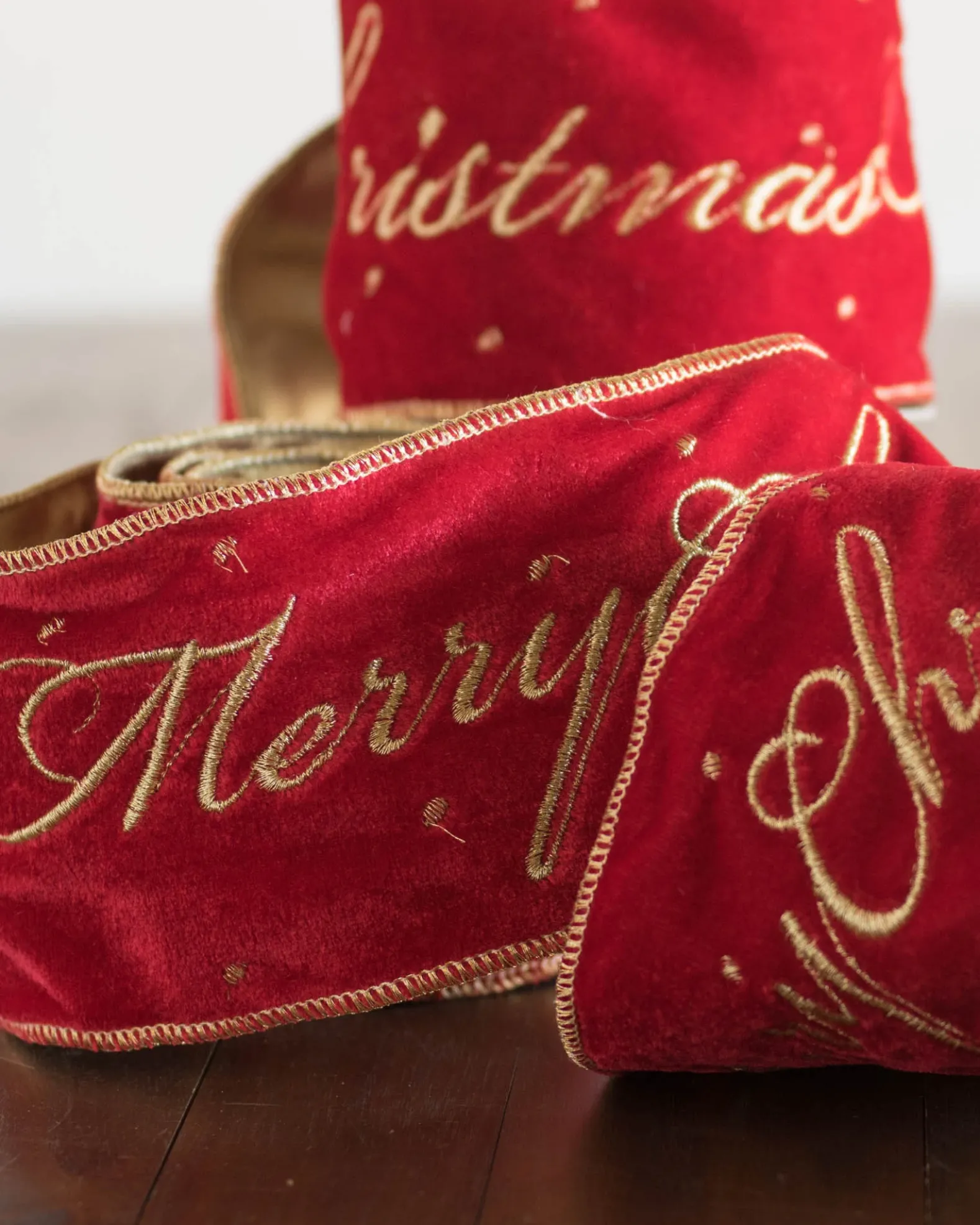 Express your warmest holiday wishes with an embroidered message. Red velvet with gold stitching adds a luxurious flourish to your Christmas tree and gift wrapping.