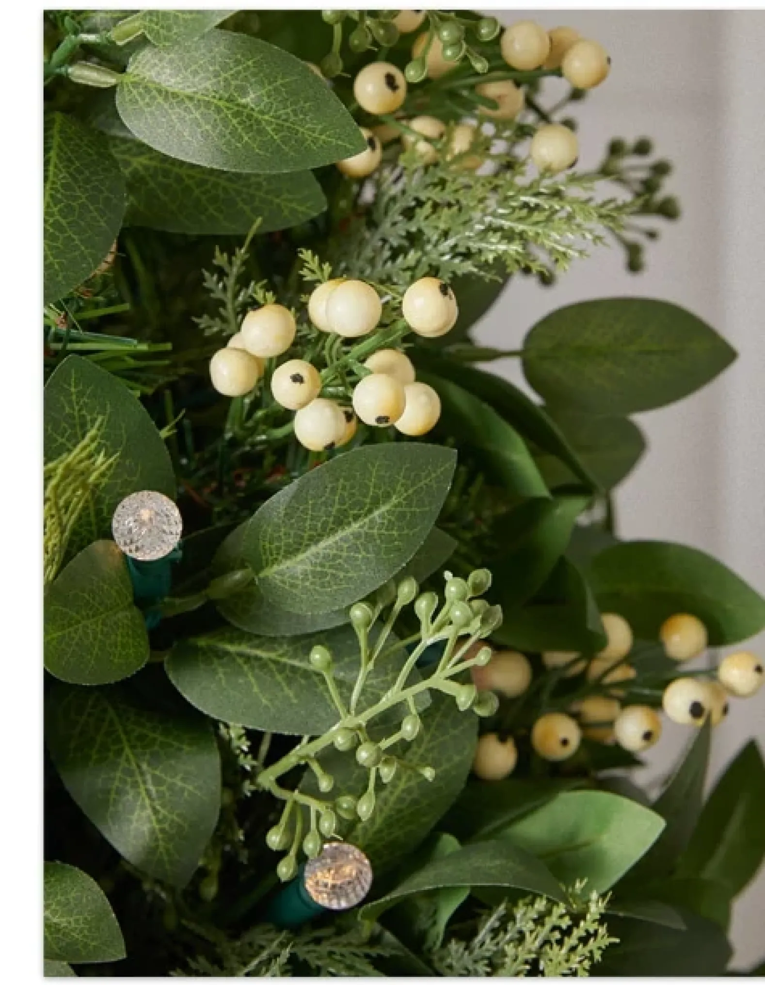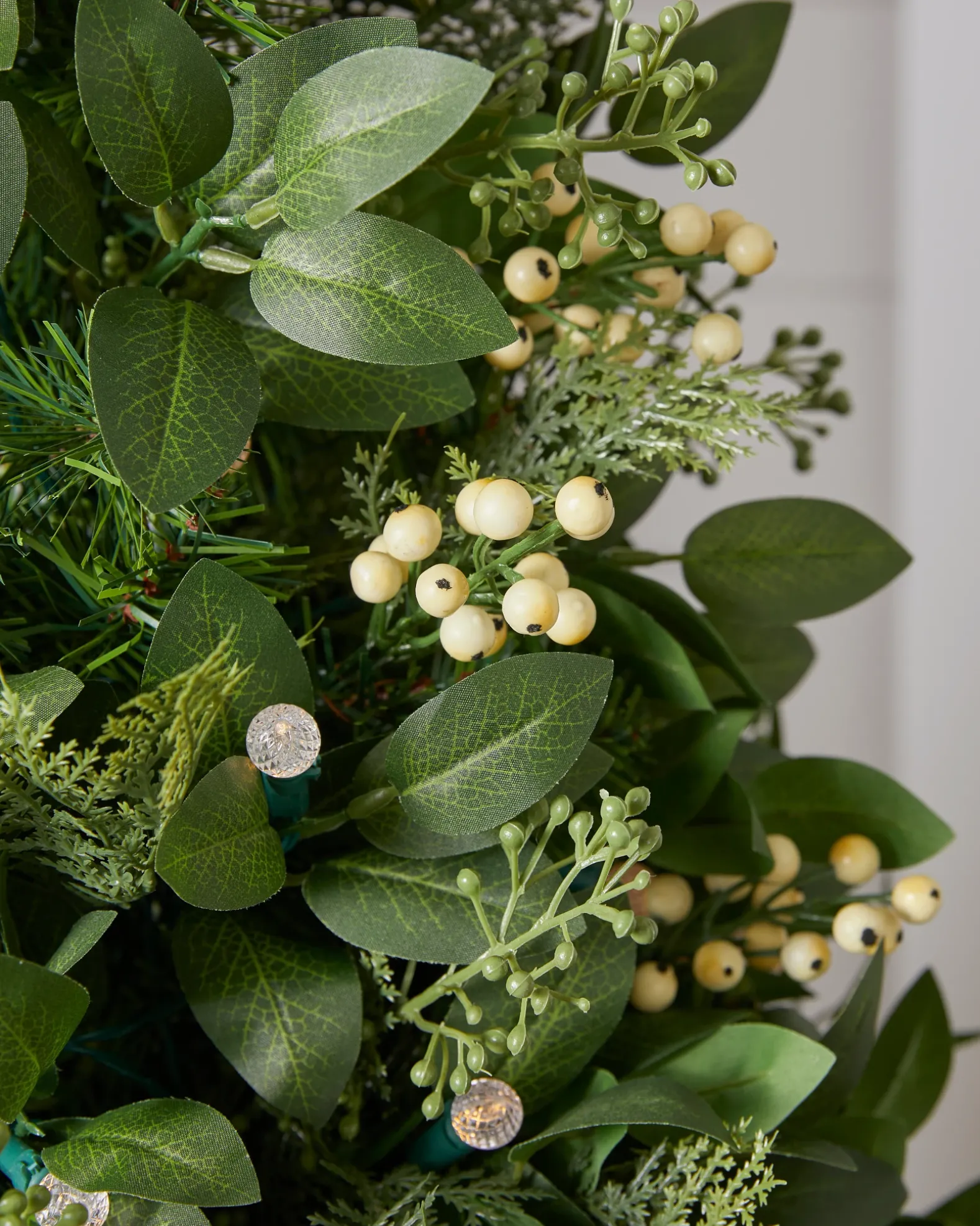 Create a versatile display that transcends all seasons. Lush greenery with white berry accents and LED globe lights bring minimalist elegance to your spaces.