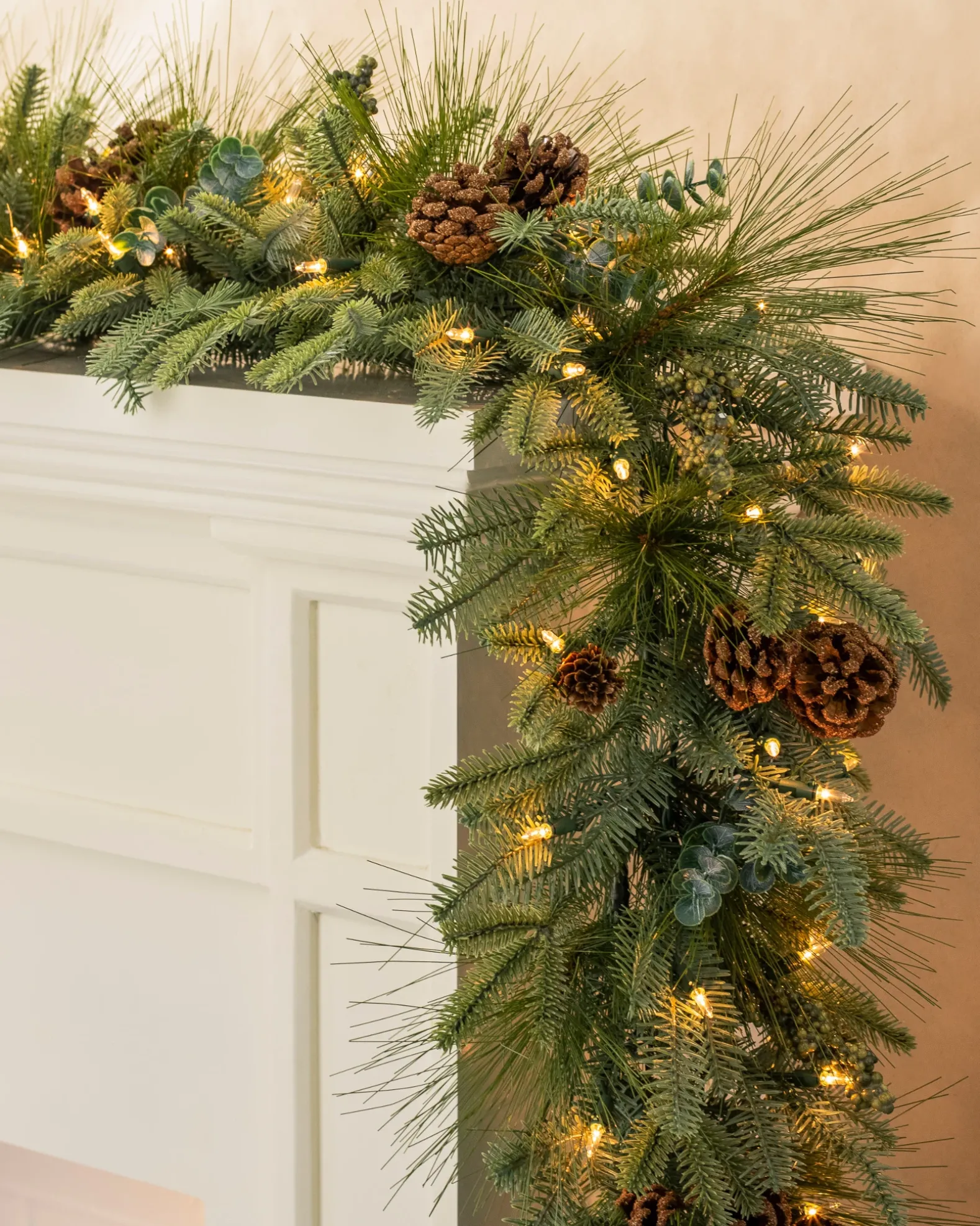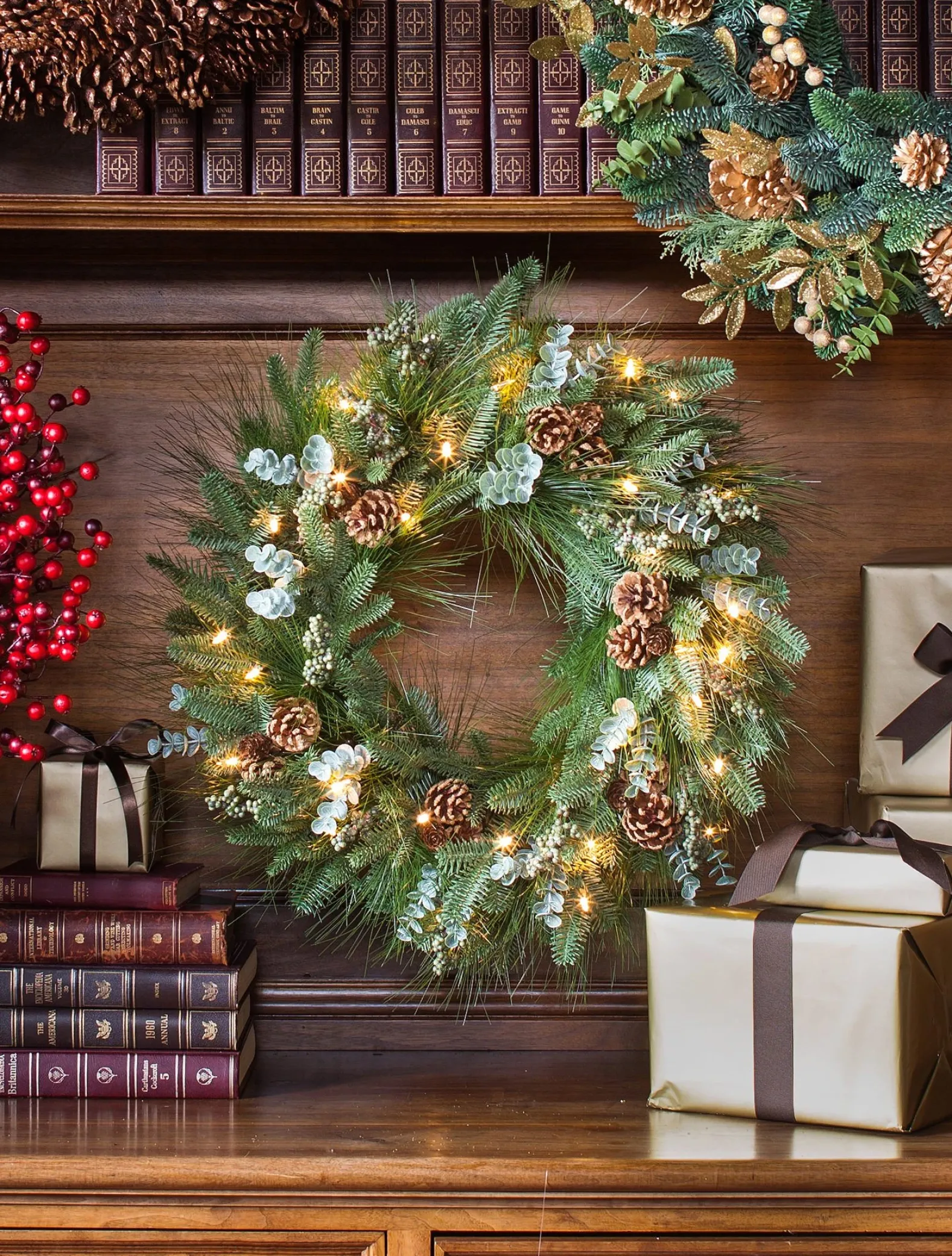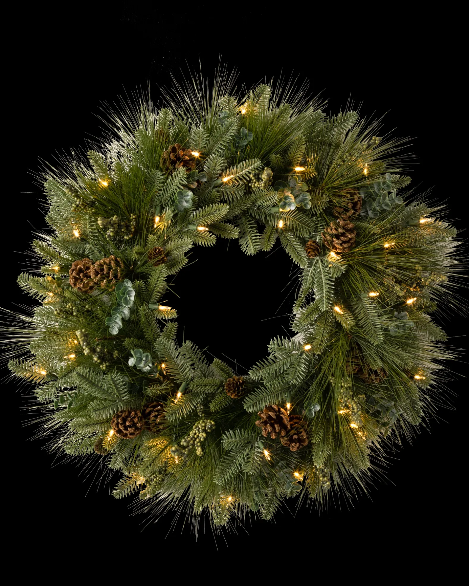 - All products in this collection features a realistic blend of premium BH Balsam Fir® and BH Fraser Fir® tips, crafted with True Needle® foliage adorned with dusted pinecones, silvery eucalyptus leaves, and berries.