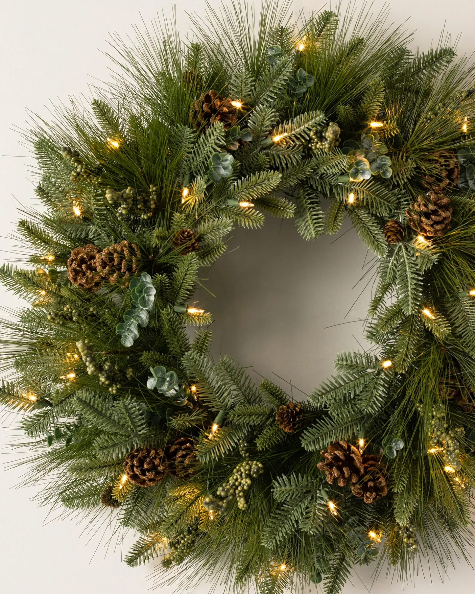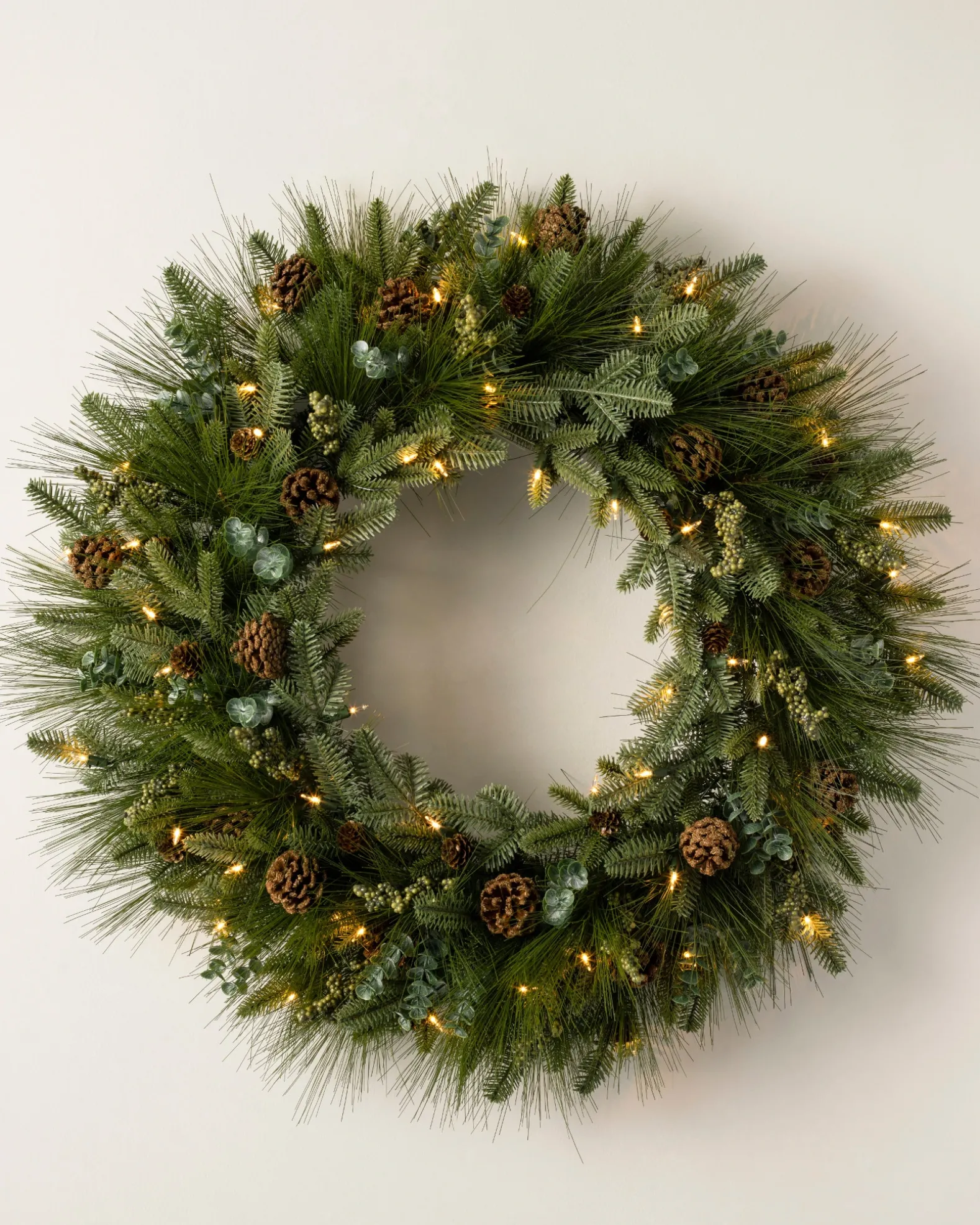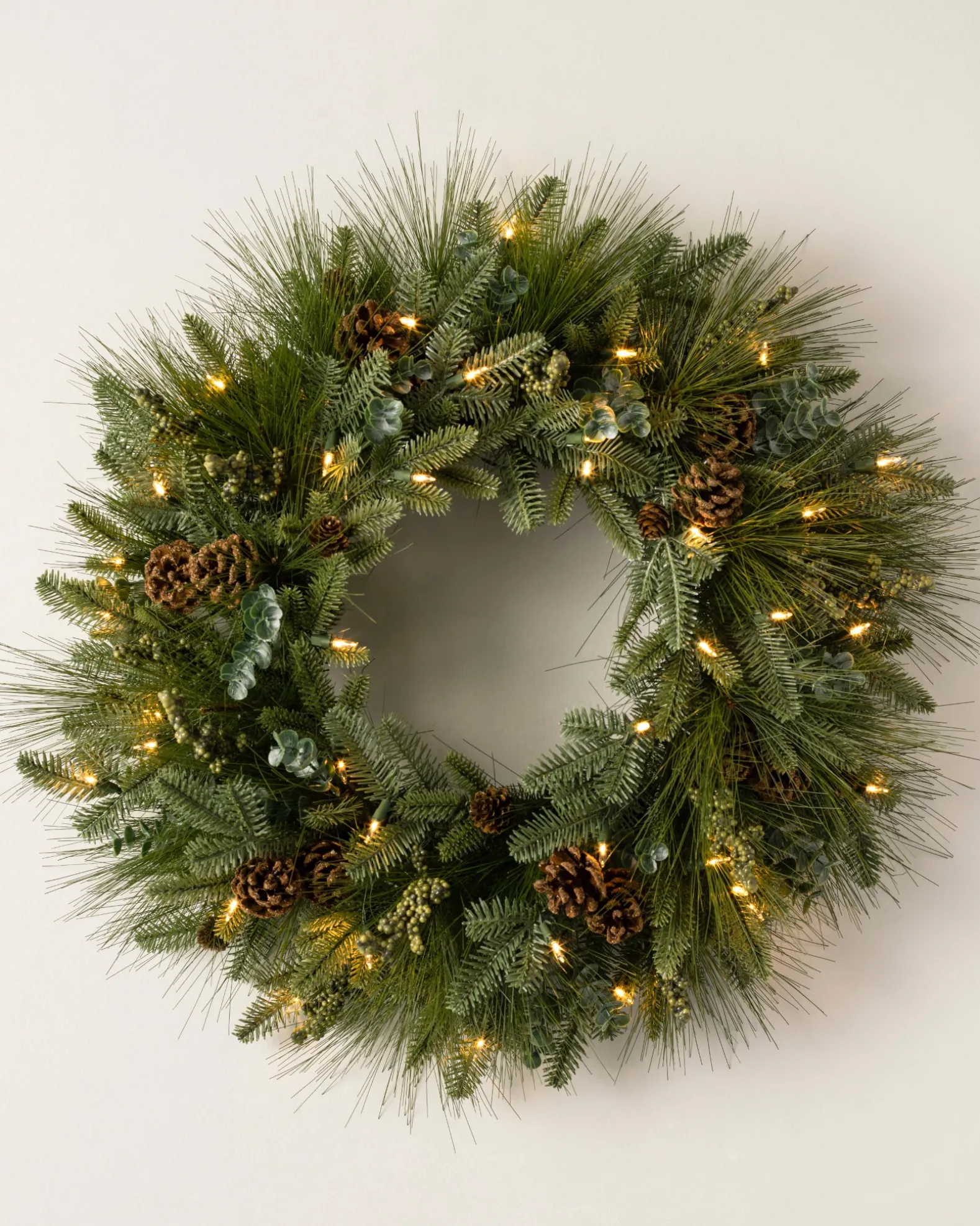 - All products in this collection features a realistic blend of premium BH Balsam Fir® and BH Fraser Fir® tips, crafted with True Needle® foliage adorned with dusted pinecones, silvery eucalyptus leaves, and berries.